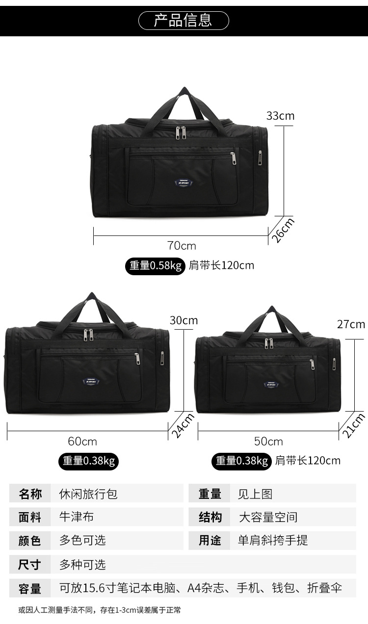 厂价批发大中小号旅行包,多色可选,温馨提示;拍图尺寸测量与实际尺寸有1-3厘米误差,图片打灯拍摄与实物有轻微色差,支持定制,大号长70宽26高33,中号长60宽24高30,小号长50宽21高27CM。