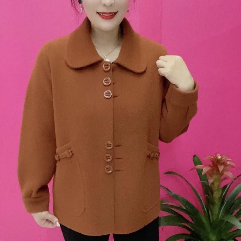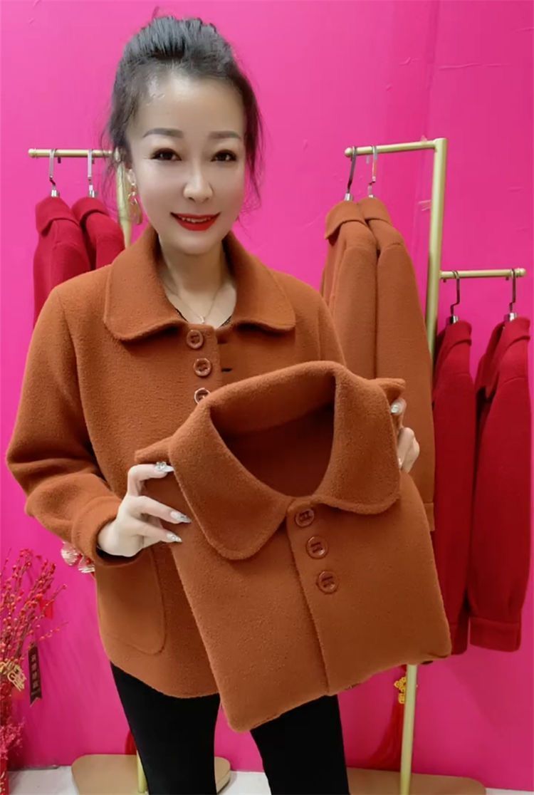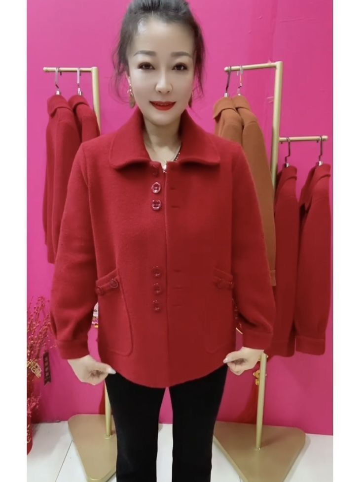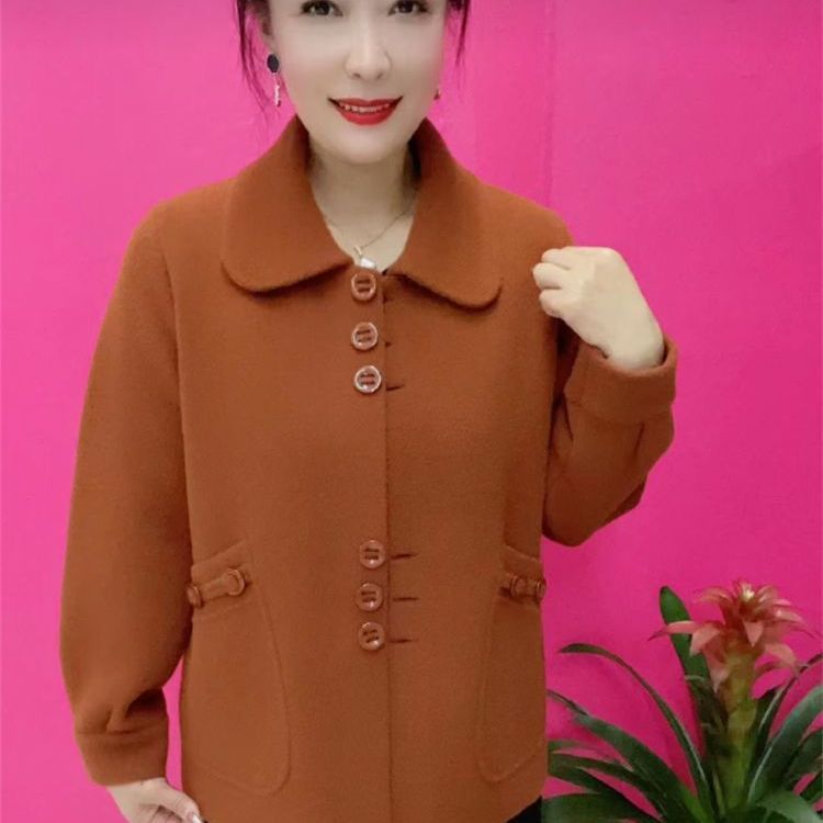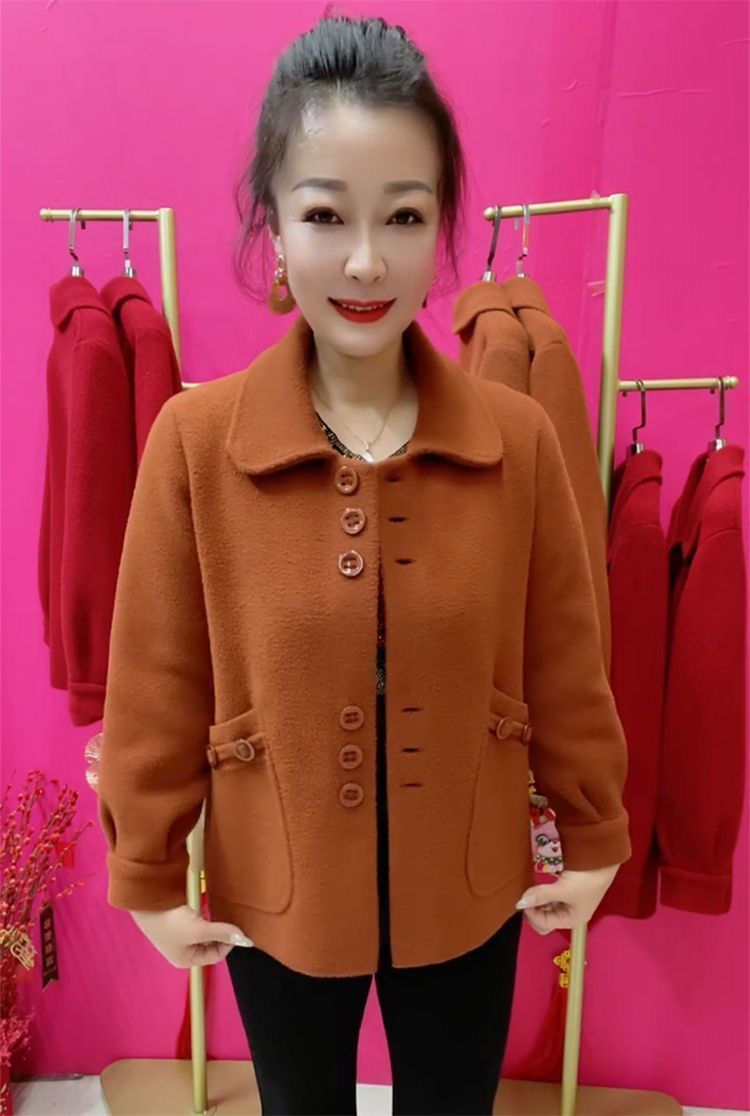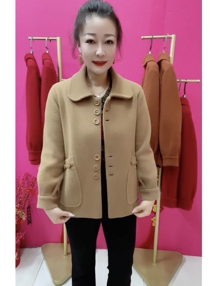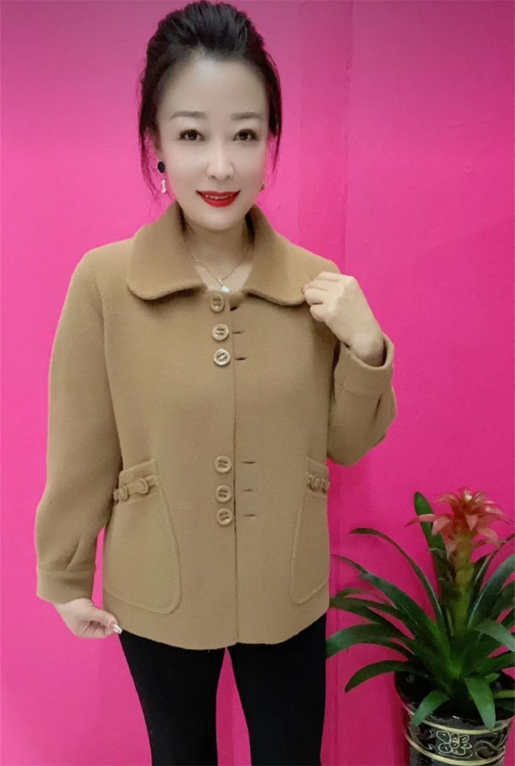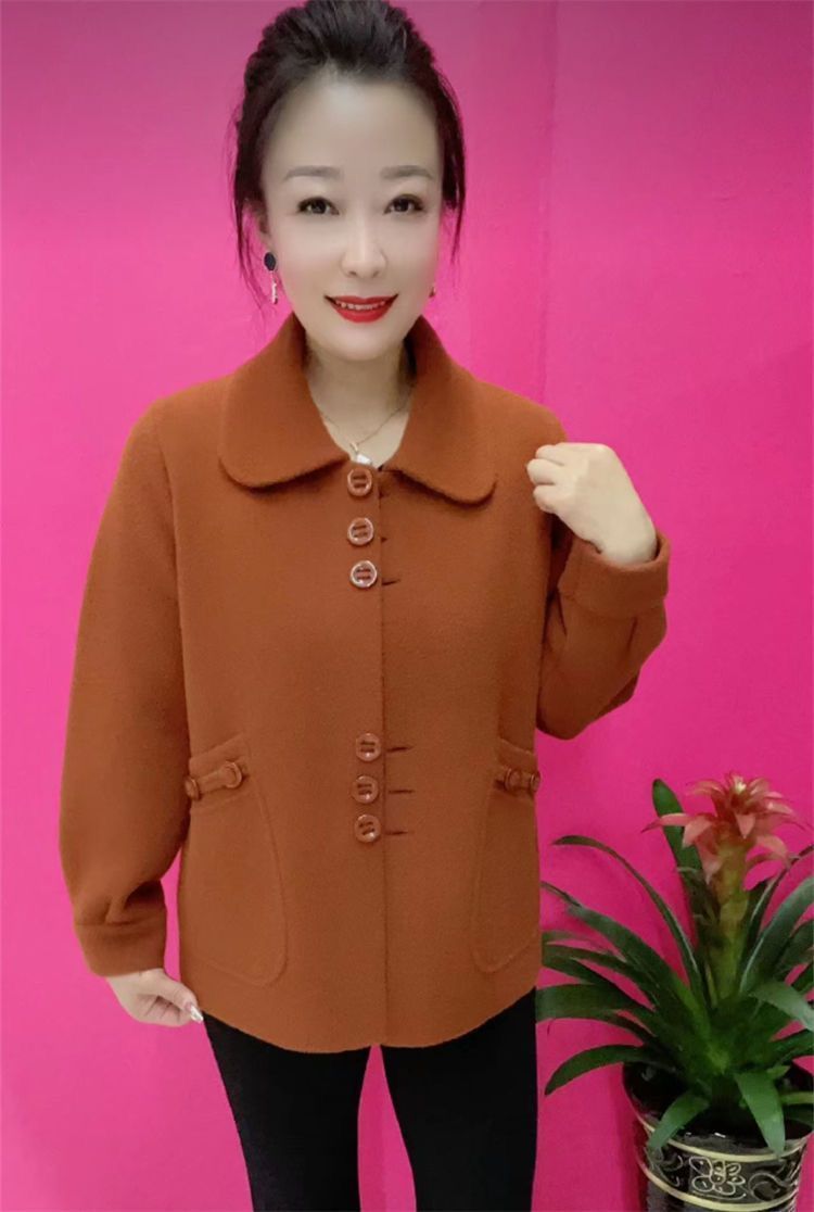 中老年妈妈装秋冬新款洋气纯色中短款宽松外套时尚开衫仿毛呢上衣