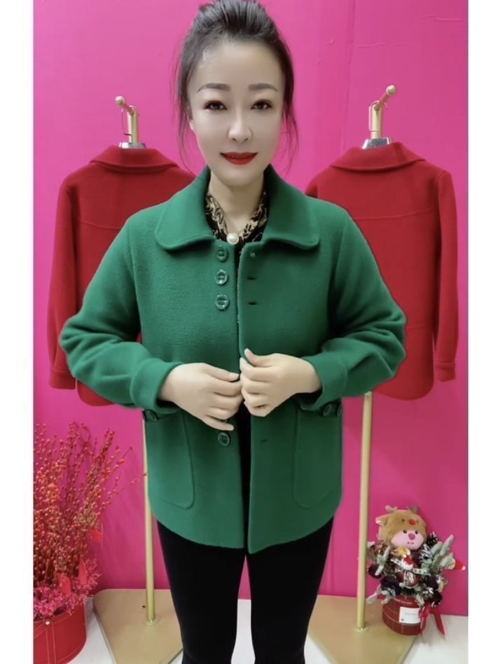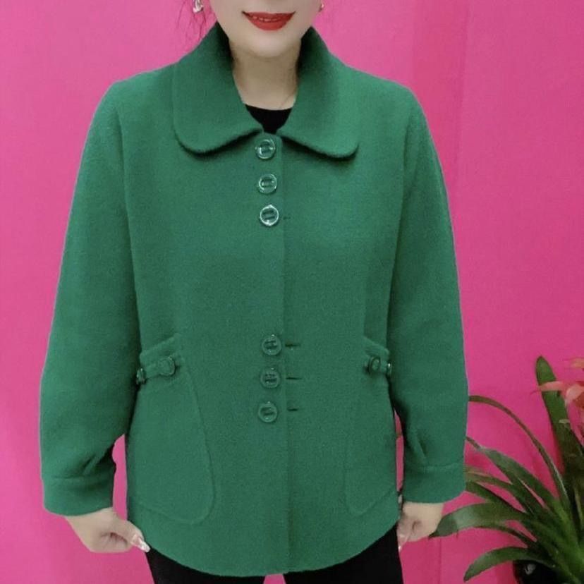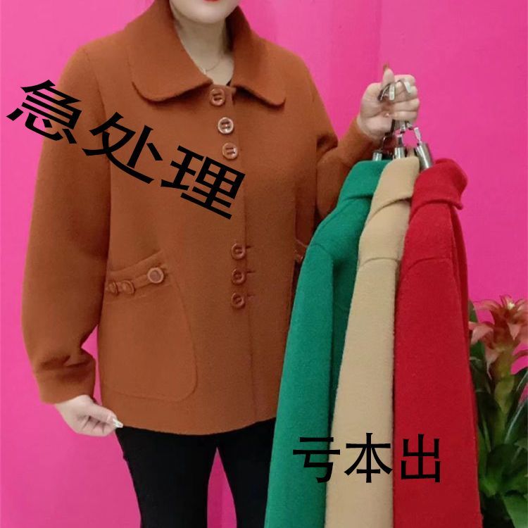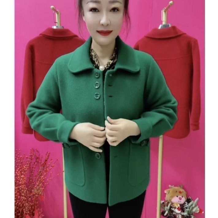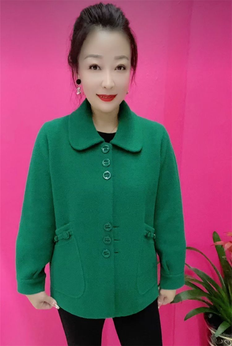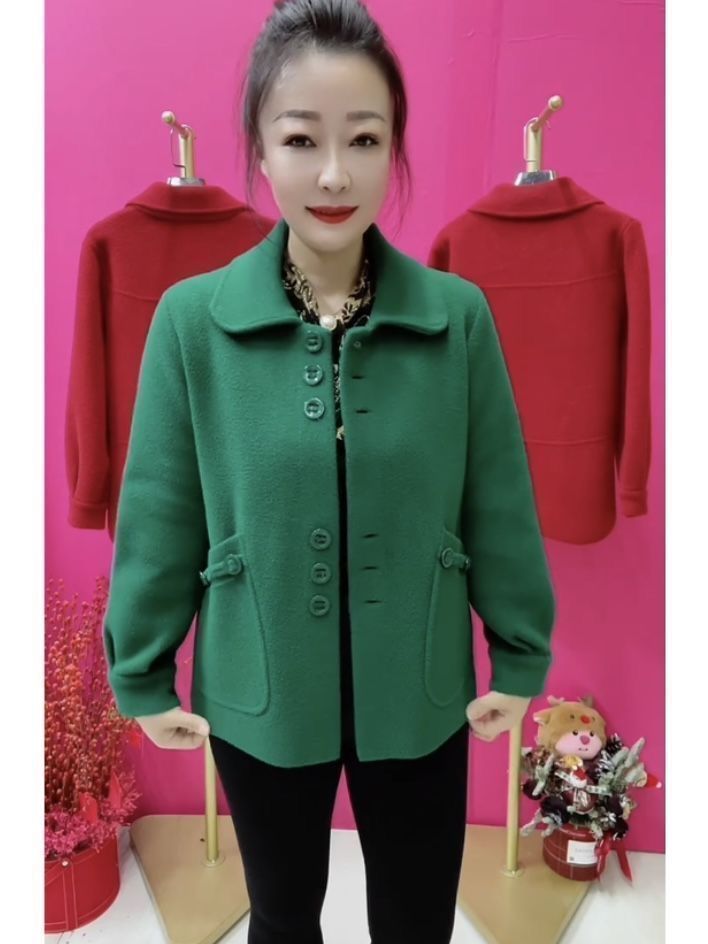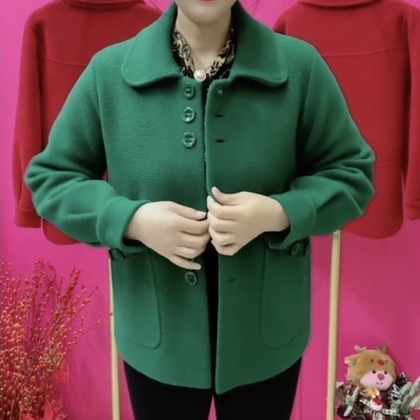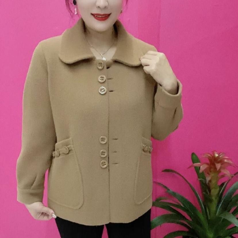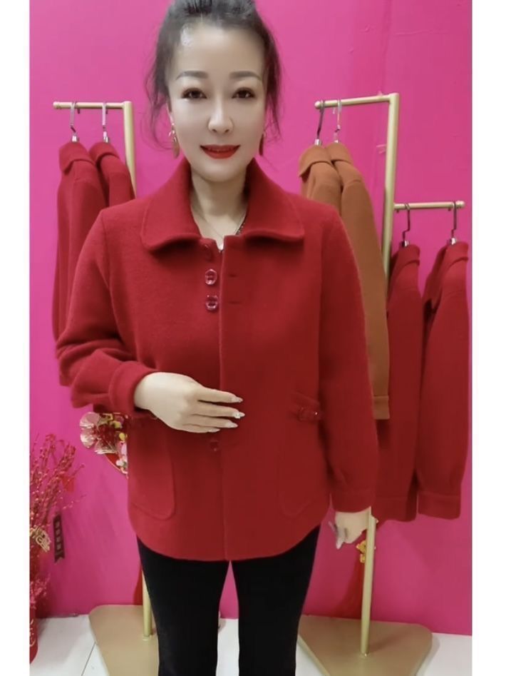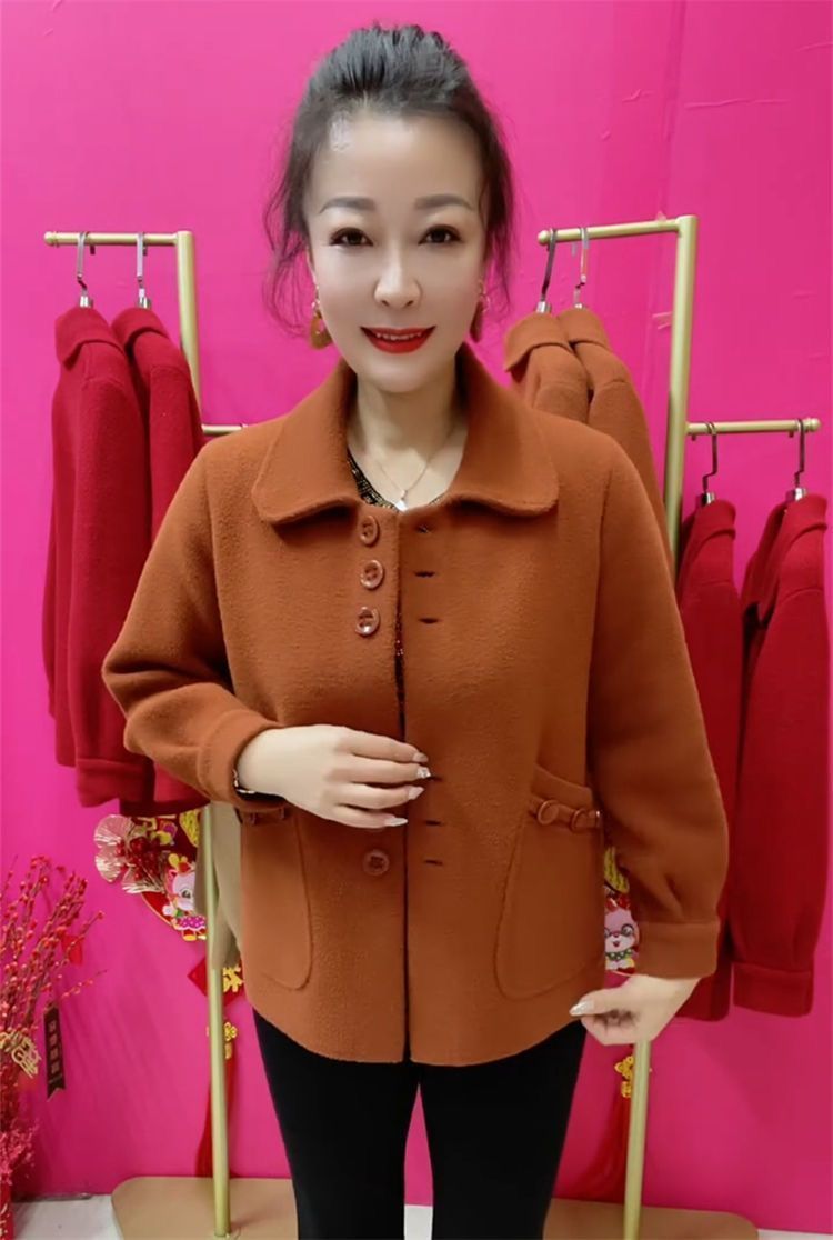 中老年妈妈装秋冬新款洋气纯色中短款宽松外套时尚开衫仿毛呢上衣