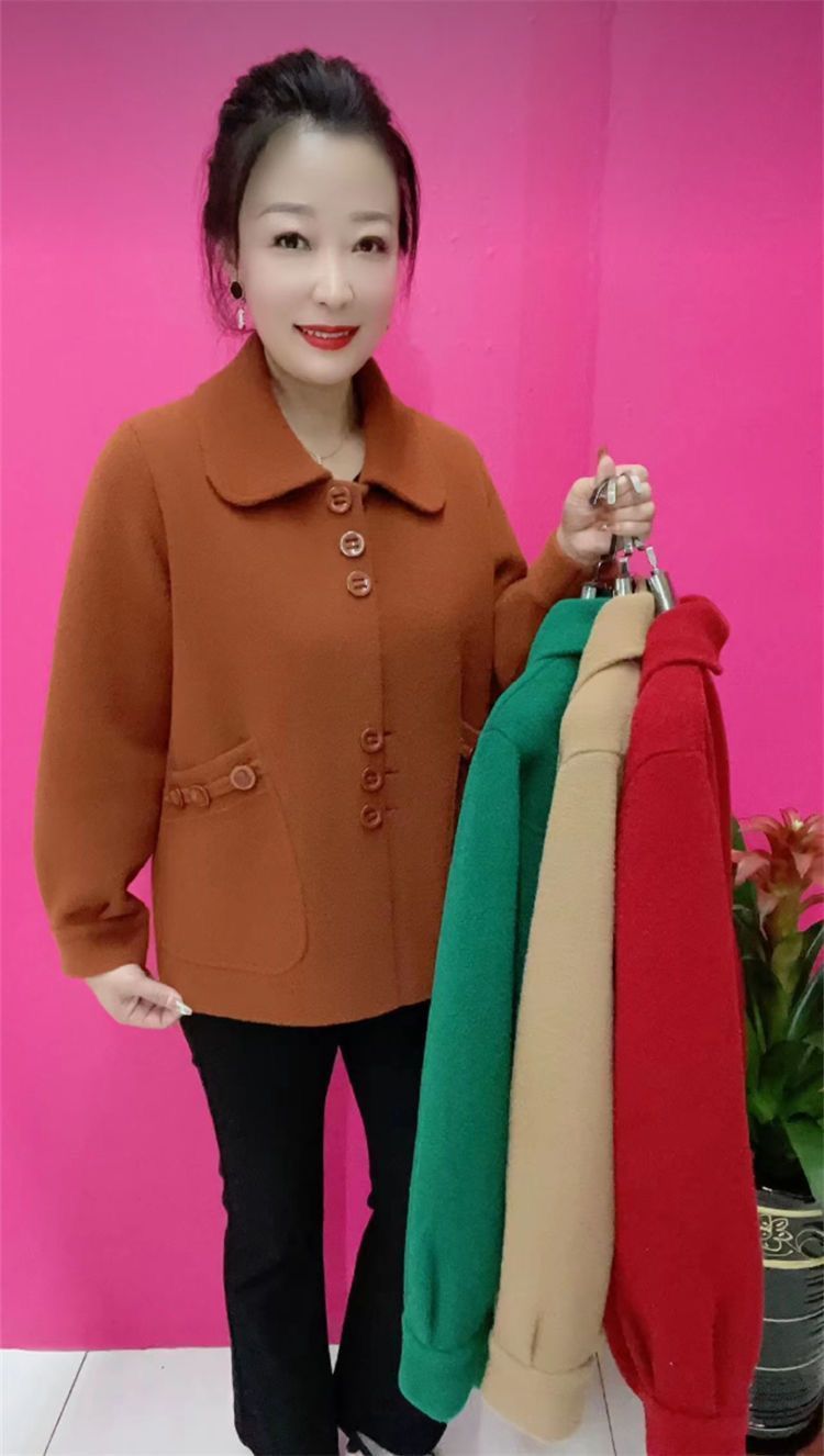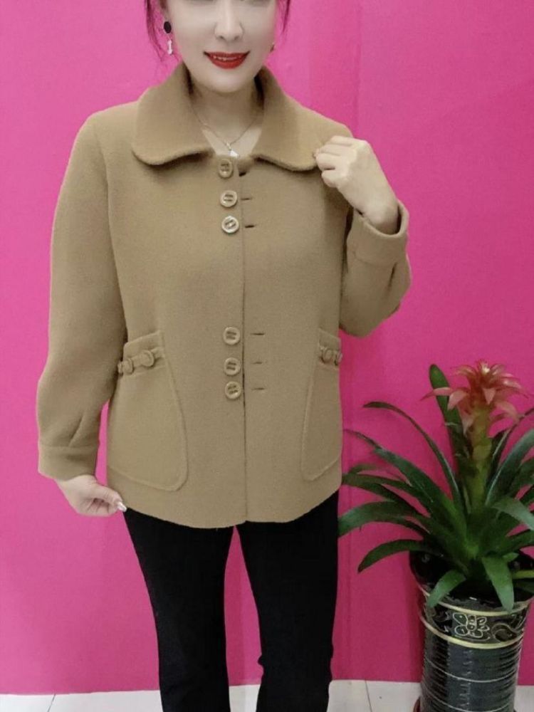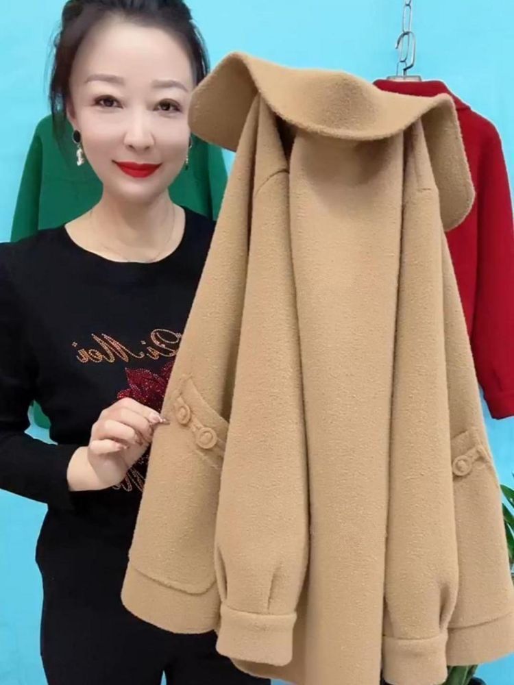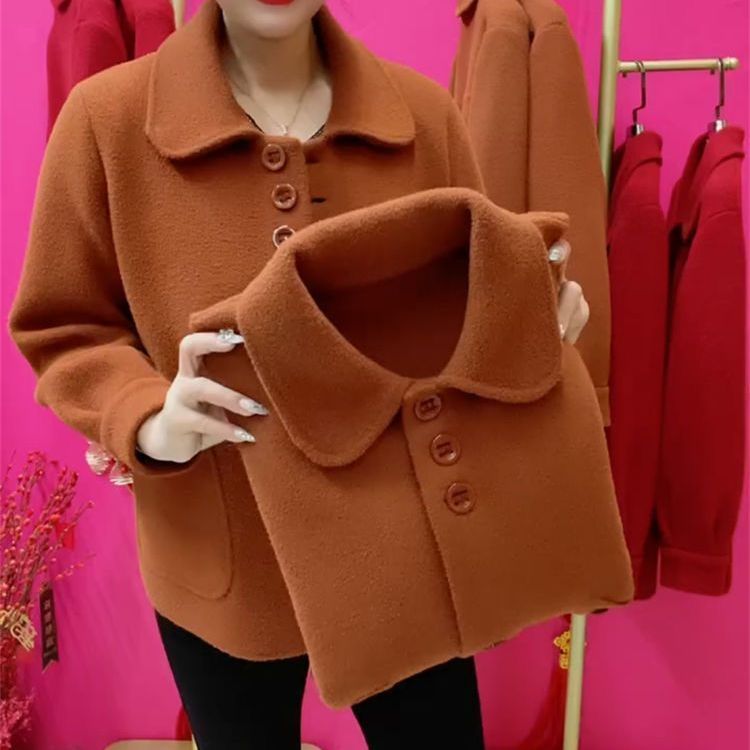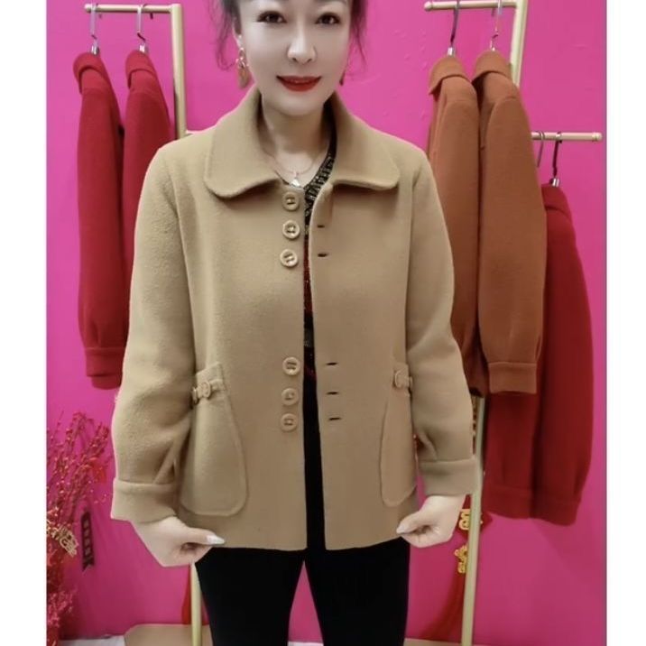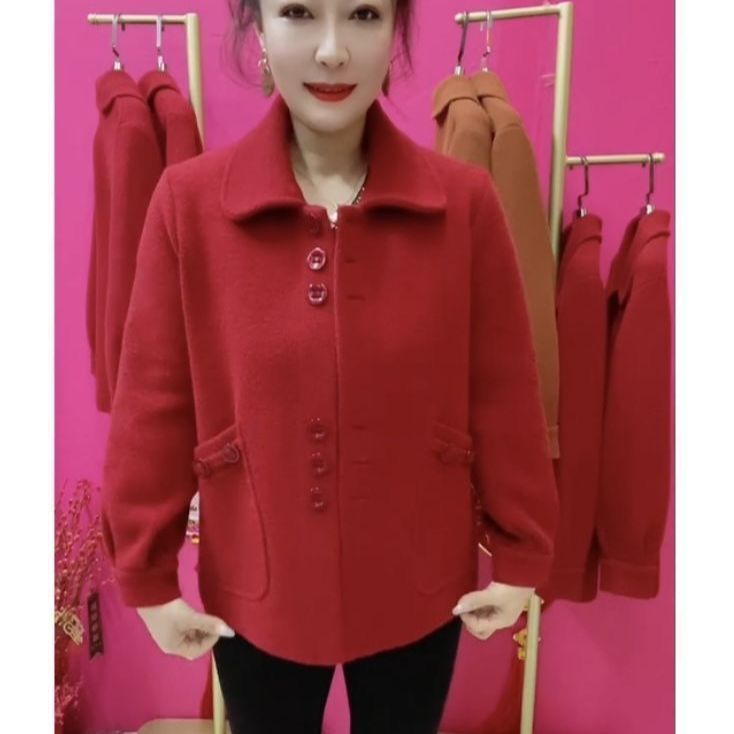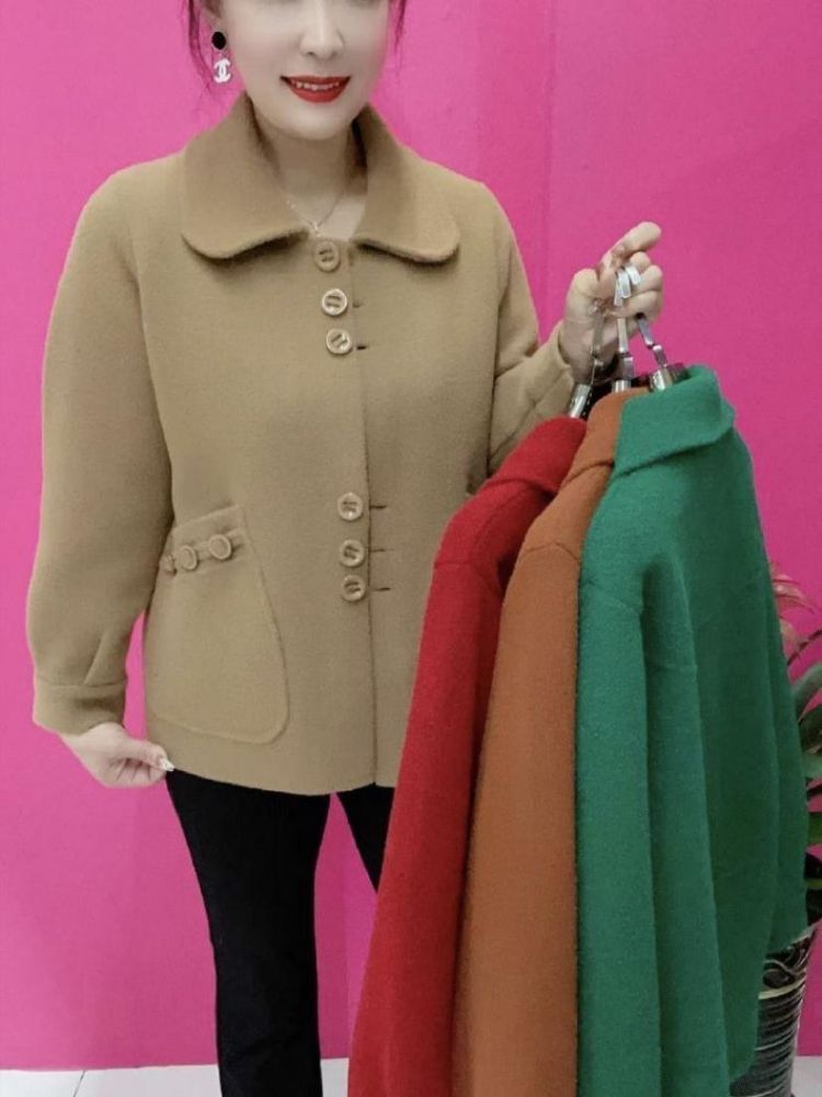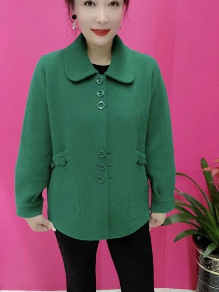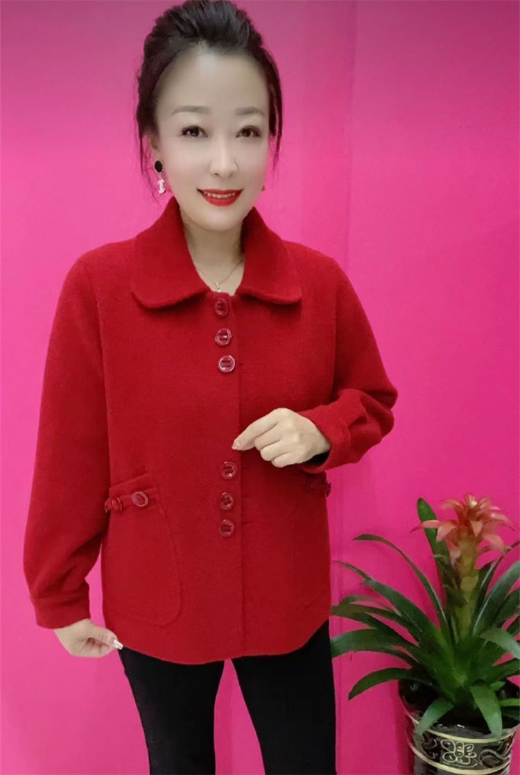 中老年妈妈装秋冬新款洋气纯色中短款宽松外套时尚开衫仿毛呢上衣