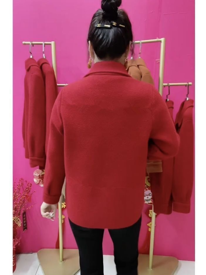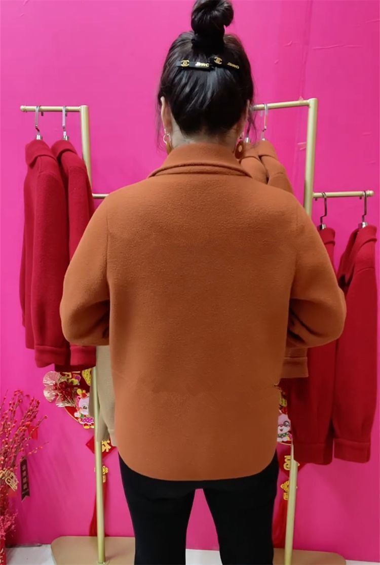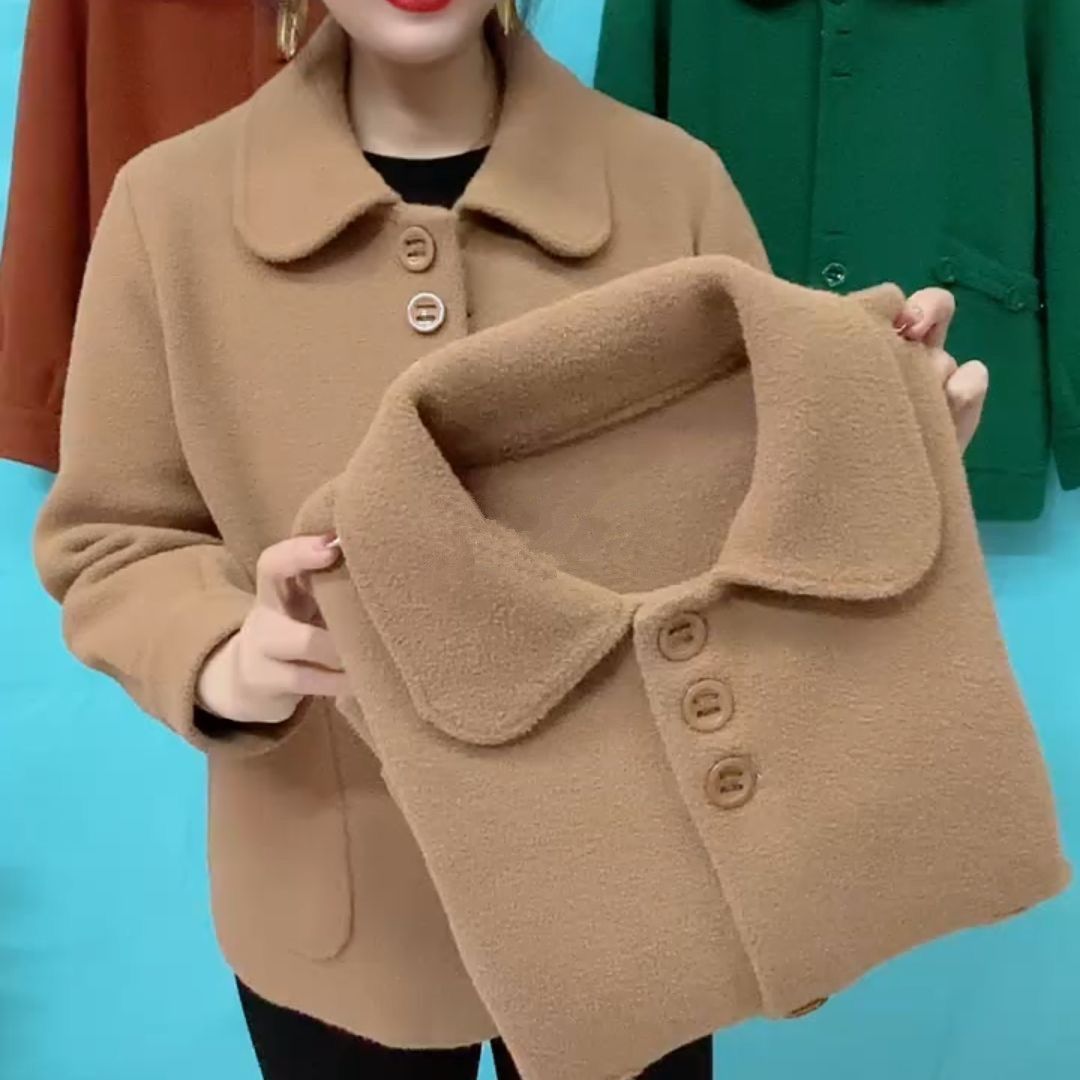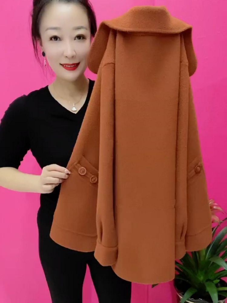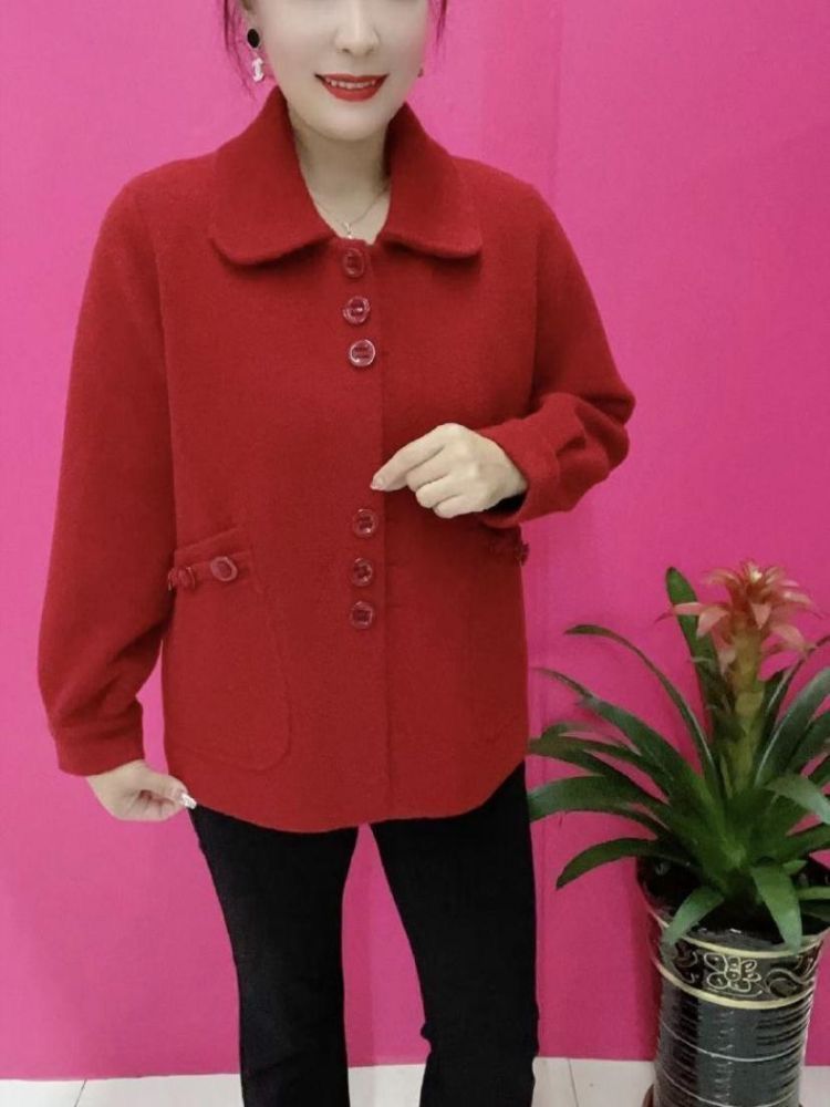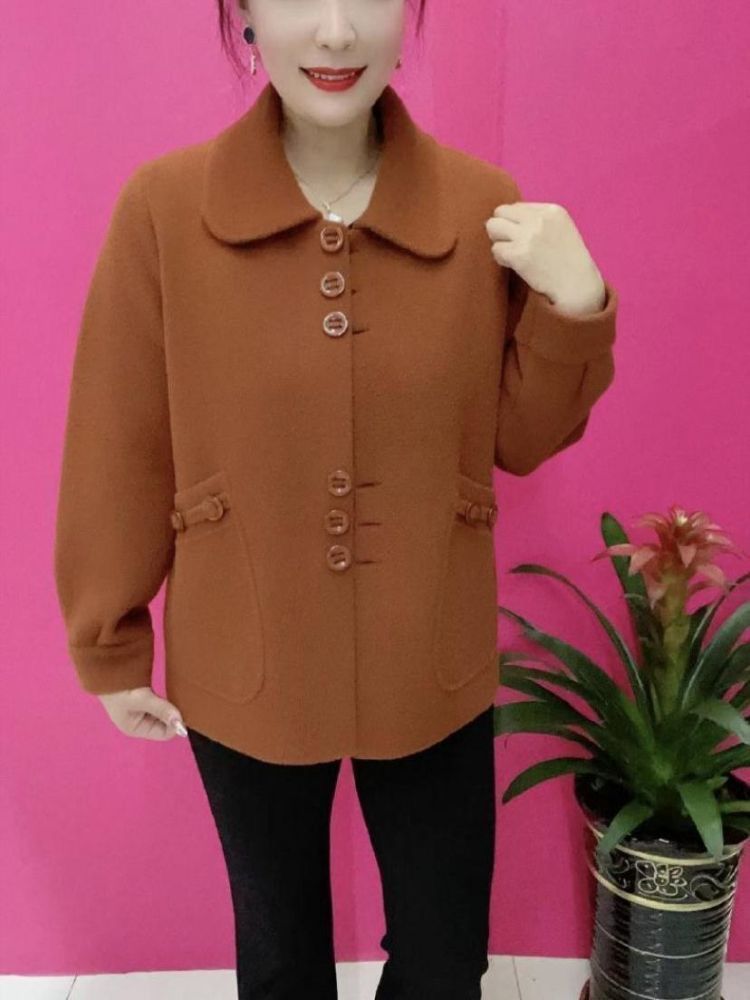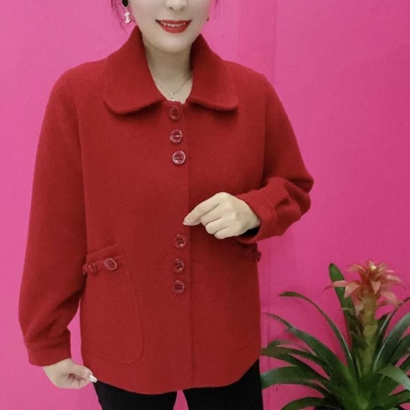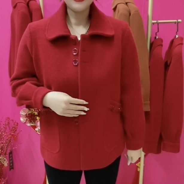中老年妈妈装秋冬新款洋气纯色中短款宽松外套时尚开衫仿毛呢上衣