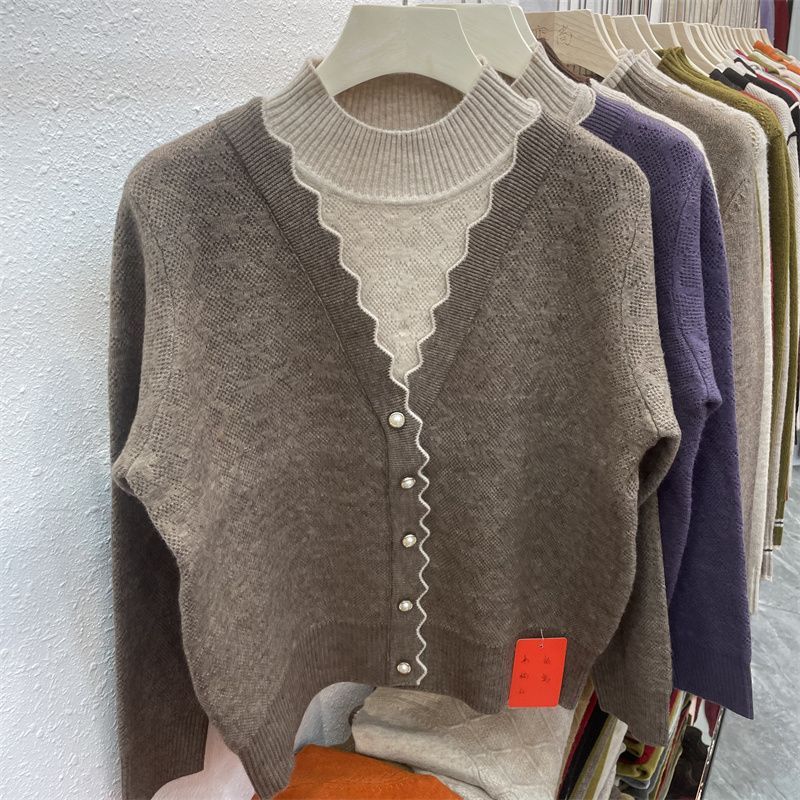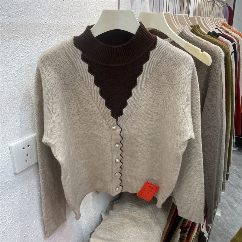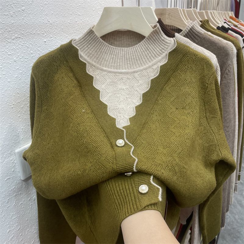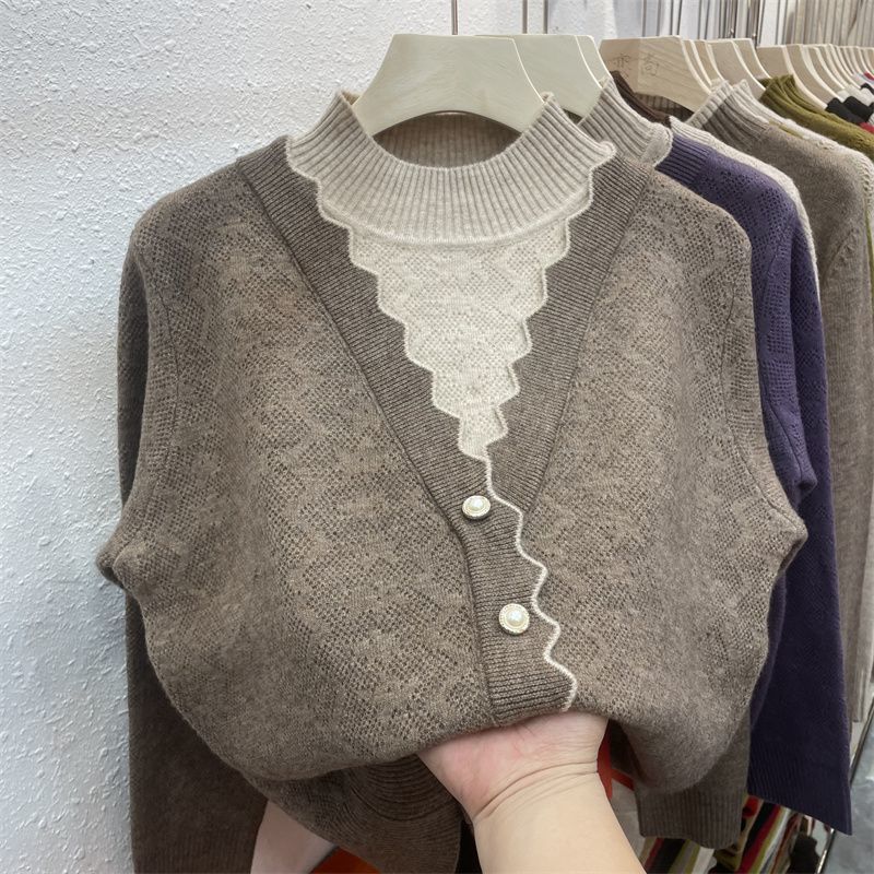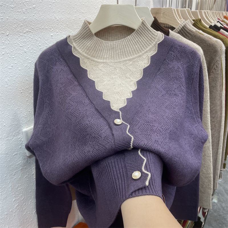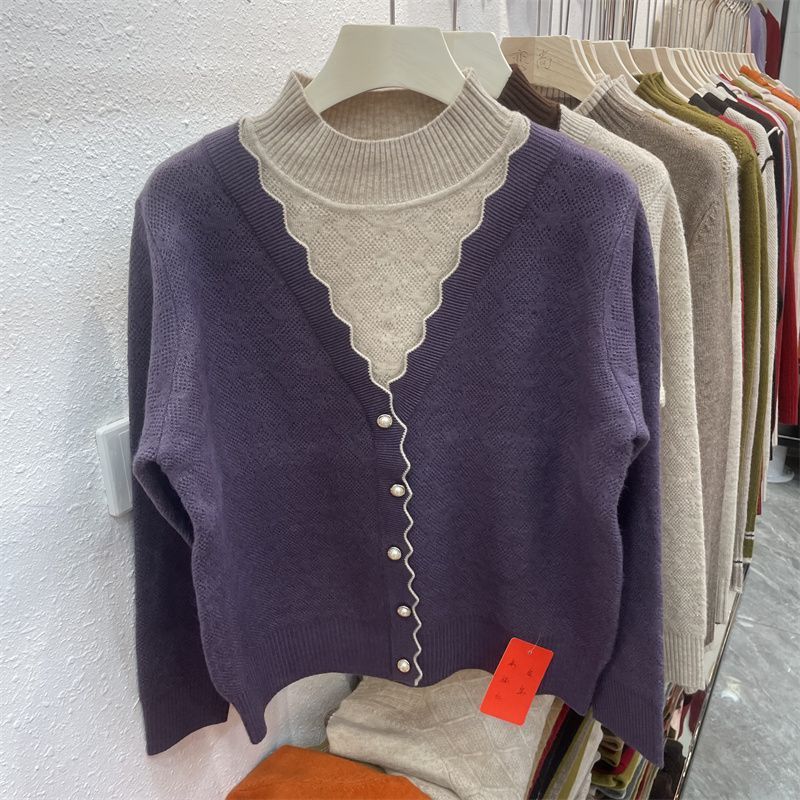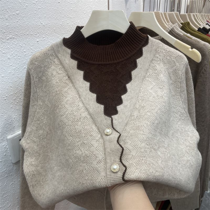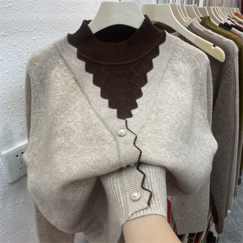 2024秋冬季新款韩版半高领加厚假两件拼色宽松长袖针织衫毛衣女潮