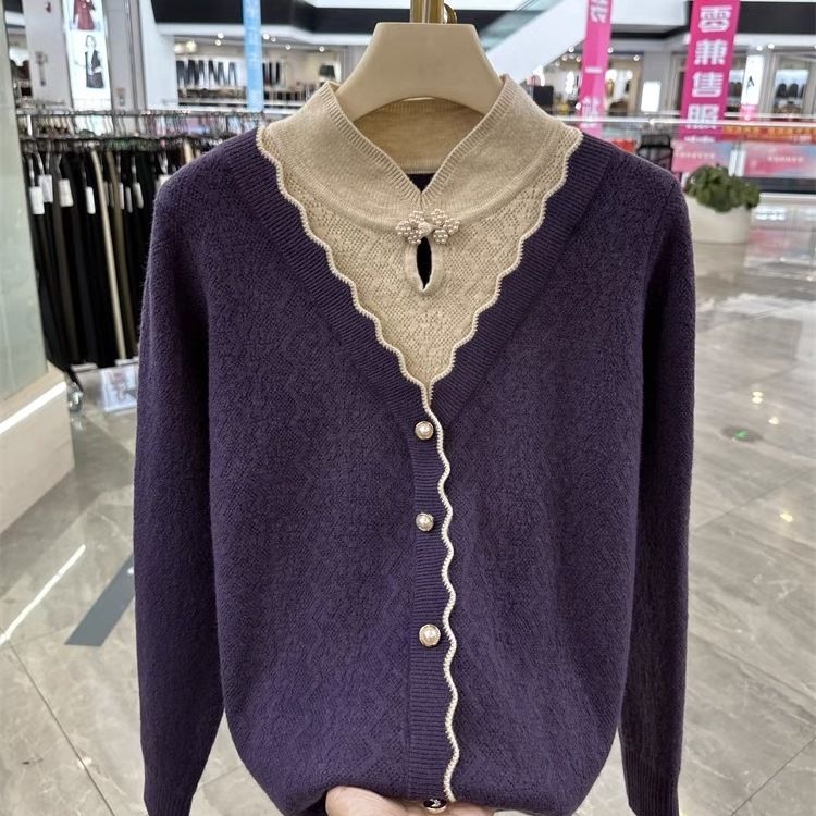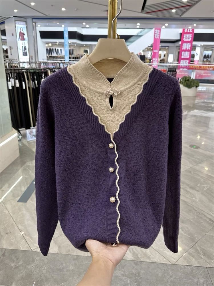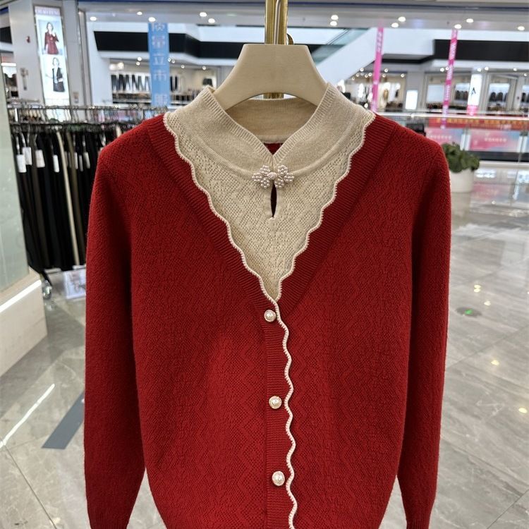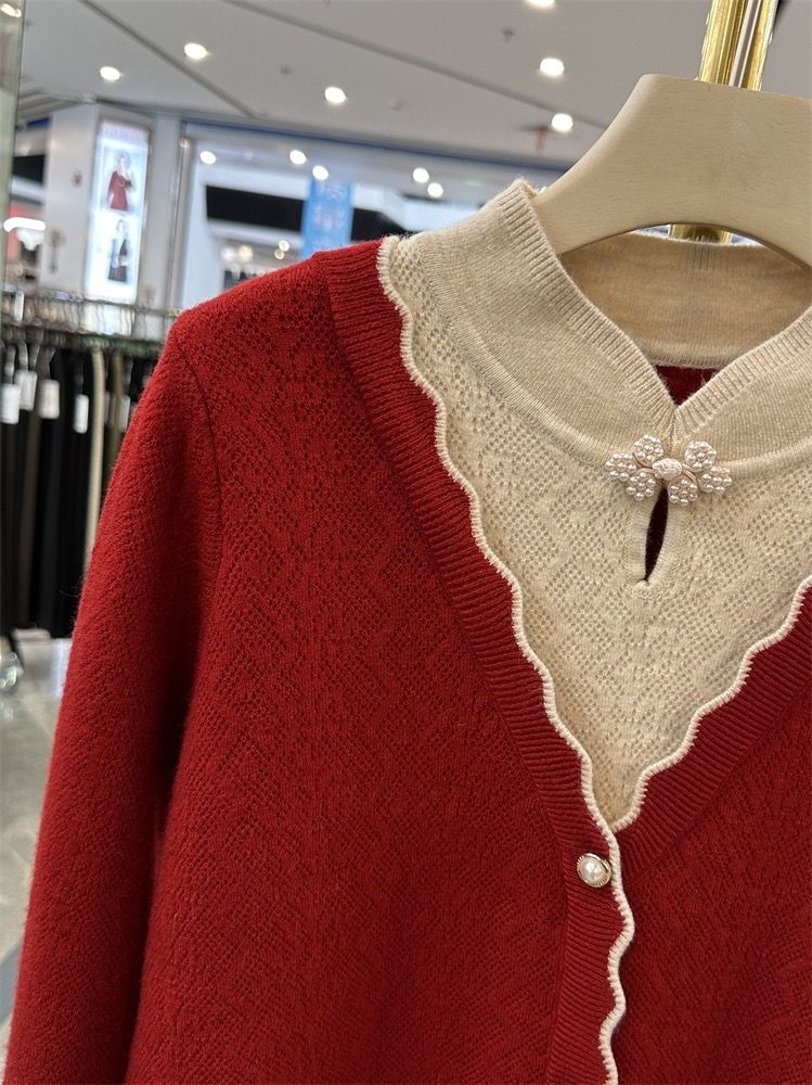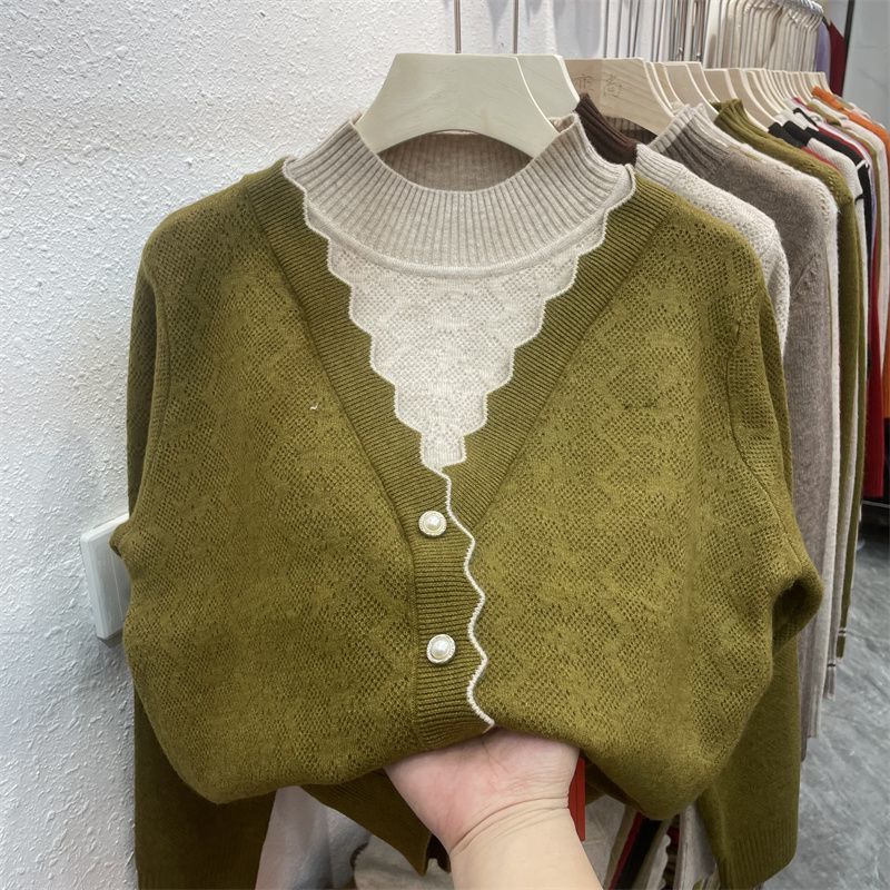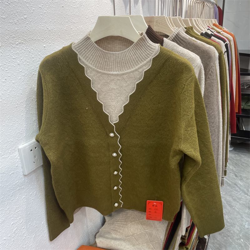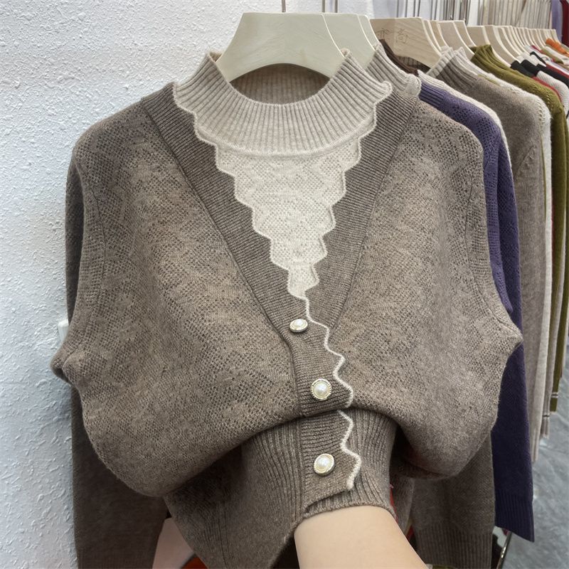 2024秋冬季新款韩版半高领加厚假两件拼色宽松长袖针织衫毛衣女潮