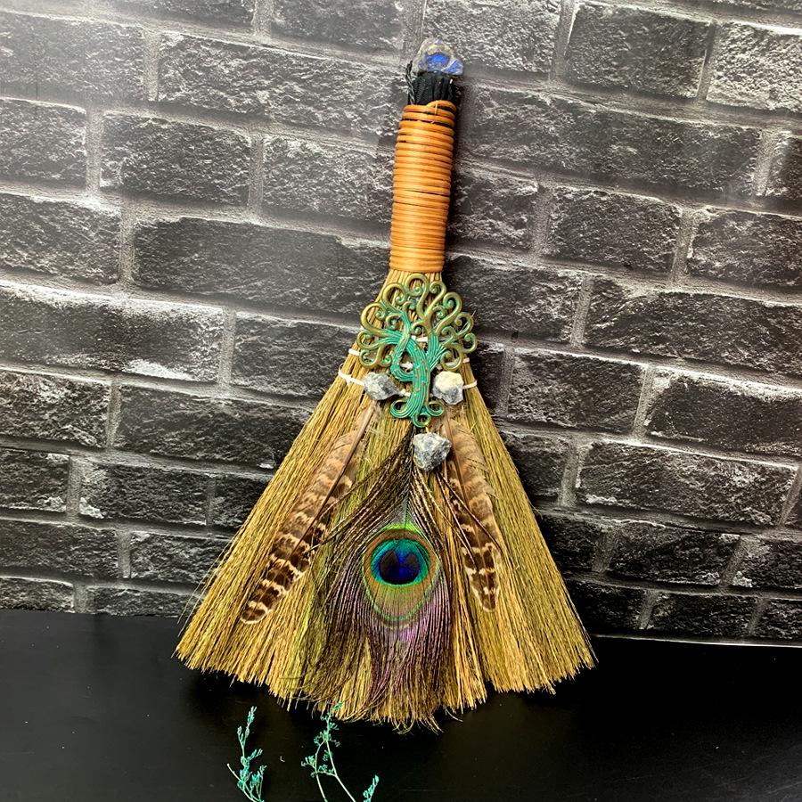 大扫把天然紫水晶生命树孔雀羽毛祭坛摆件