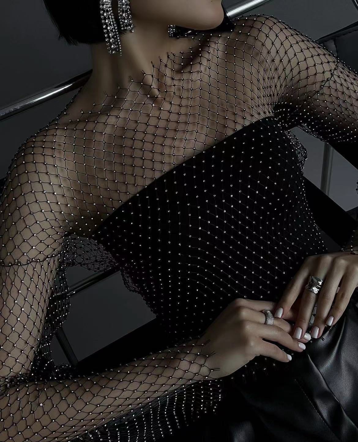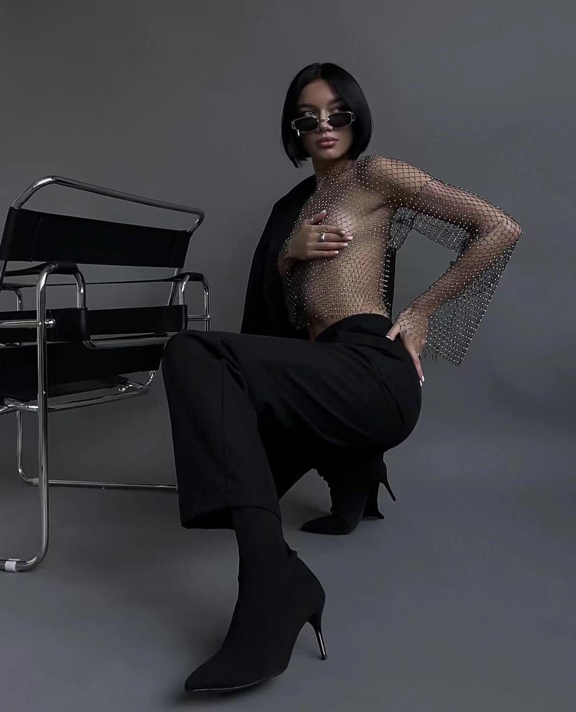 跨境货源2024速卖通INS亚马逊夏季网格闪钻女装T恤喇叭袖上衣1122