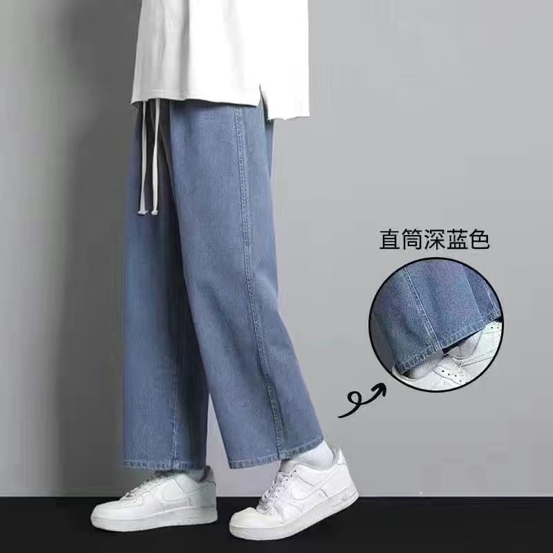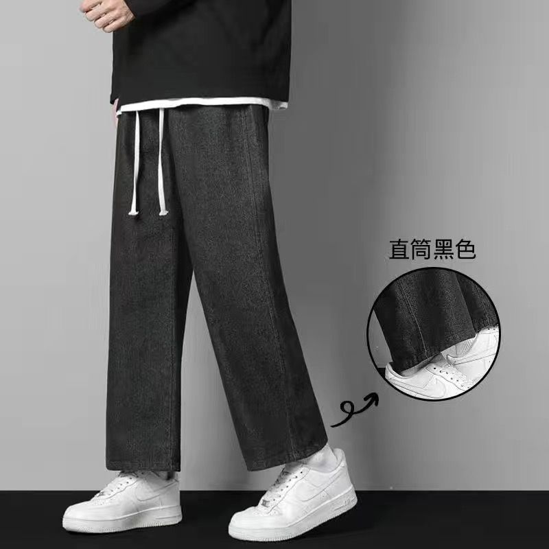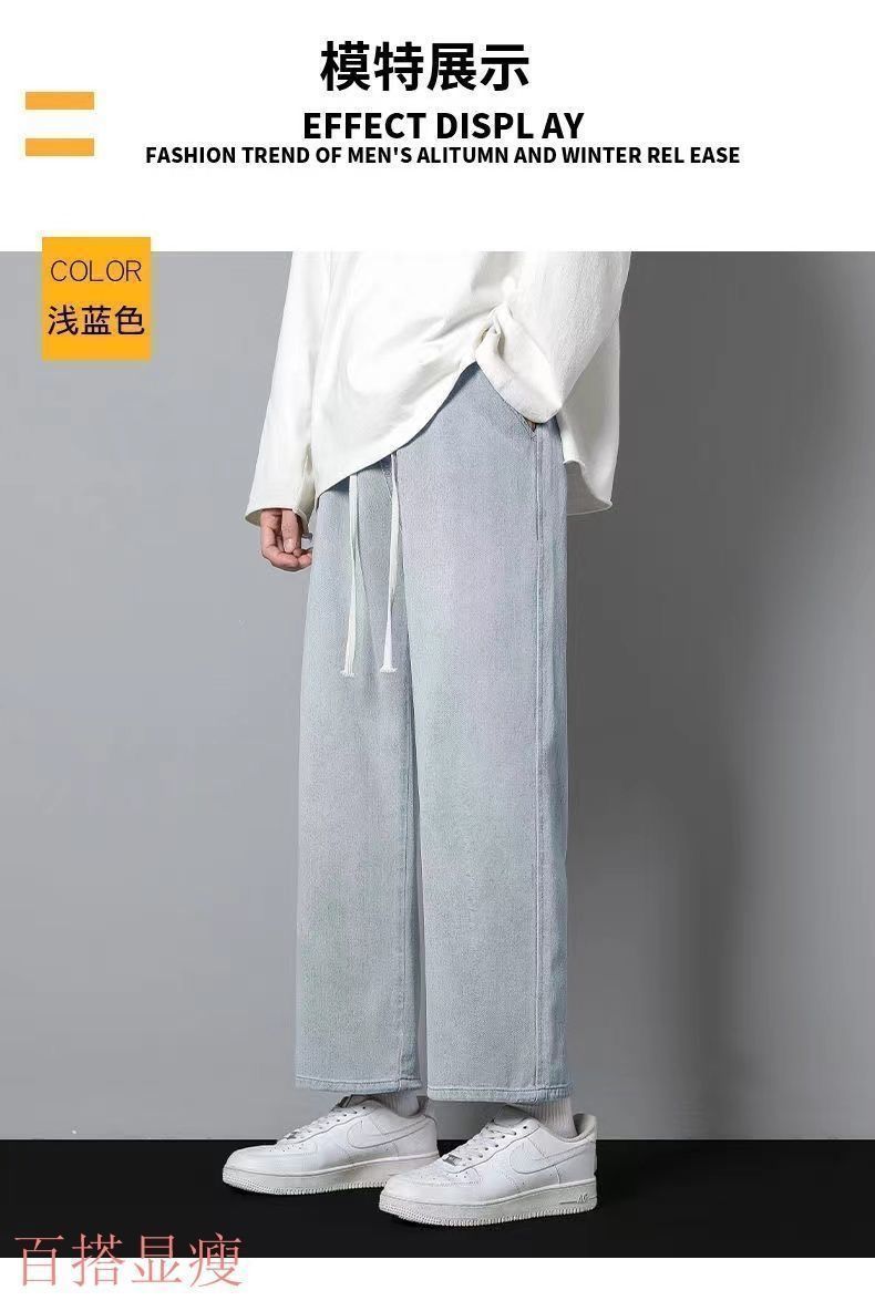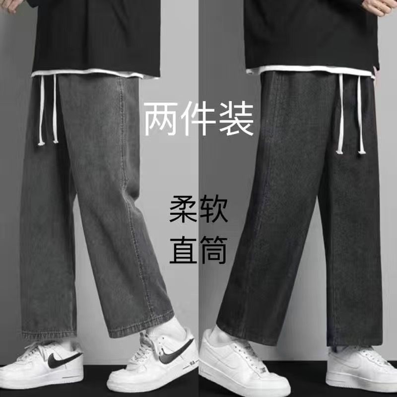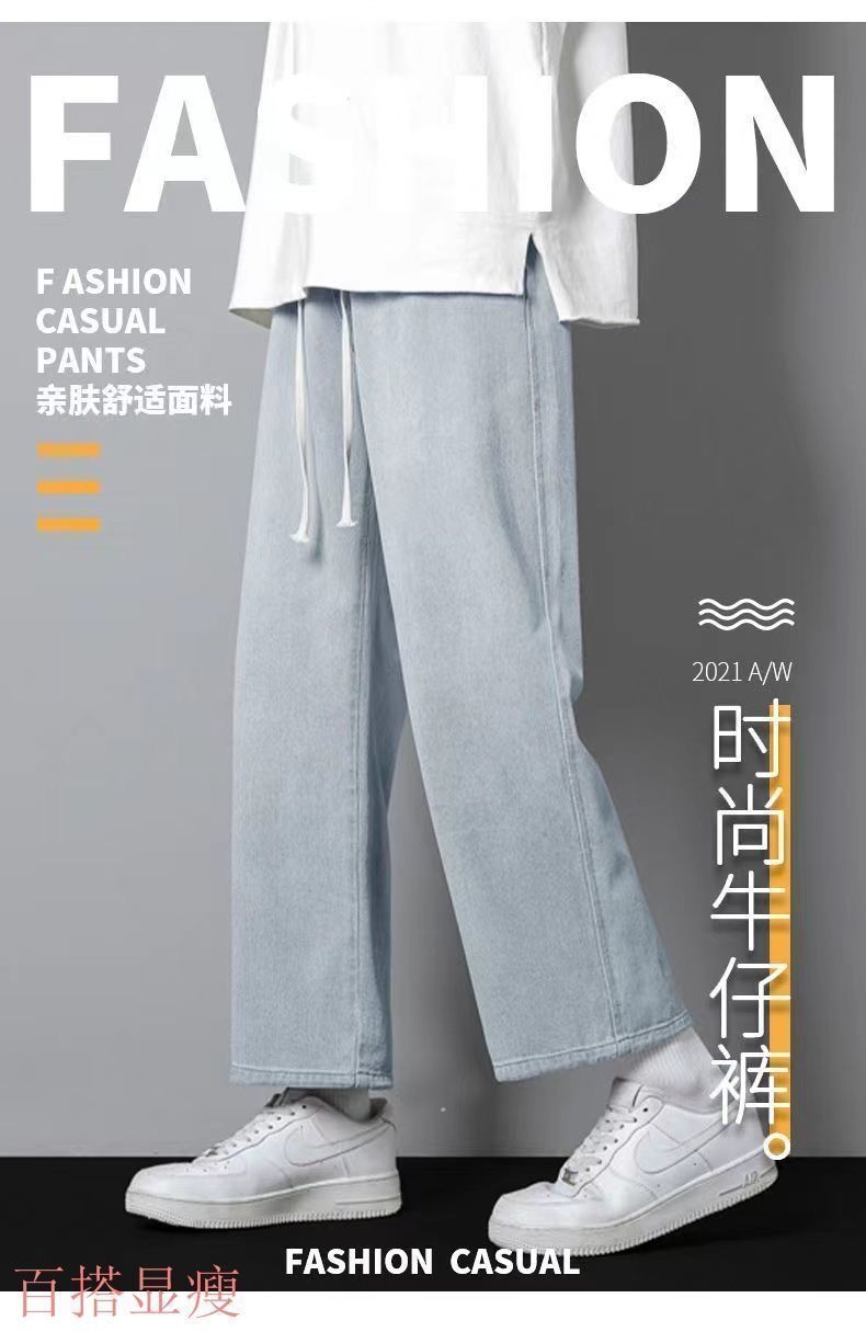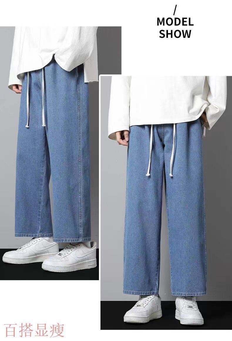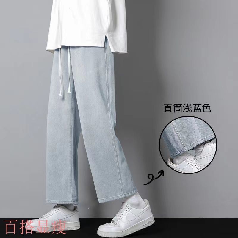 春秋新款牛仔裤男ins宽松直筒裤子潮流百搭复古松紧腰阔腿九分裤
