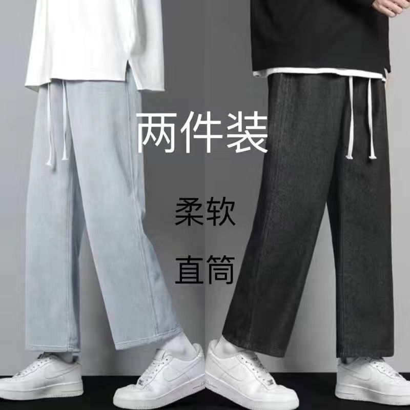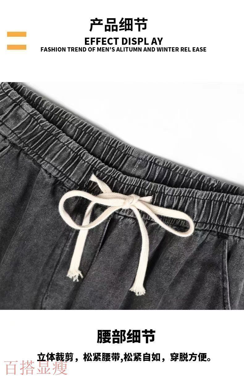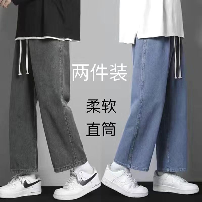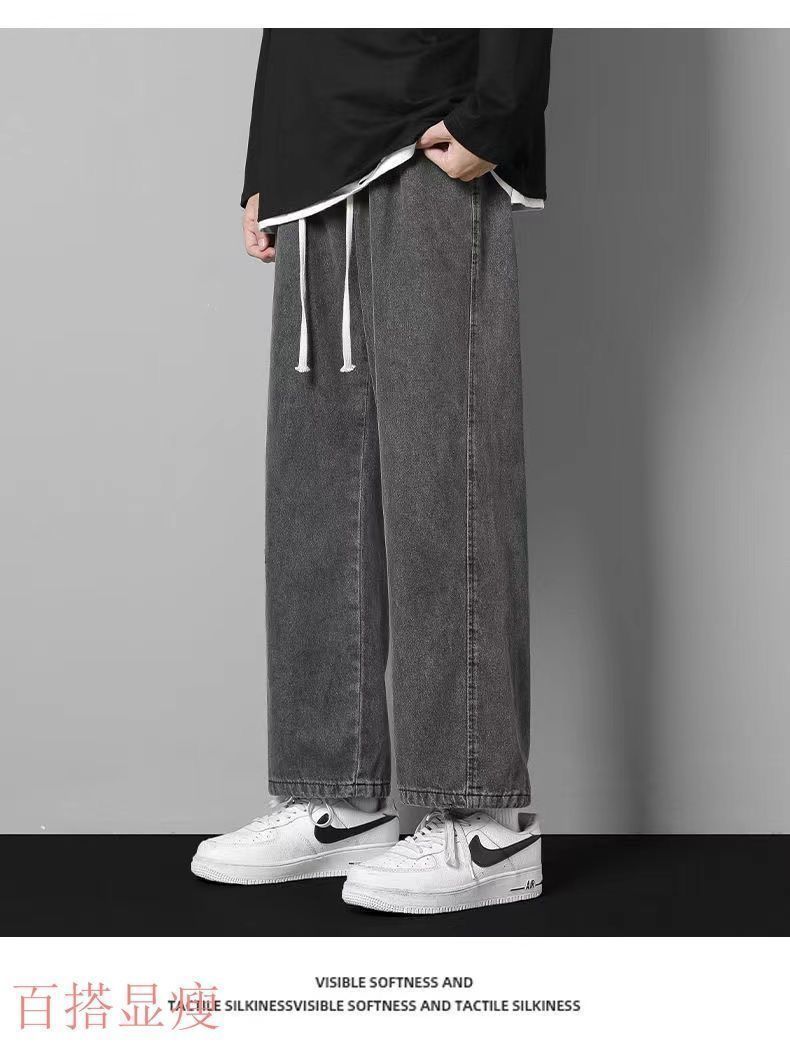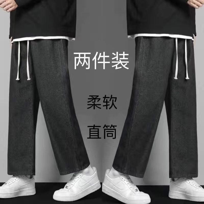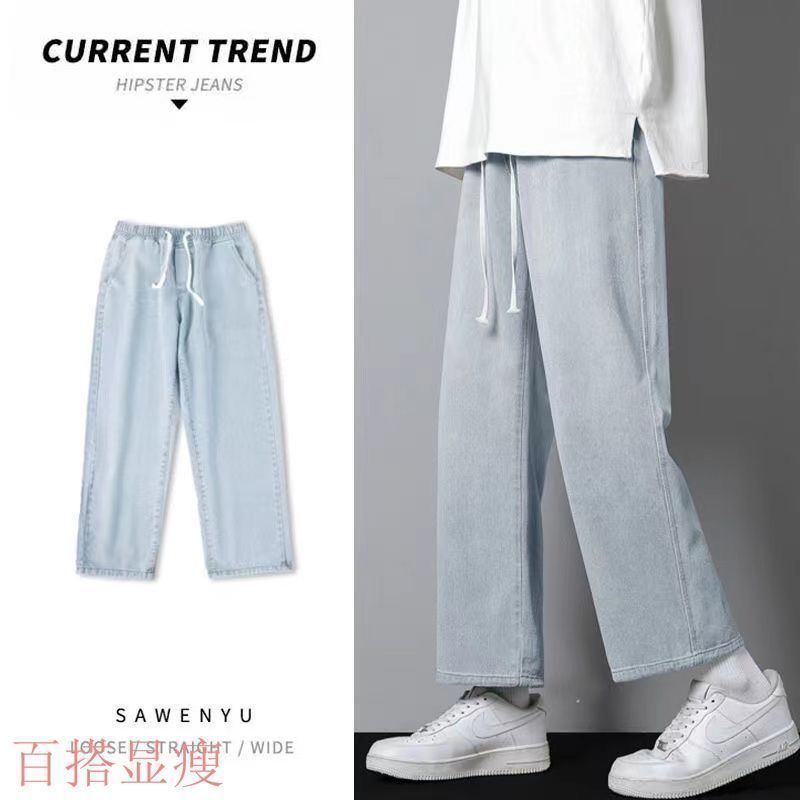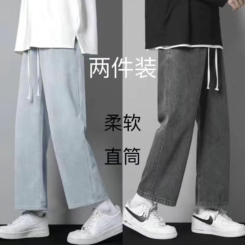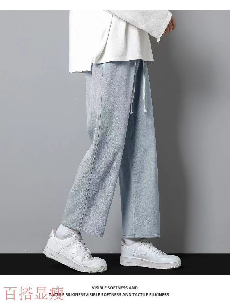 春秋新款牛仔裤男ins宽松直筒裤子潮流百搭复古松紧腰阔腿九分裤