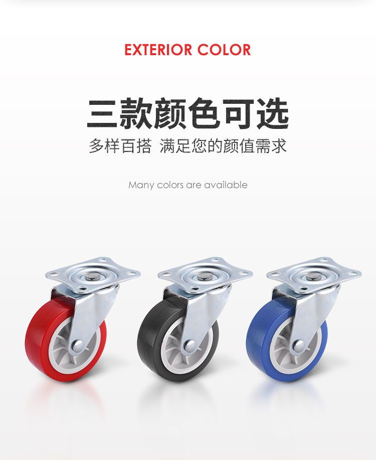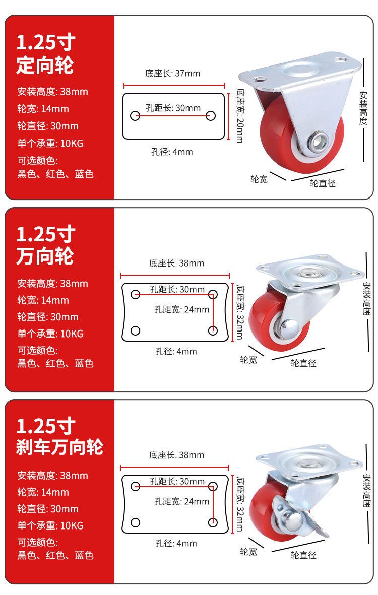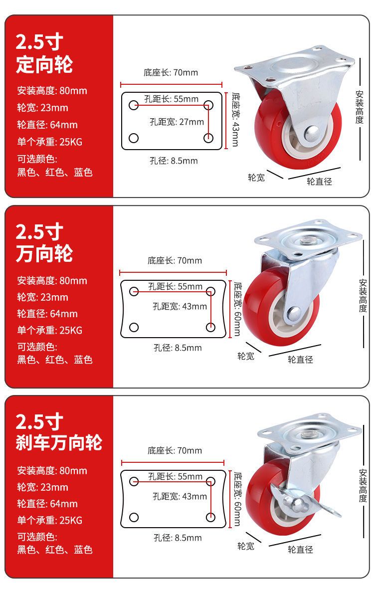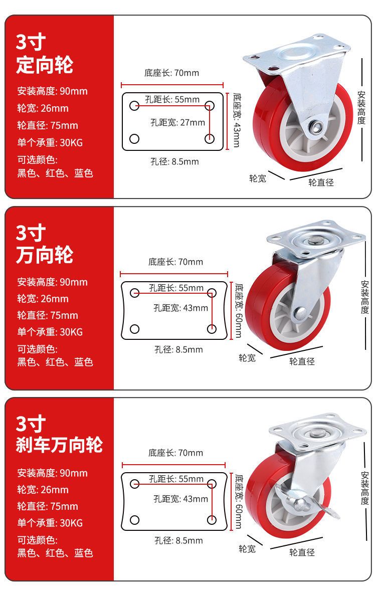 万向轮1-3寸静音万向脚轮推车轮子带刹车家具五金转向滑轮定向轮