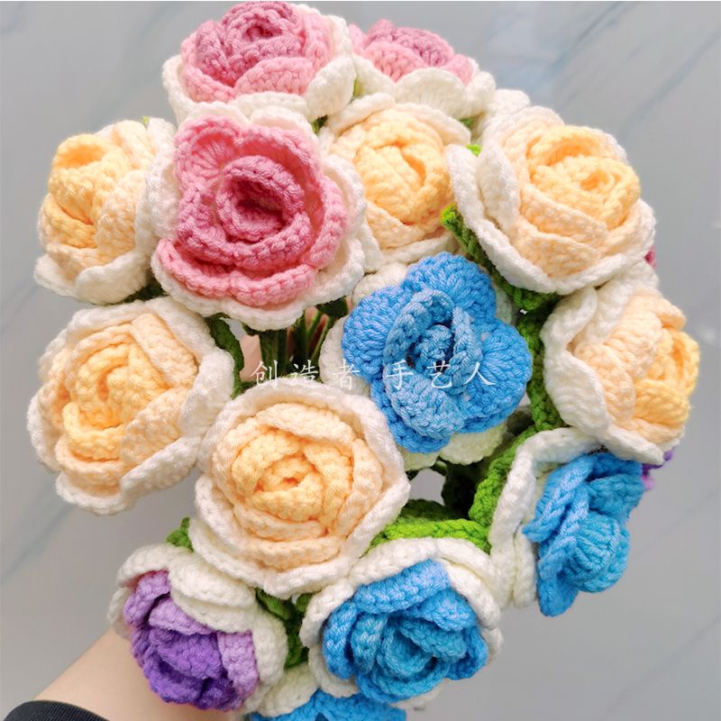 【成品】批发渐变玫瑰碎冰蓝手工编织毛线花束仿真花束情人节礼物