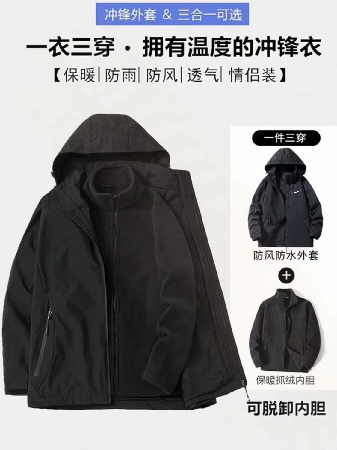清仓三合一美式冲锋衣外套男女情侣爆款春秋户外防水防风运动夹克