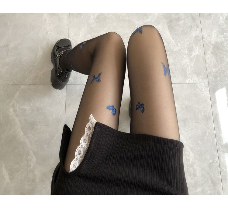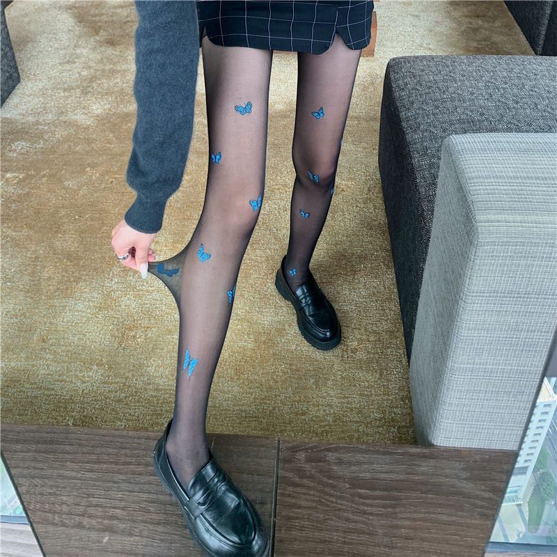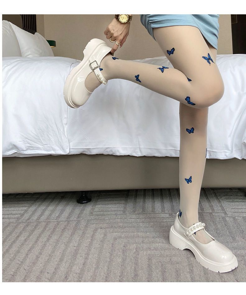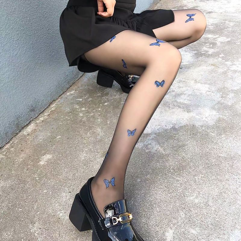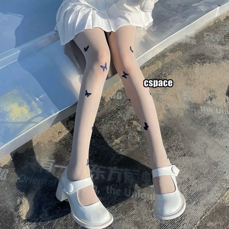 新款白色纯欲风jk萝莉丝袜仙女蓝色蝴蝶印花黑丝薄款打底丝袜裤女