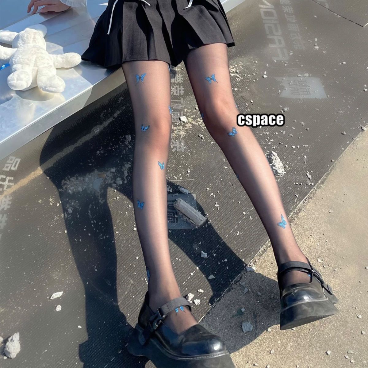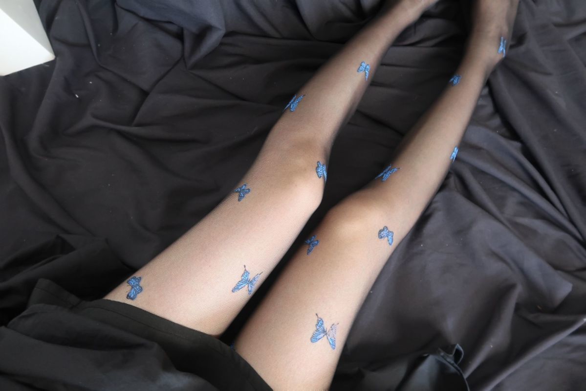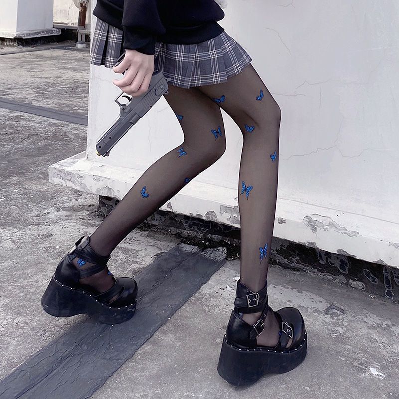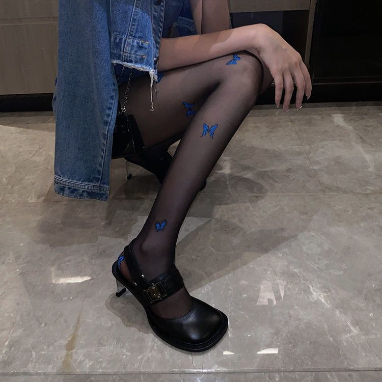 新款白色纯欲风jk萝莉丝袜仙女蓝色蝴蝶印花黑丝薄款打底丝袜裤女