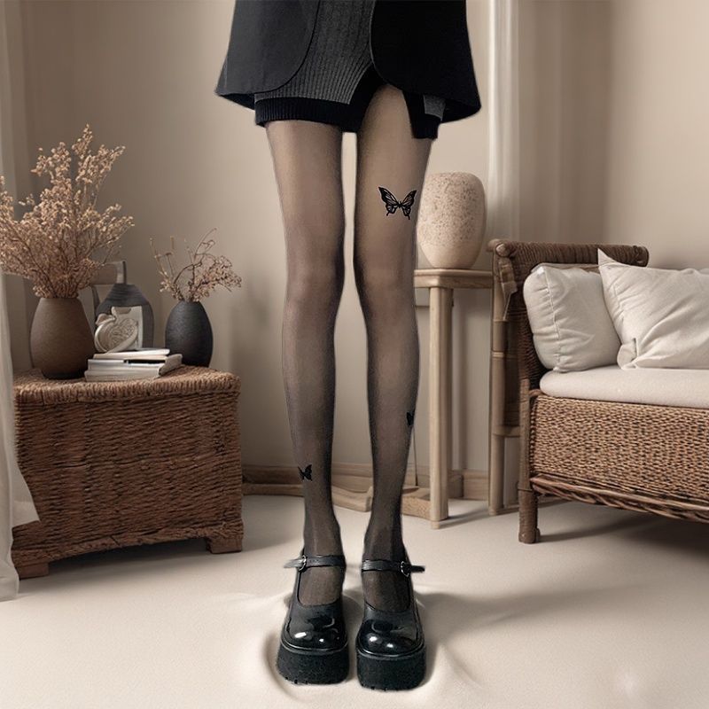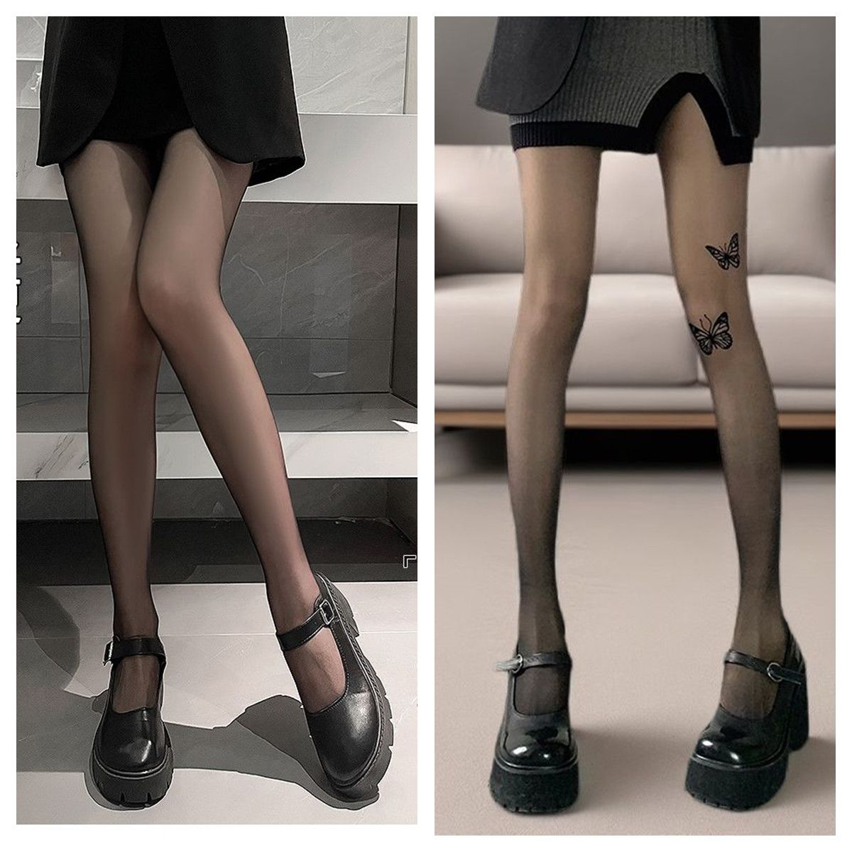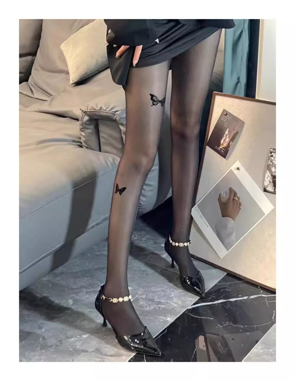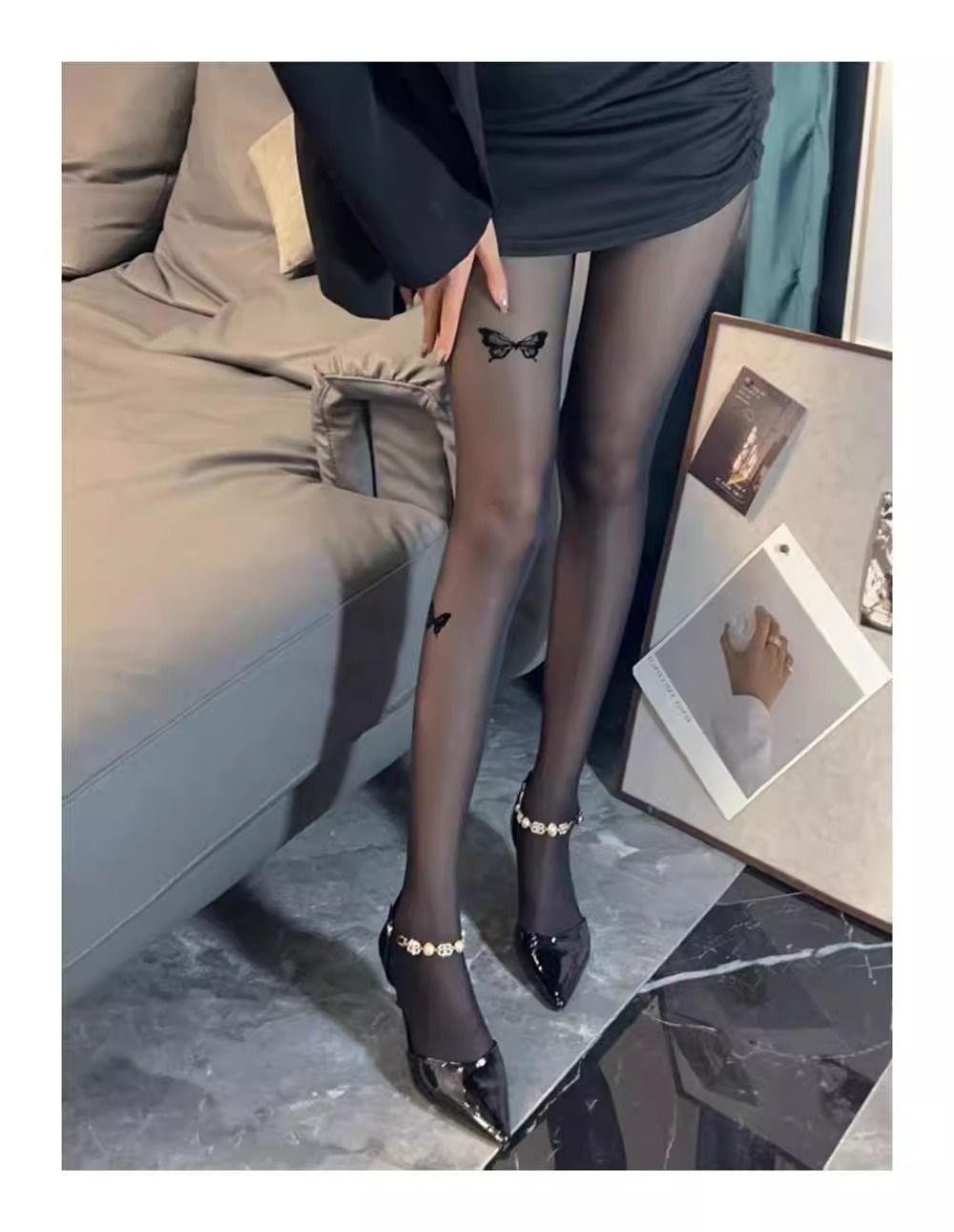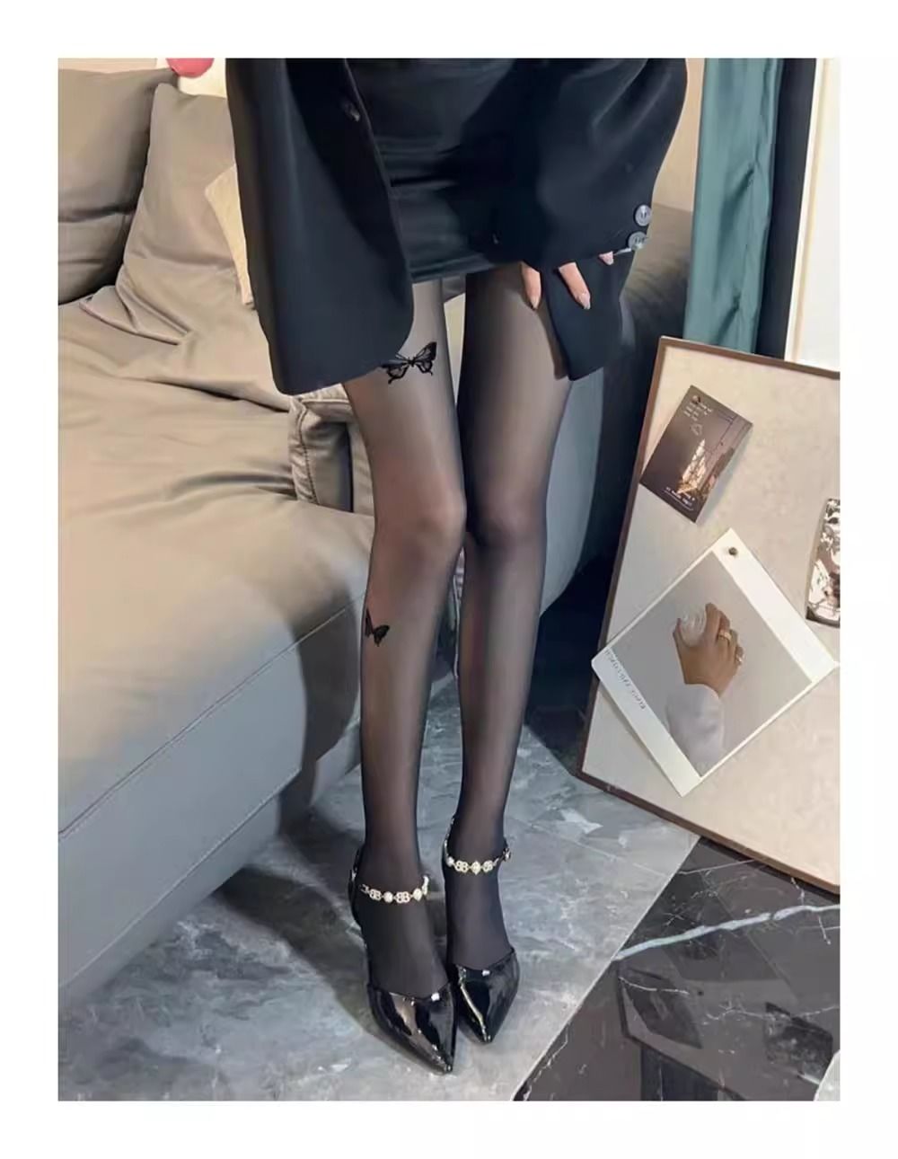 蝴蝶印花黑丝纯欲裸感丝袜薄款夏天防勾丝性感超薄款连裤袜女肉色