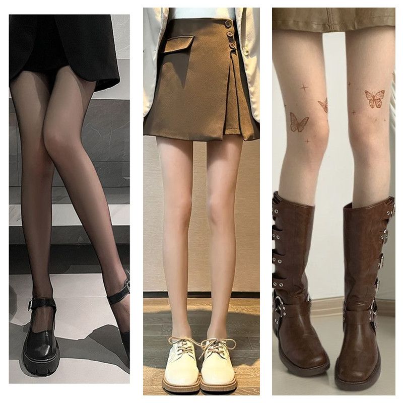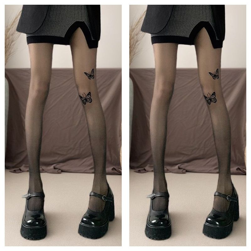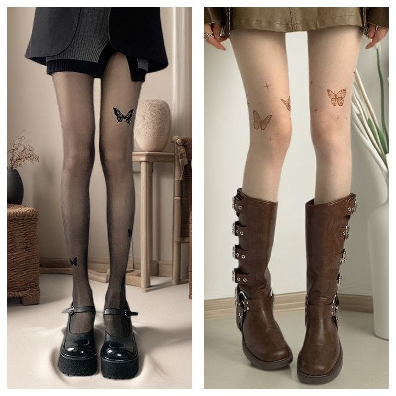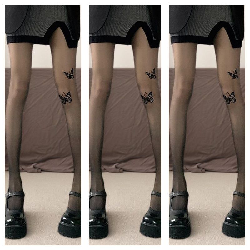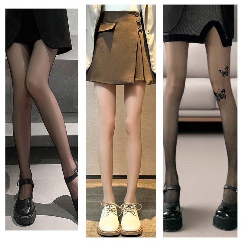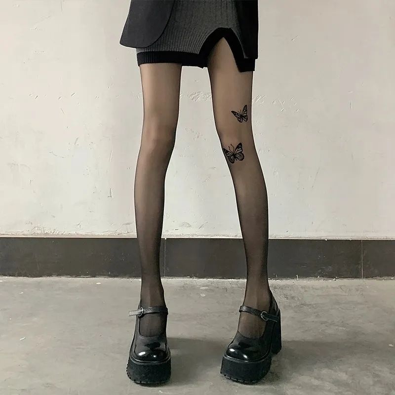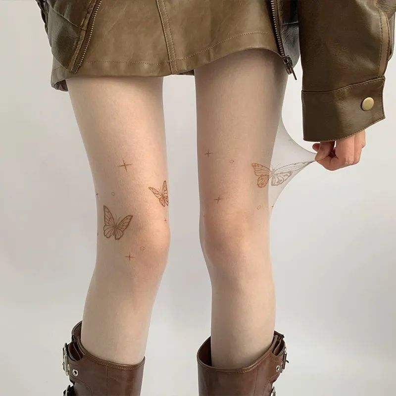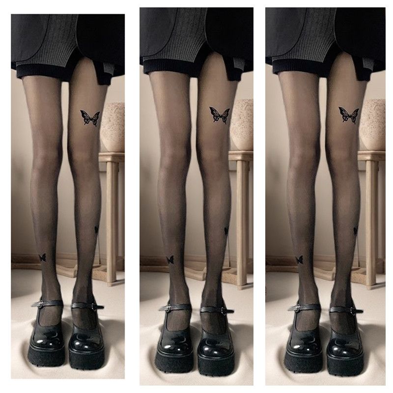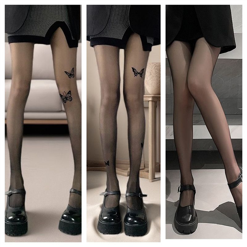 蝴蝶印花黑丝纯欲裸感丝袜薄款夏天防勾丝性感超薄款连裤袜女肉色