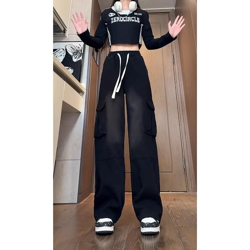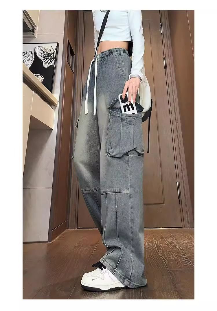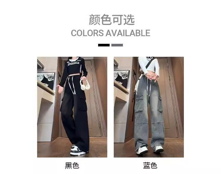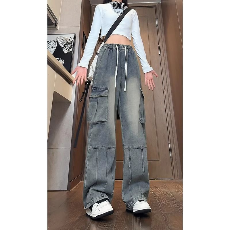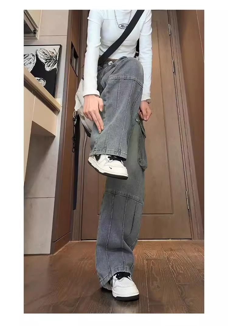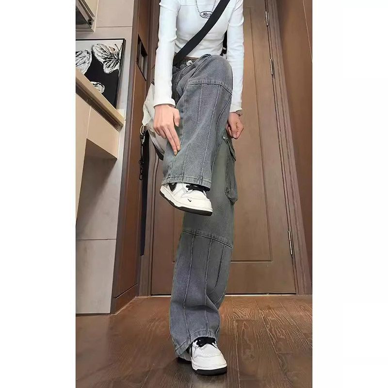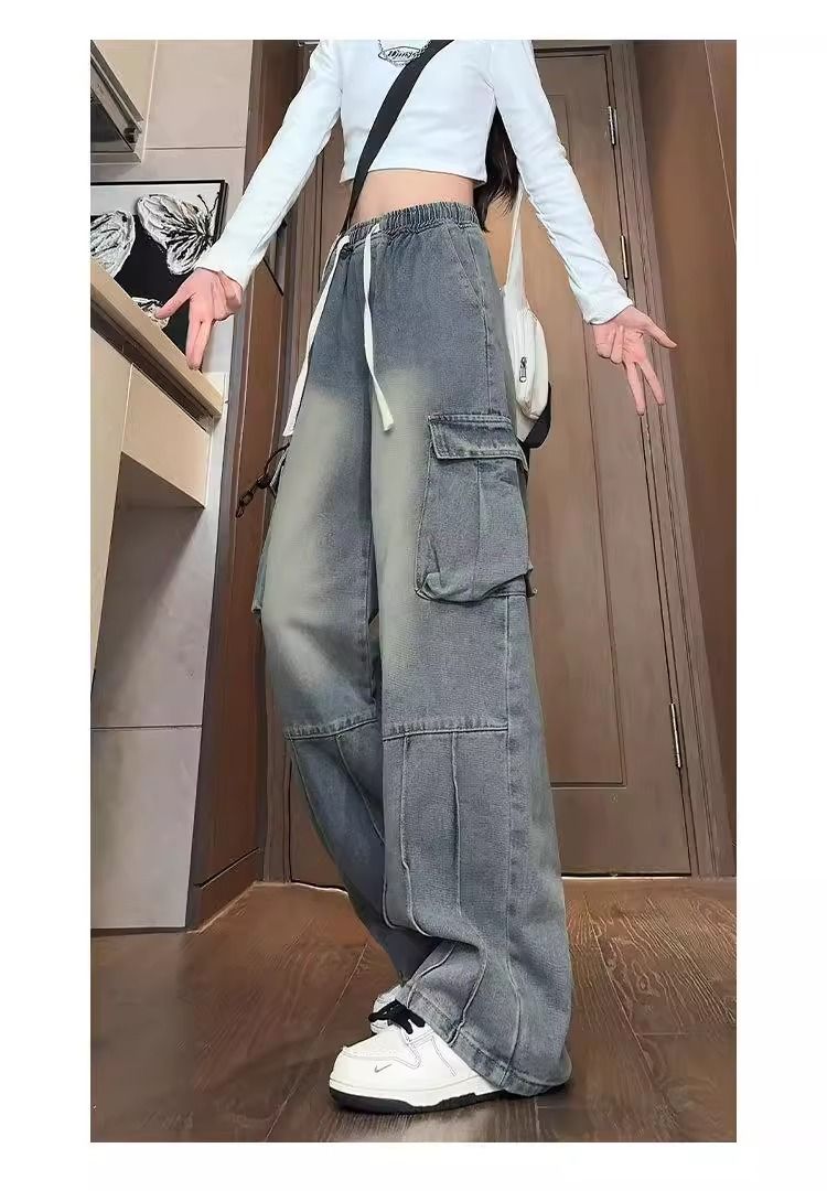 美式复古工装牛仔裤女2024新款春秋胖mm大码显瘦宽松高腰阔腿长裤