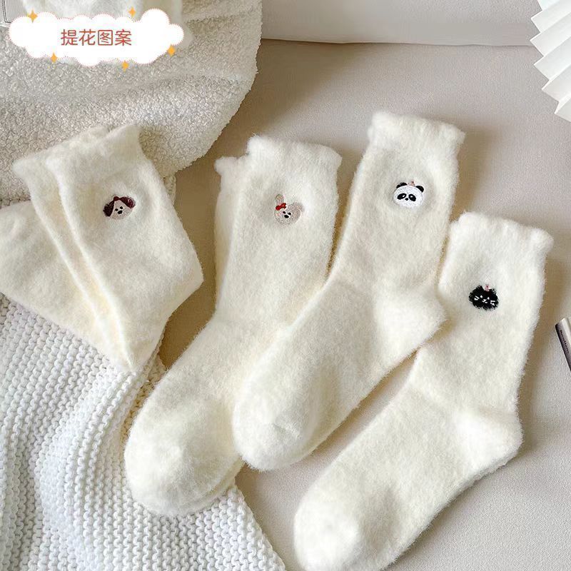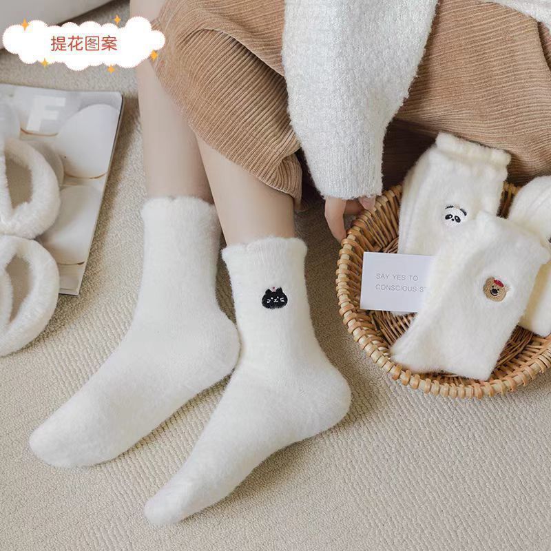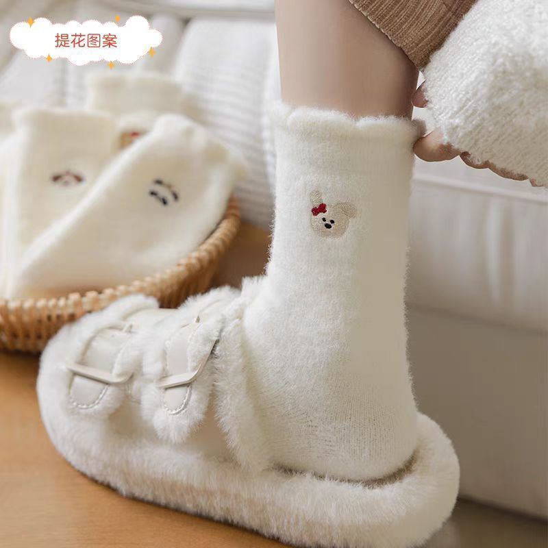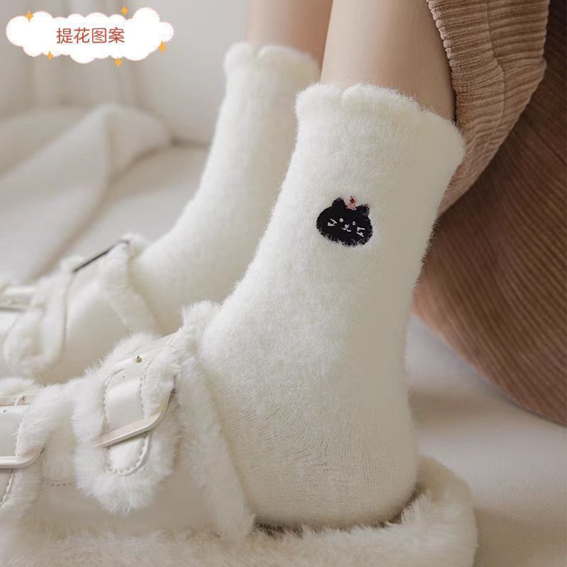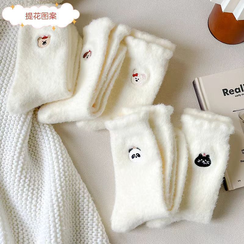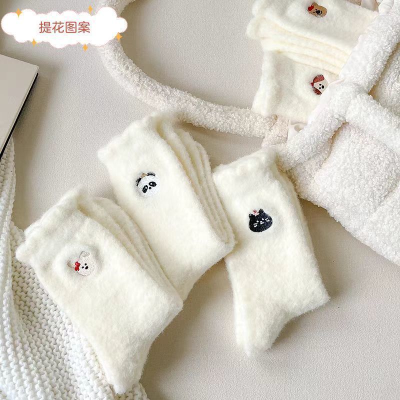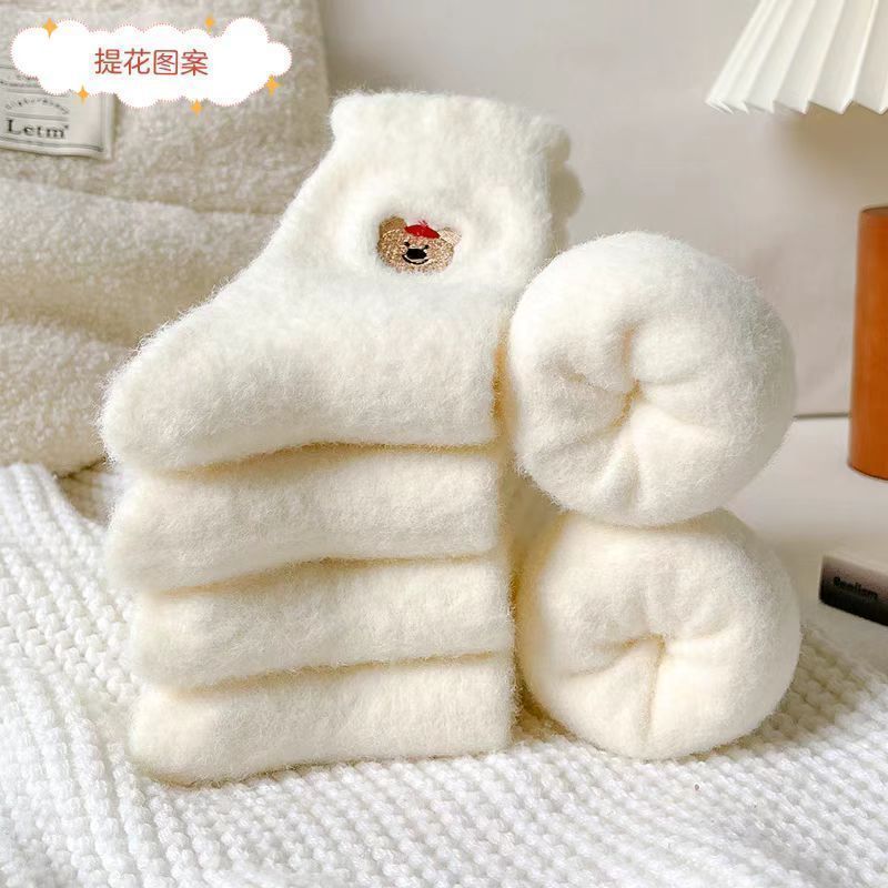 可爱纯白袜子睡眠冬季女中筒加绒加厚月子中筒地板保暖秋冬毛袜