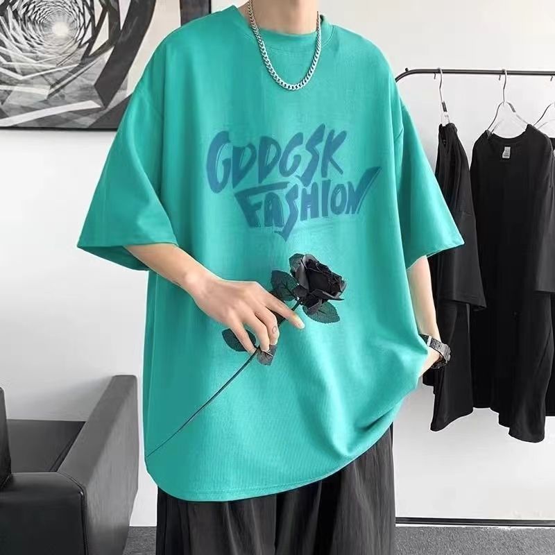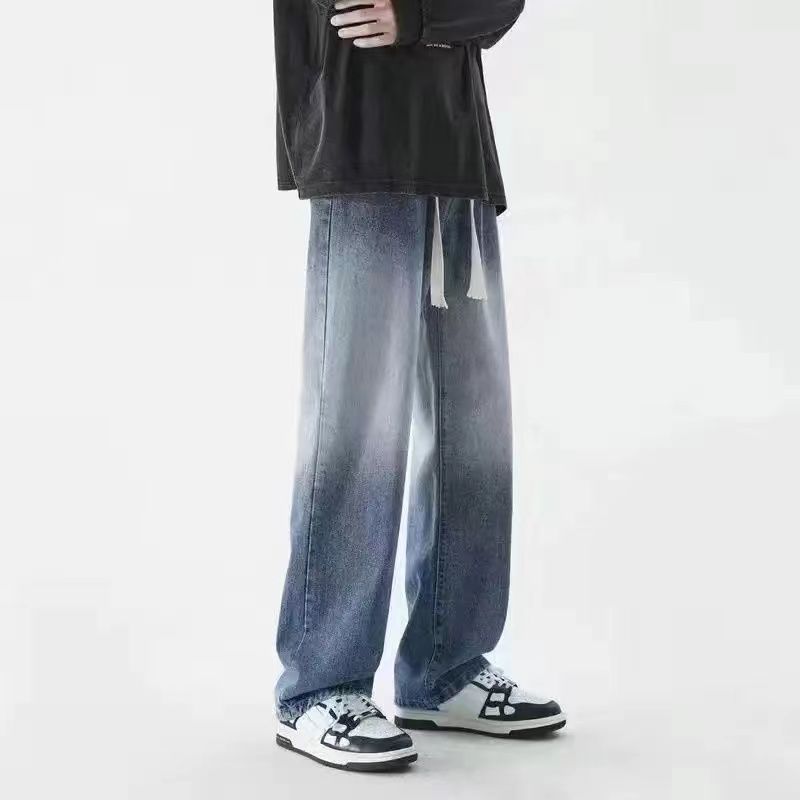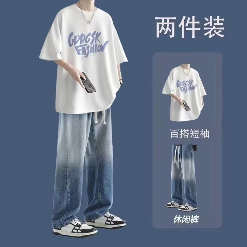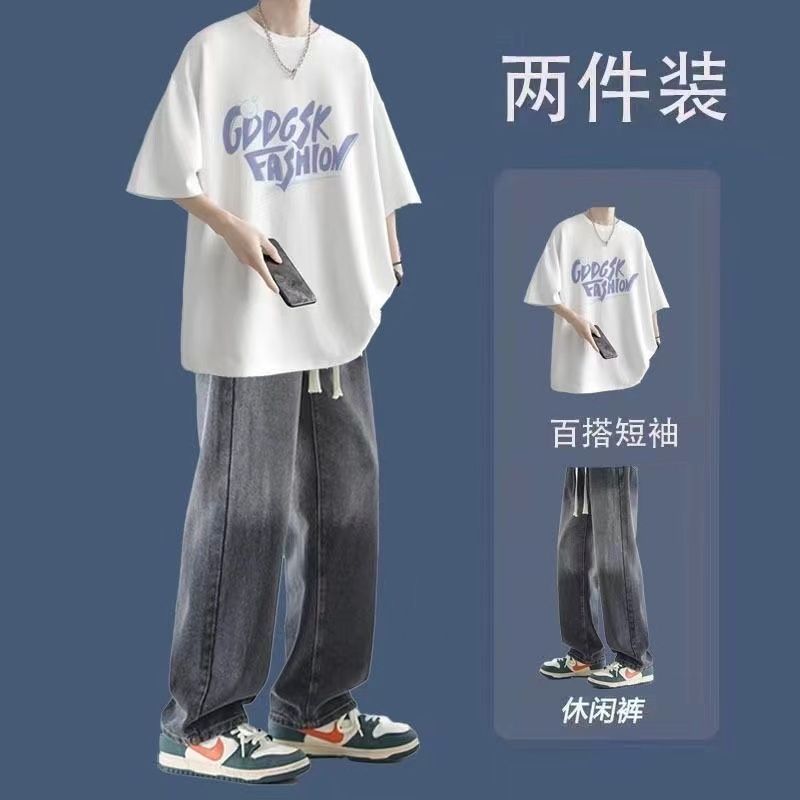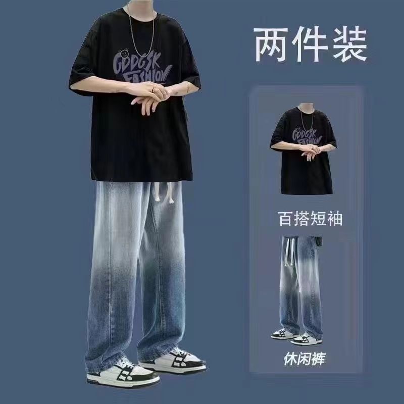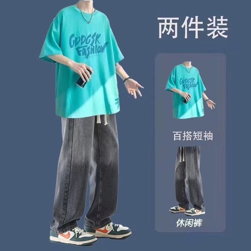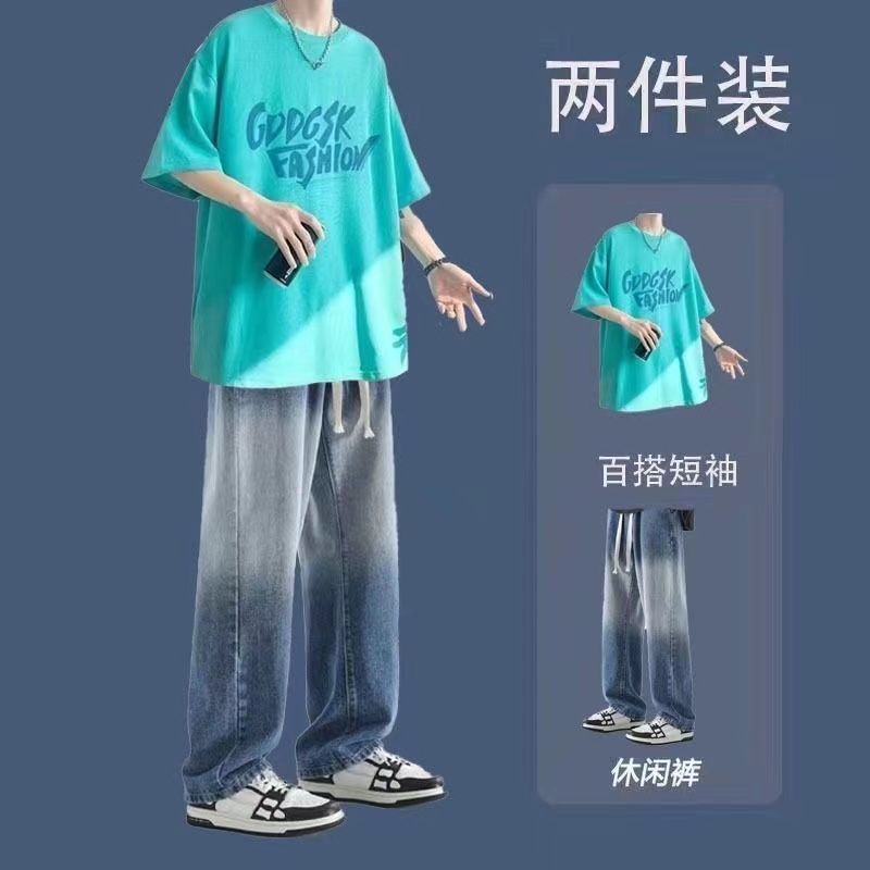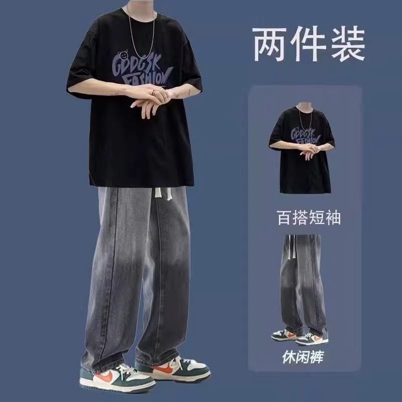 夏季短袖男生休闲套装潮T恤夏季男装一整套搭配直筒牛仔裤两件套