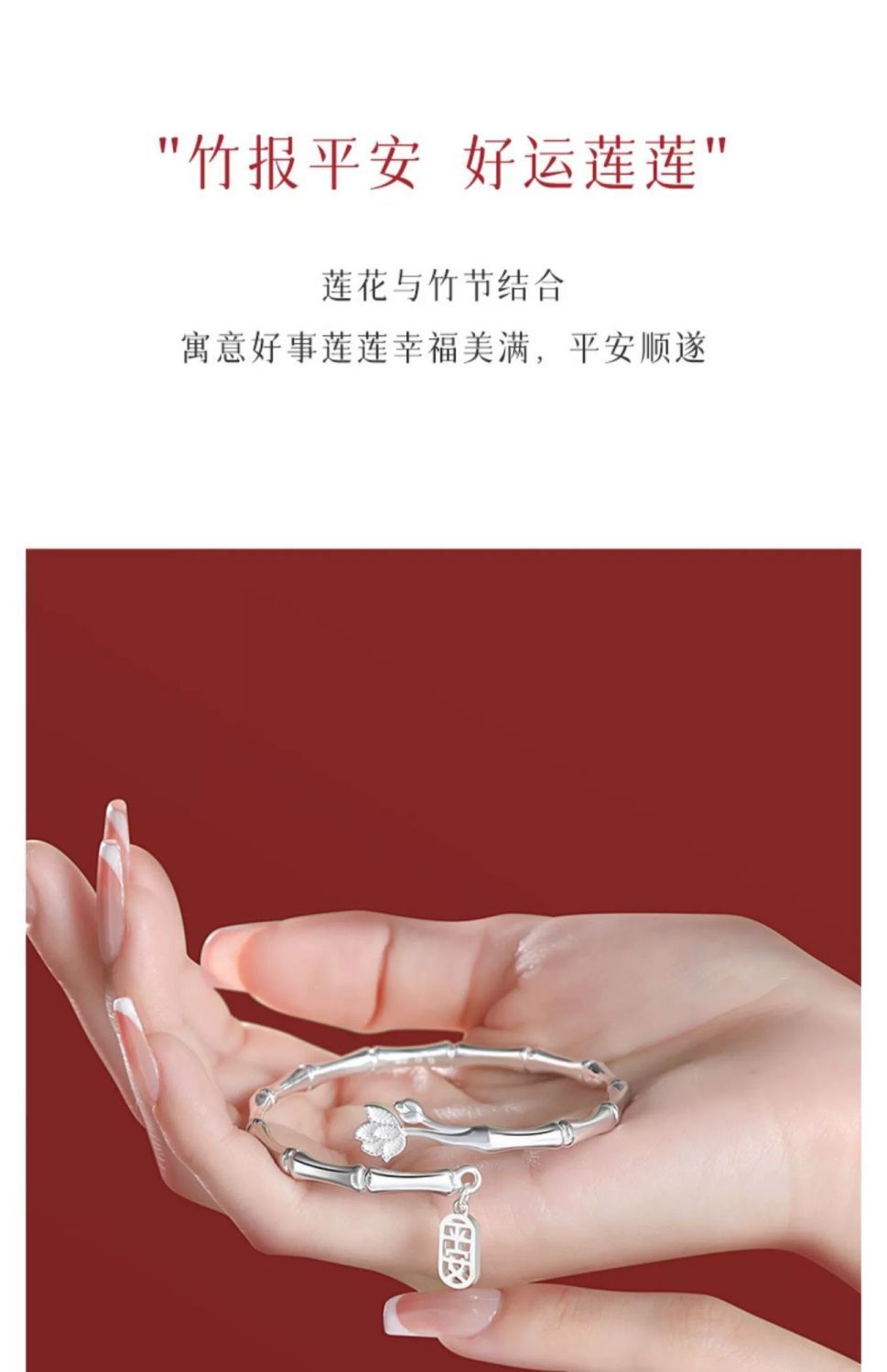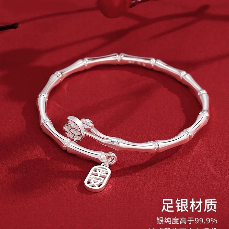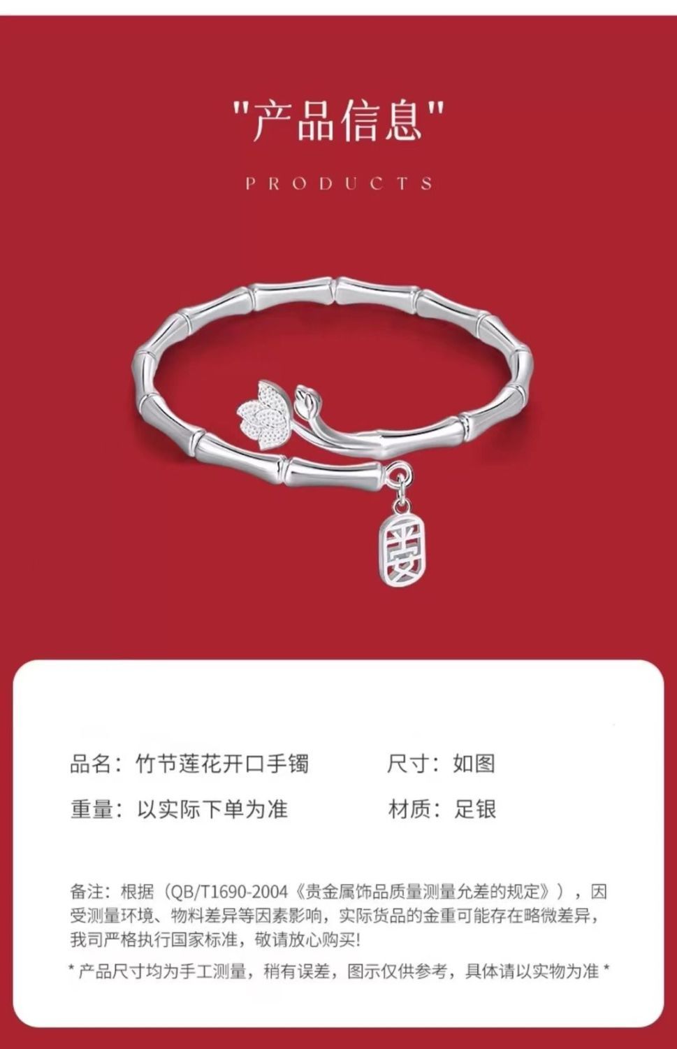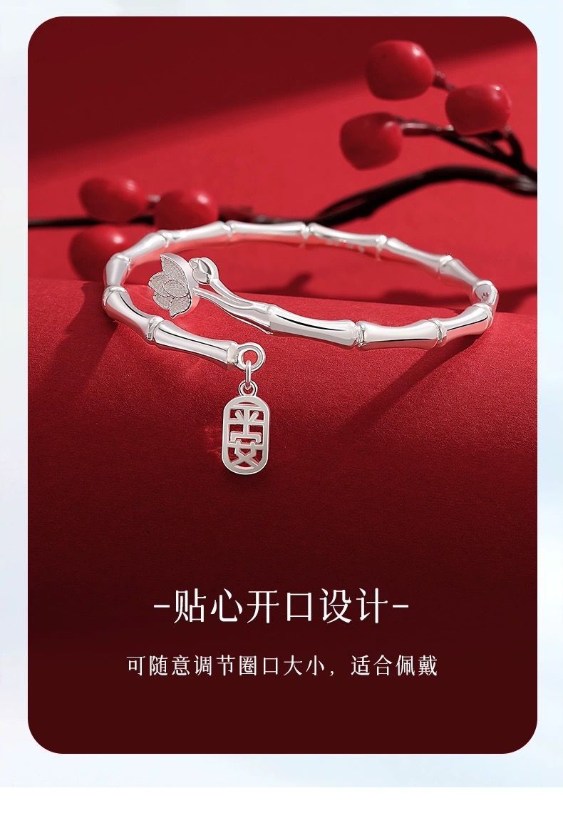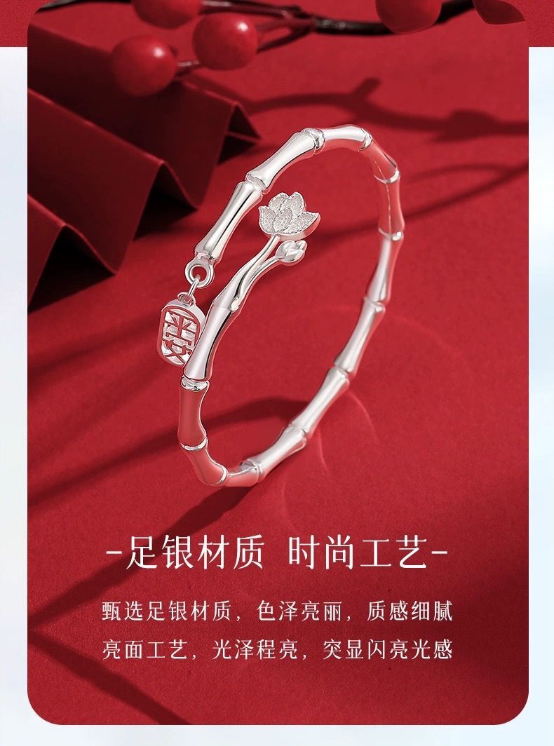 实心足银999平安莲花竹节手镯开口莲蓬银手镯学生手环女生日礼物