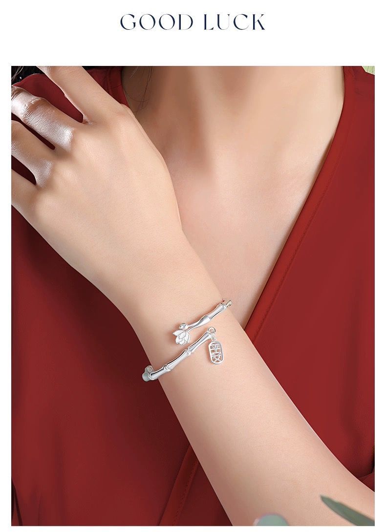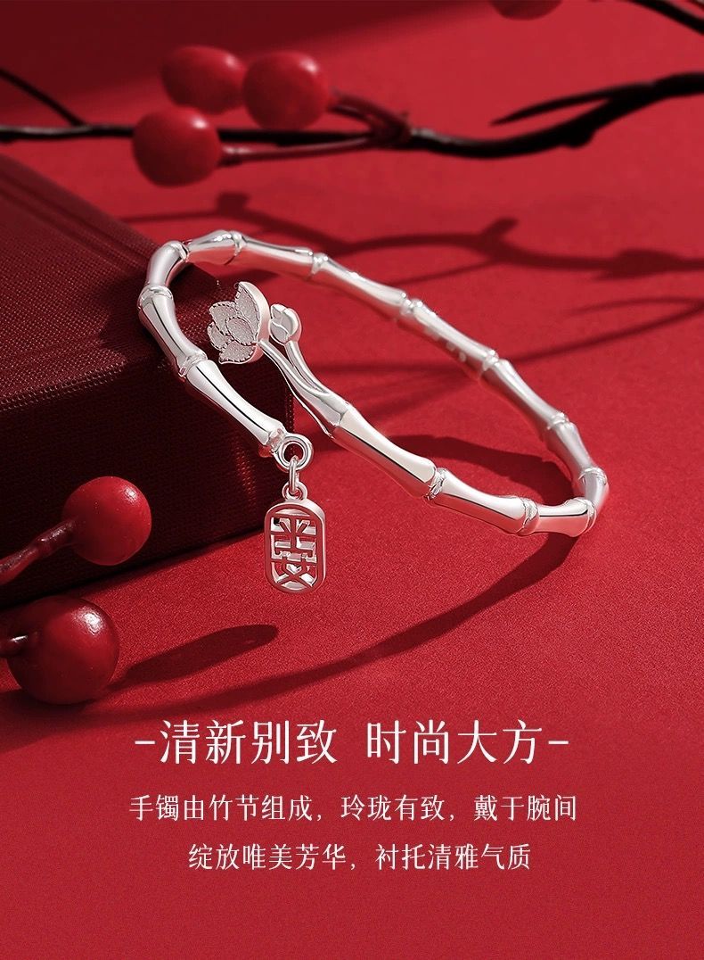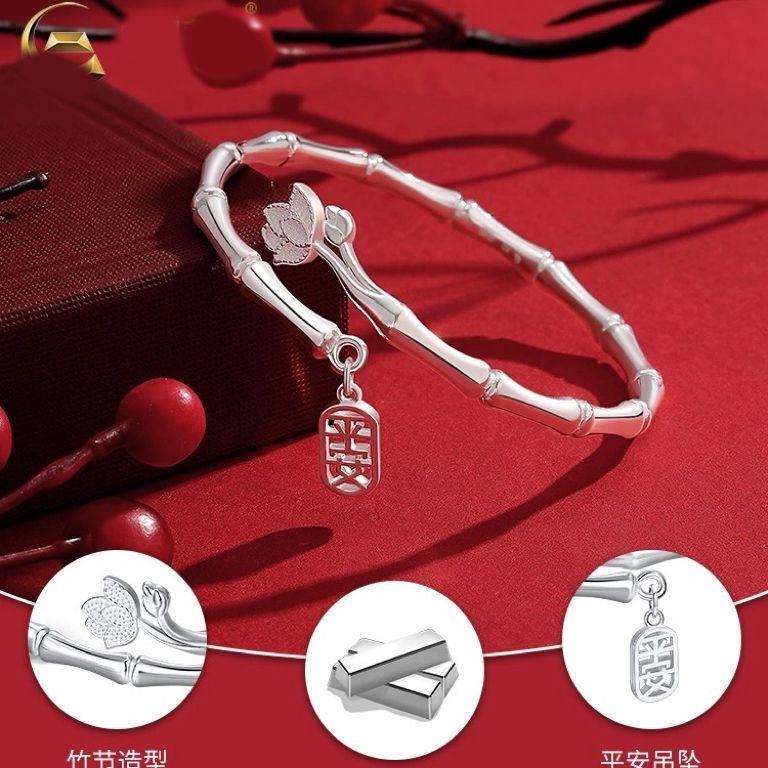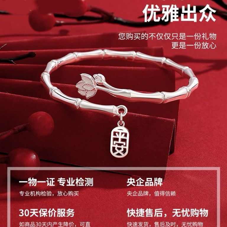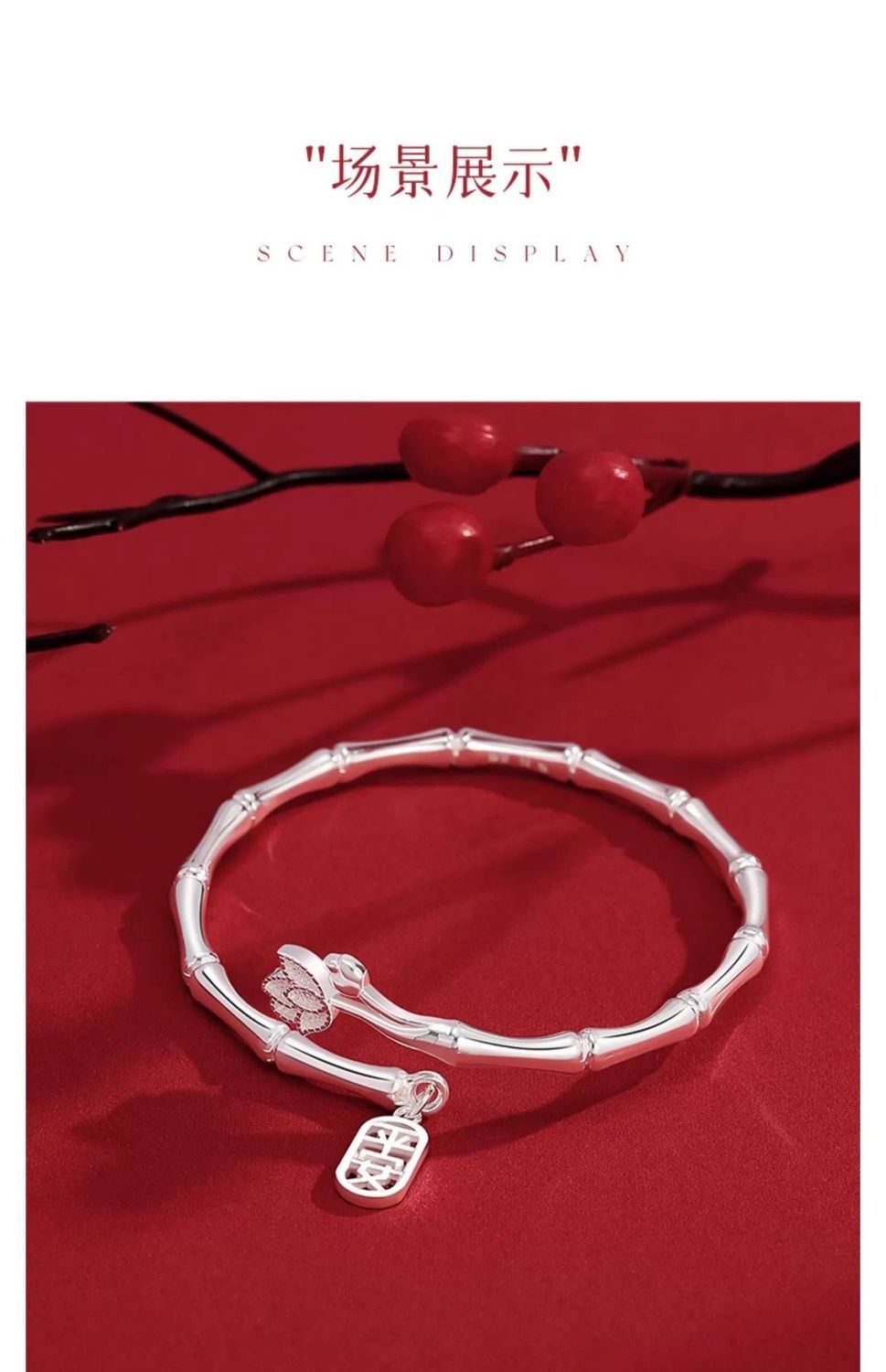实心足银999平安莲花竹节手镯开口莲蓬银手镯学生手环女生日礼物