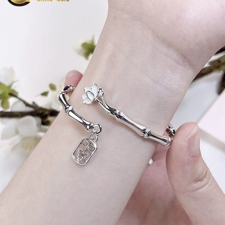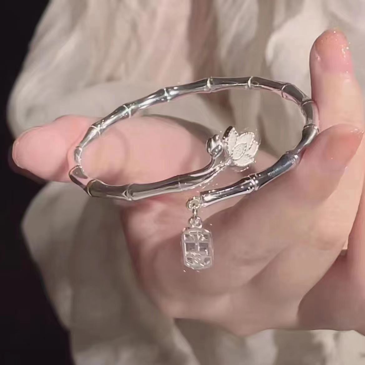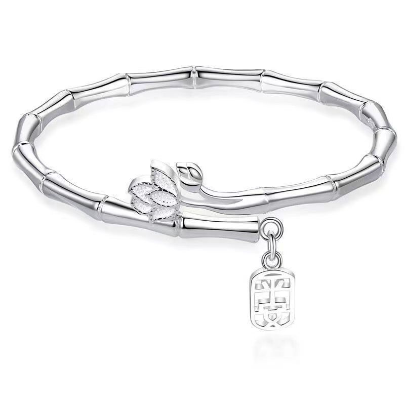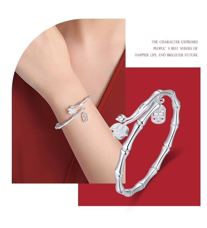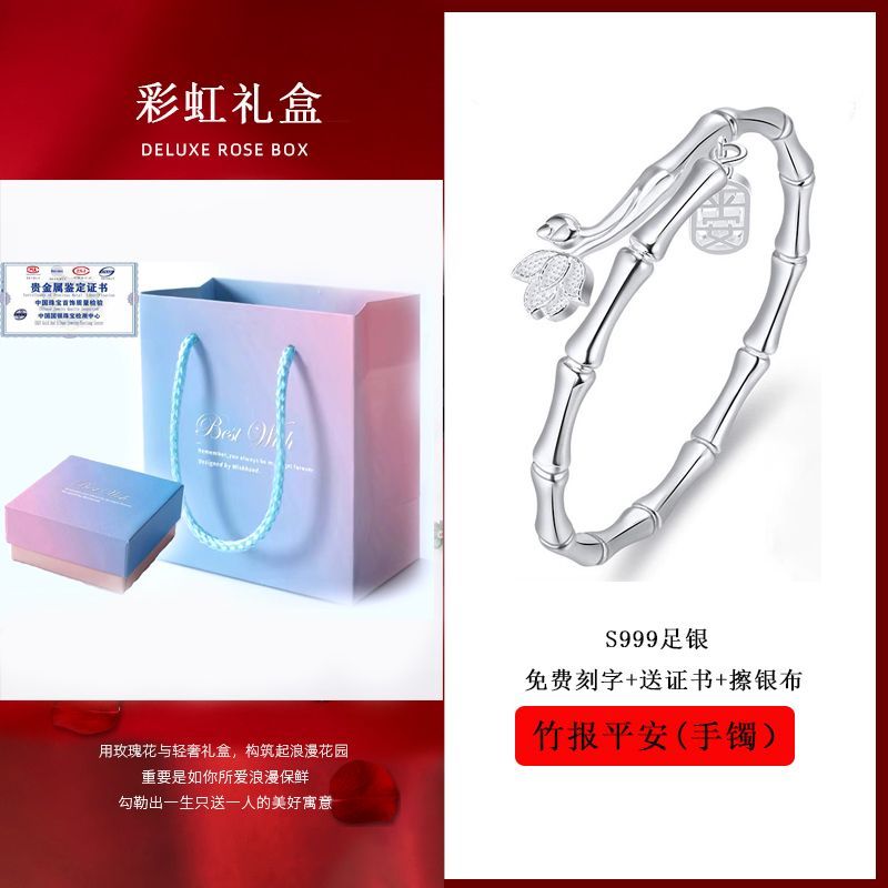 实心足银999平安莲花竹节手镯开口莲蓬银手镯学生手环女生日礼物