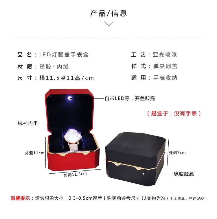 | medium red bag + red led with light flip watch box(中全红袋+红色LED带灯翻盖手表盒) | USD $10.66 | 999999 piece available |