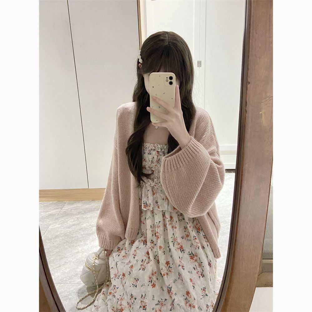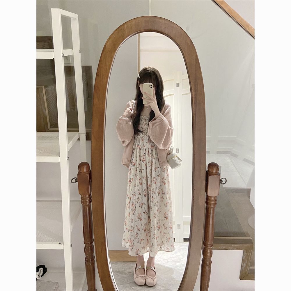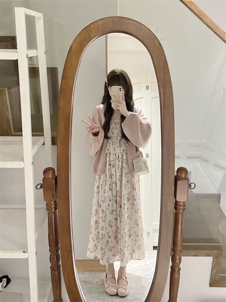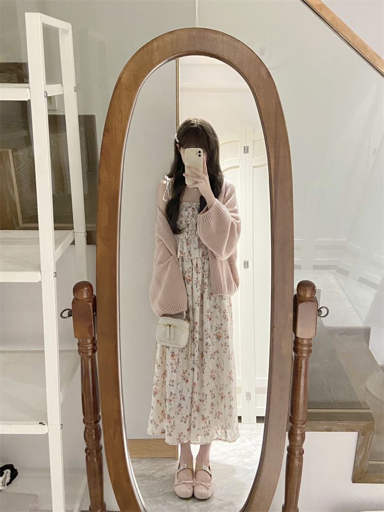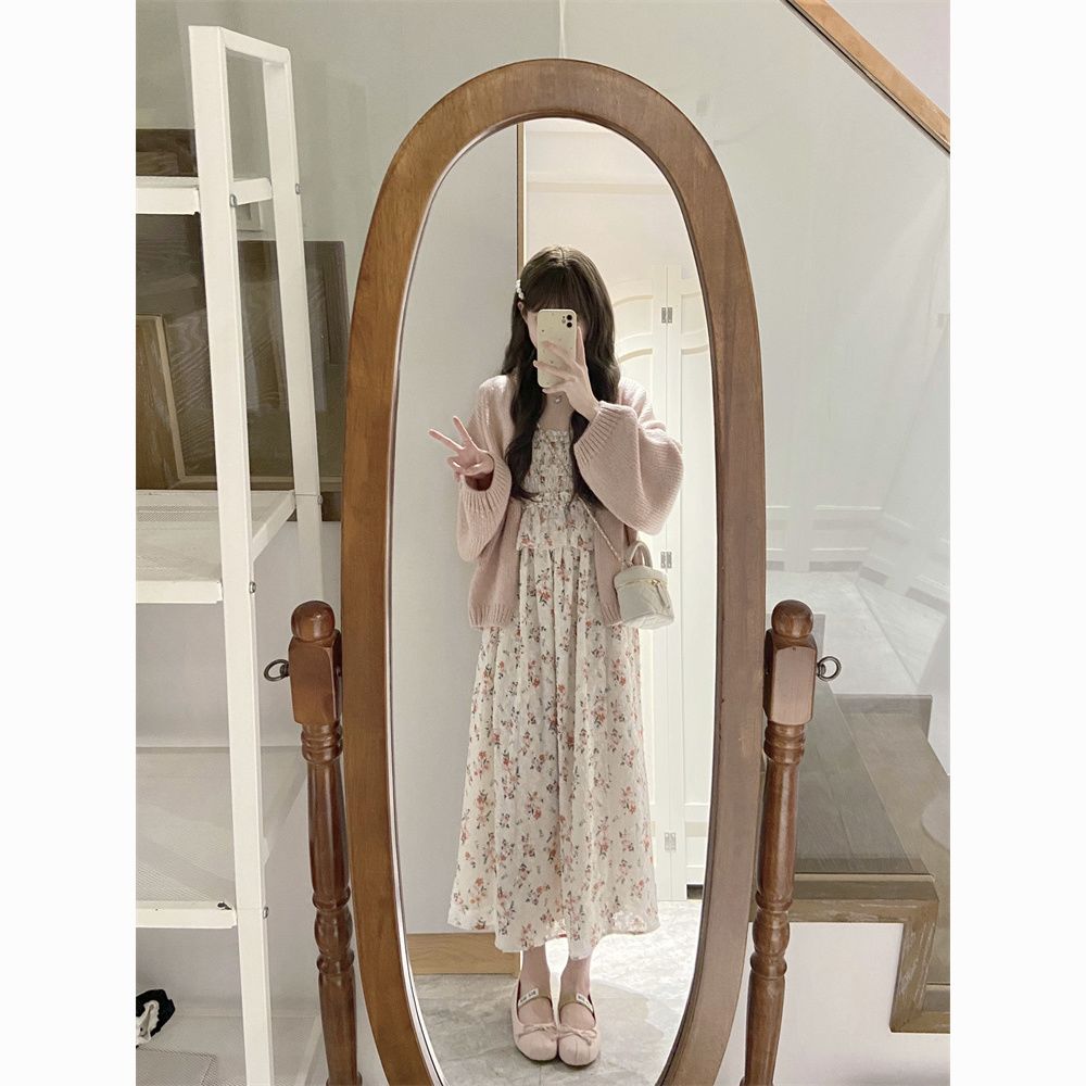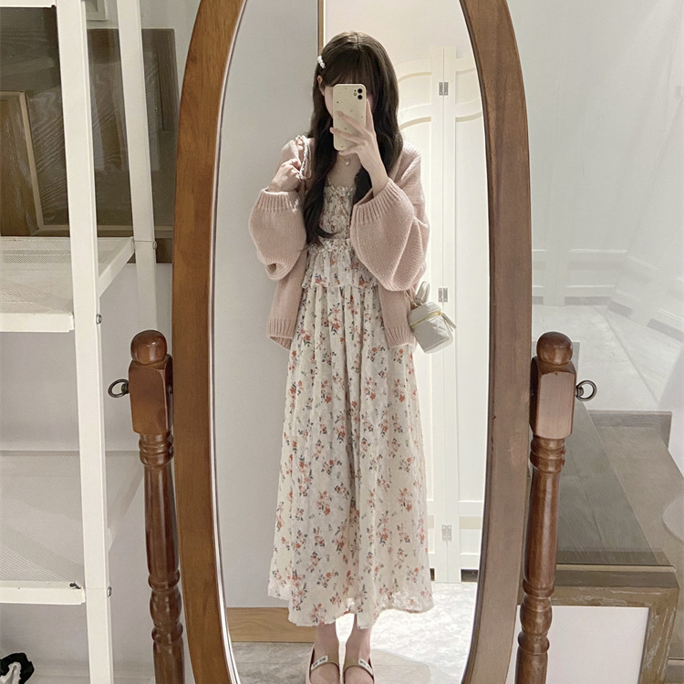 日系软妹吊带碎花连衣裙子女学生+甜美慵懒风毛衣开衫两件套装【7