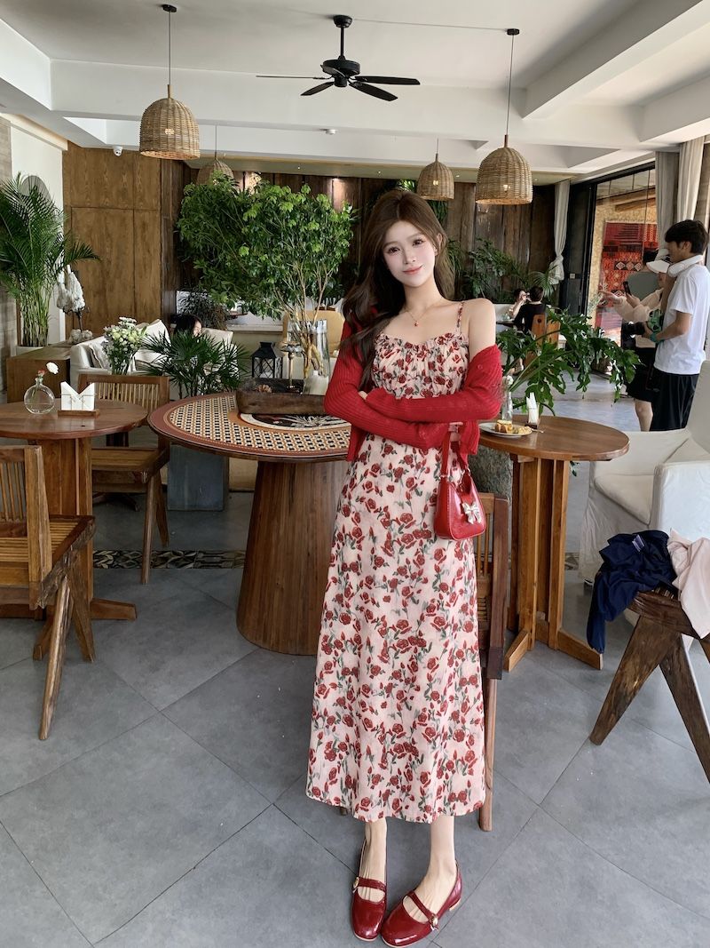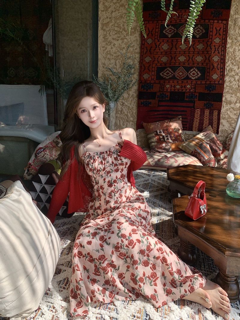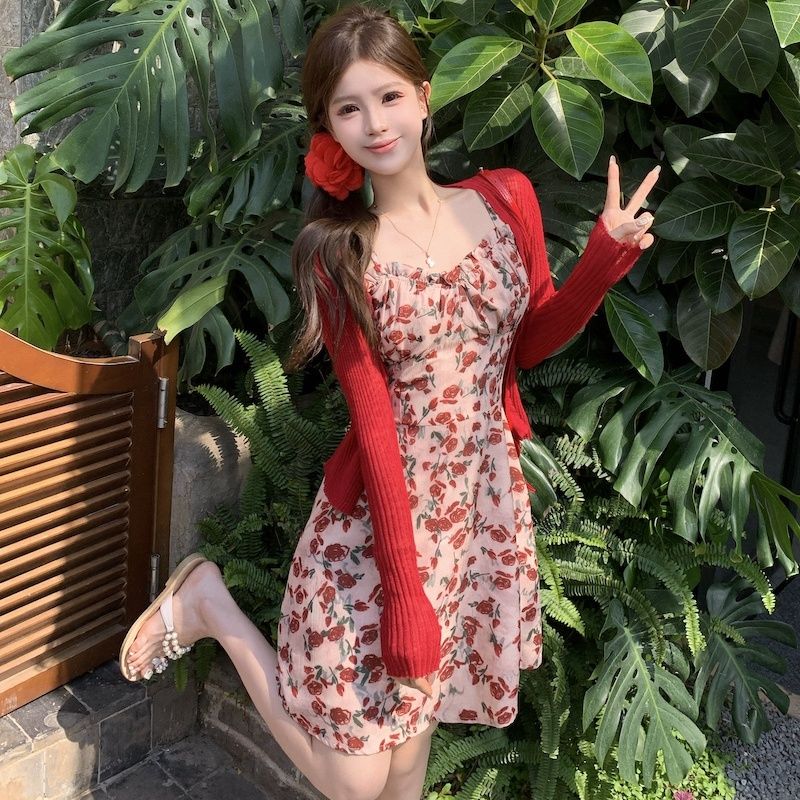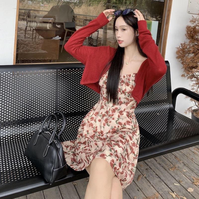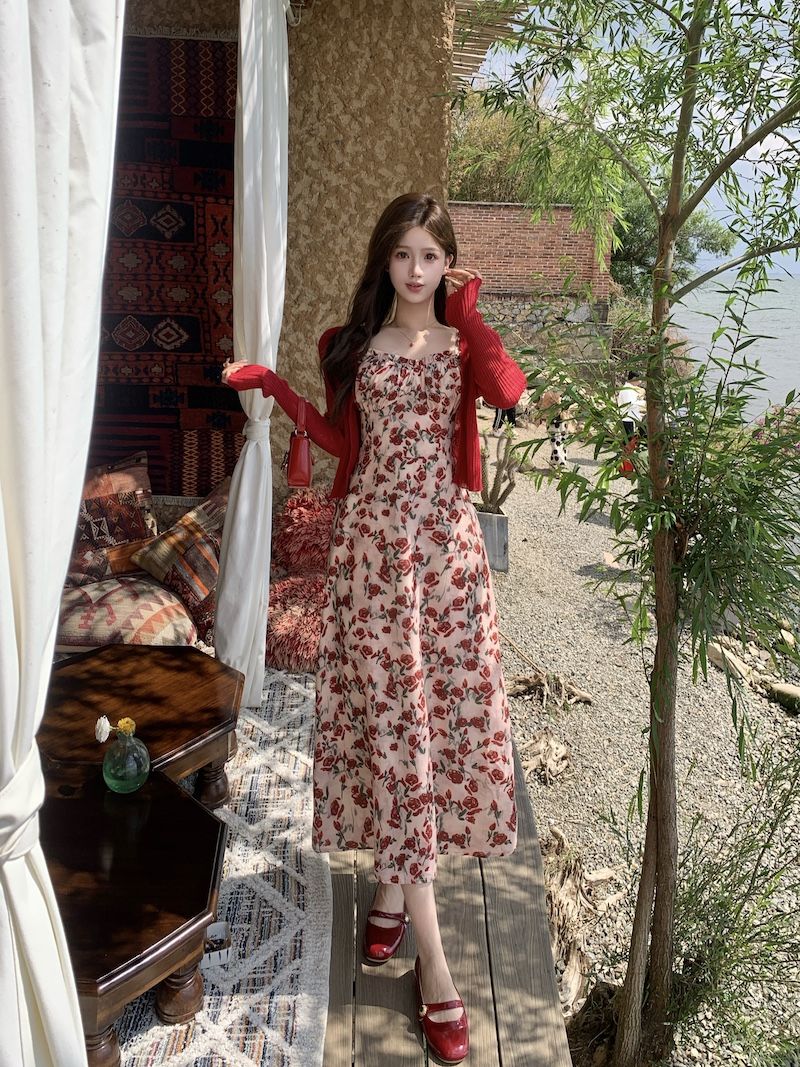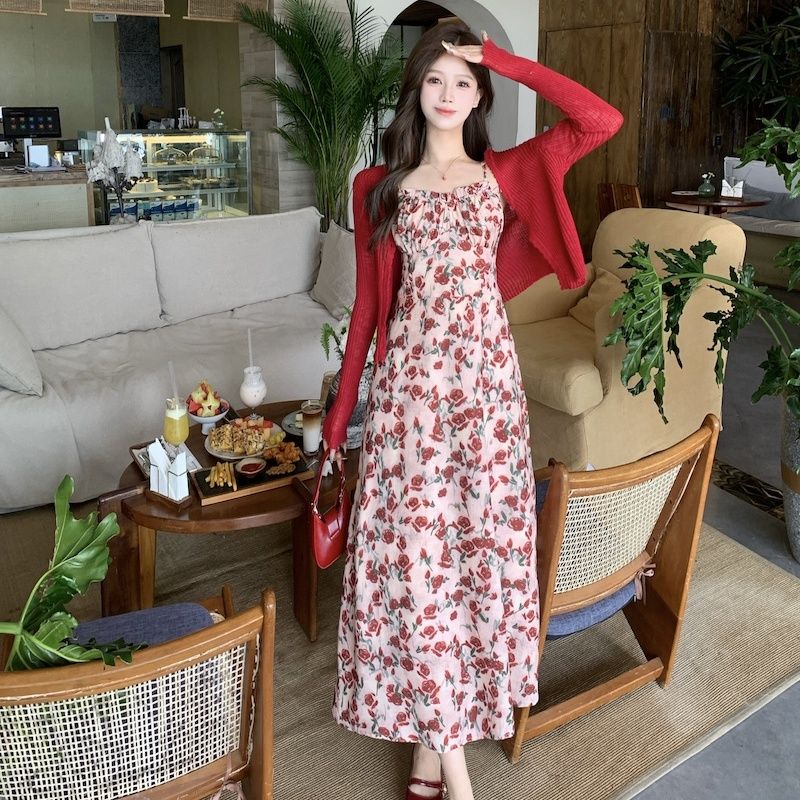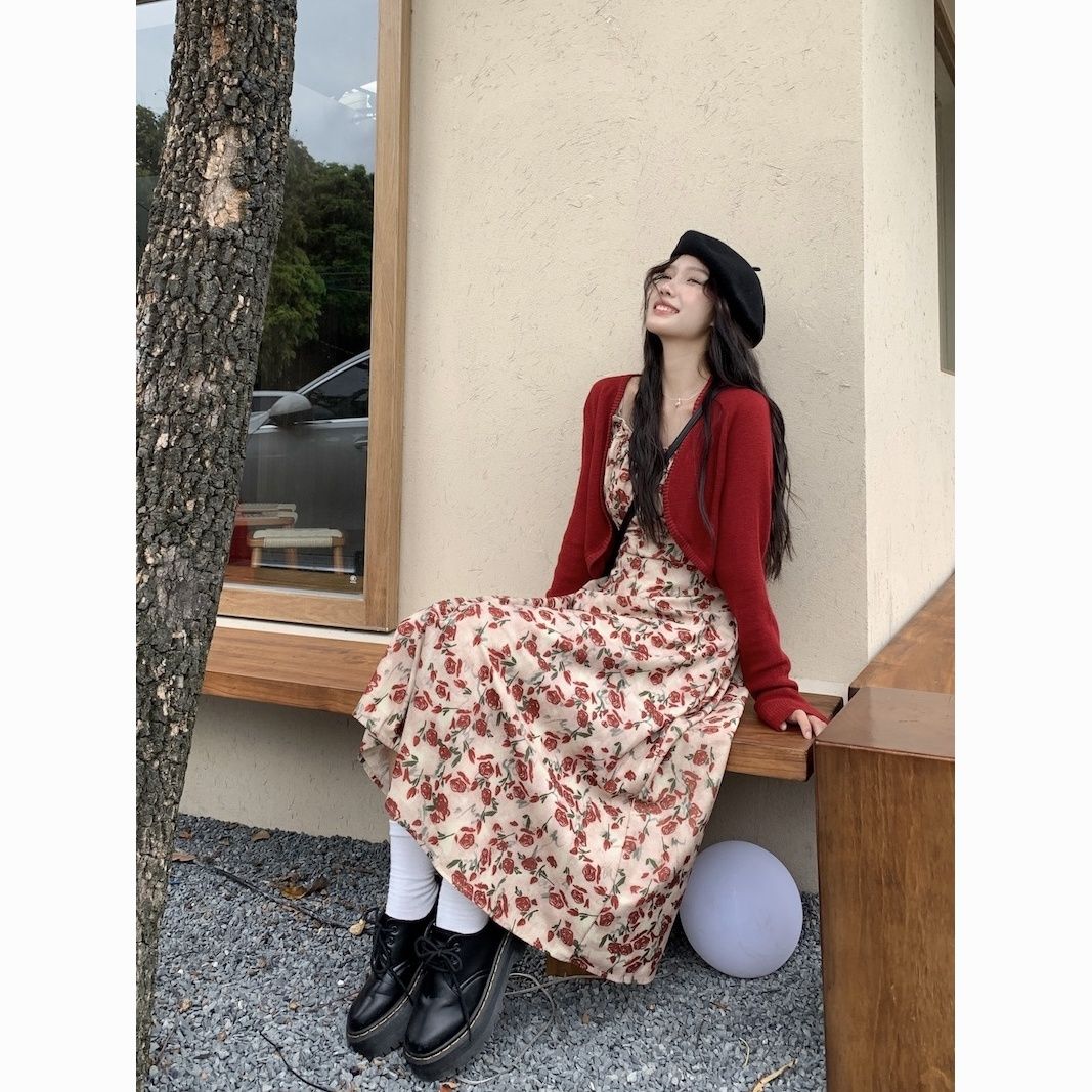 甜美碎花吊带长裙针织外搭套装裙子早春新款打底灯芯绒连衣裙女装