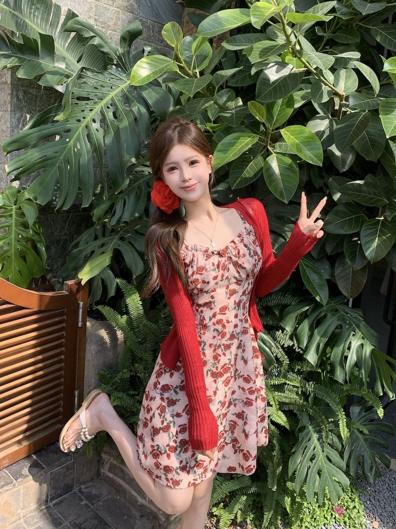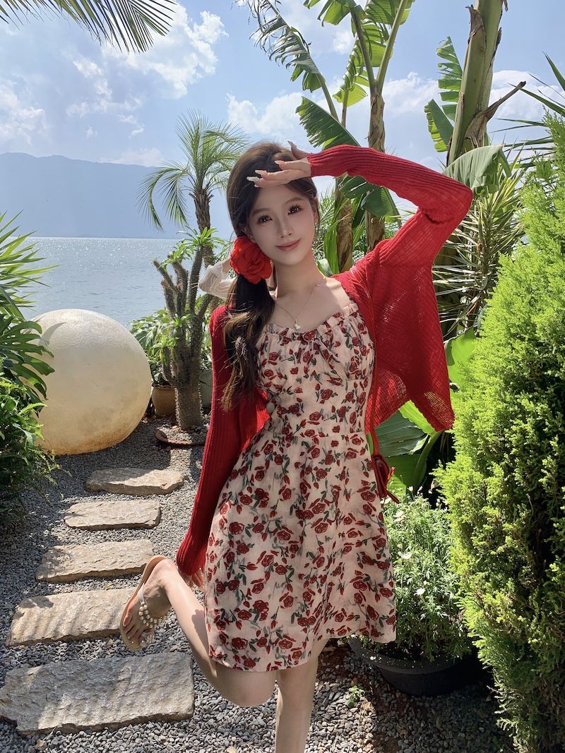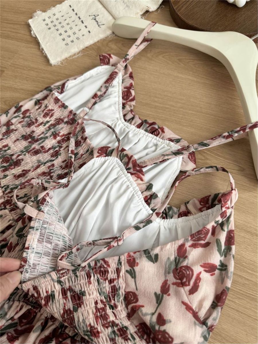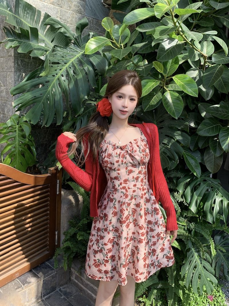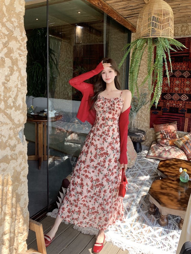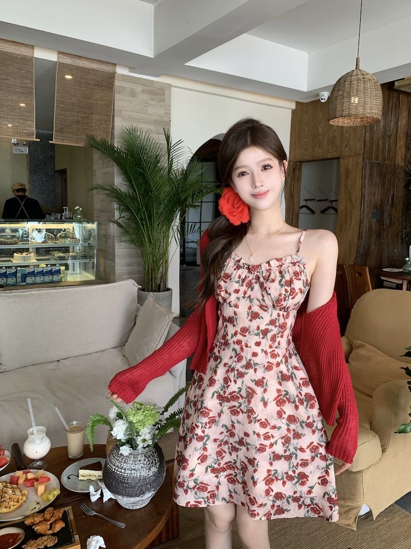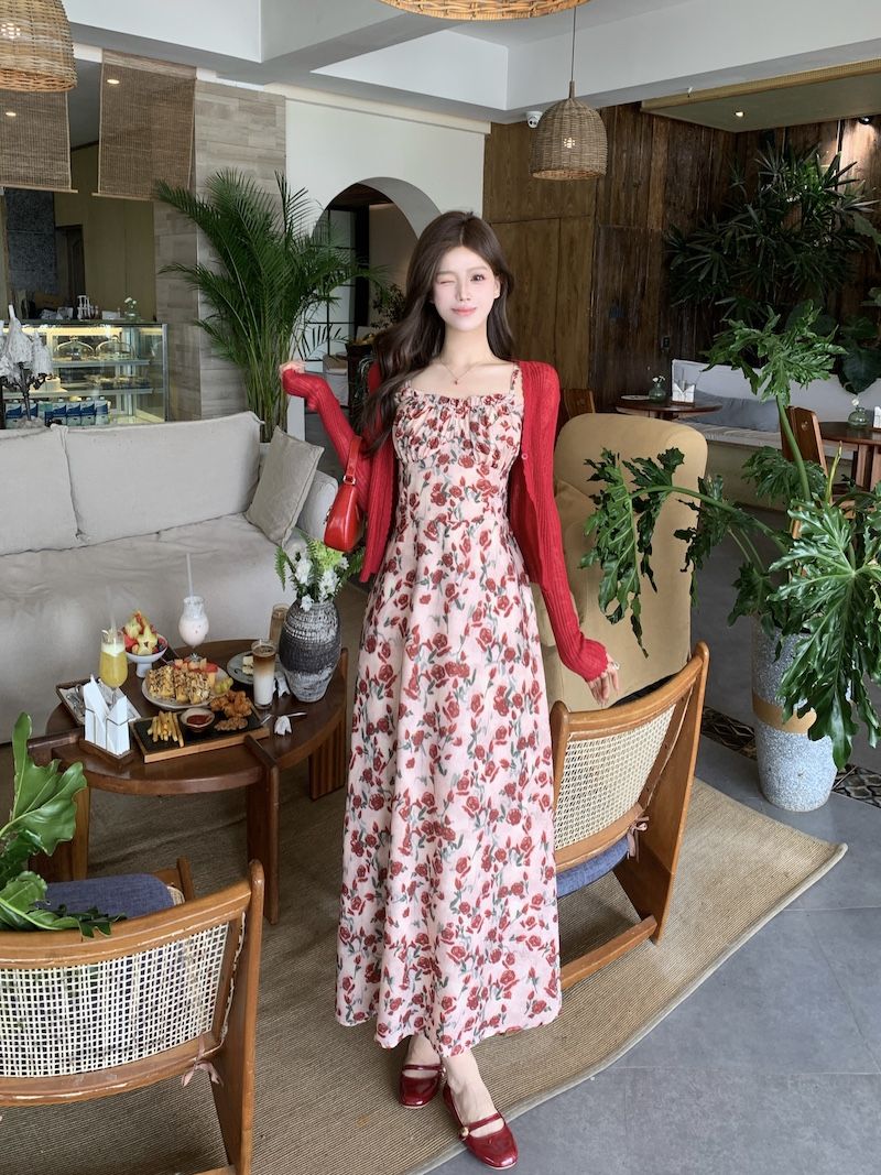 甜美碎花吊带长裙针织外搭套装裙子早春新款打底灯芯绒连衣裙女装