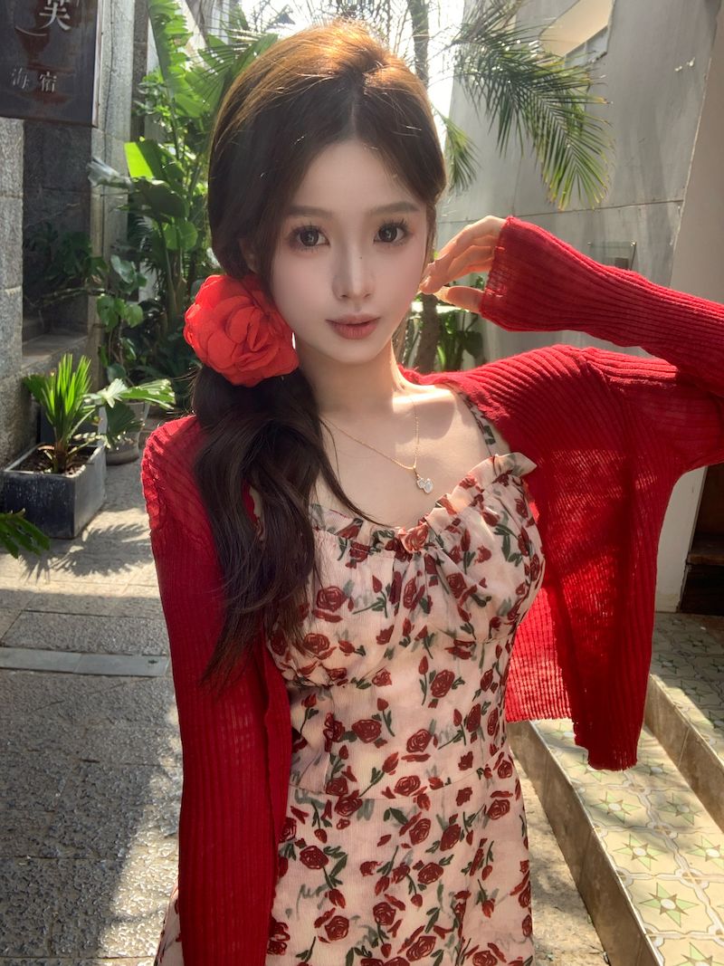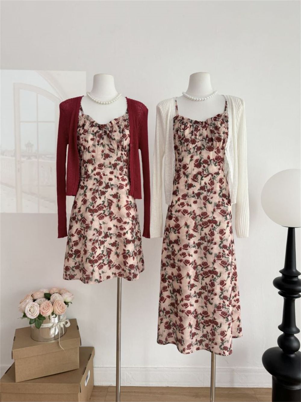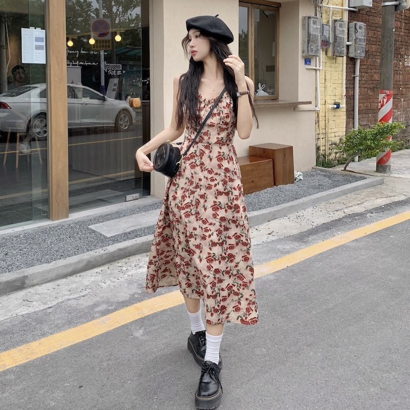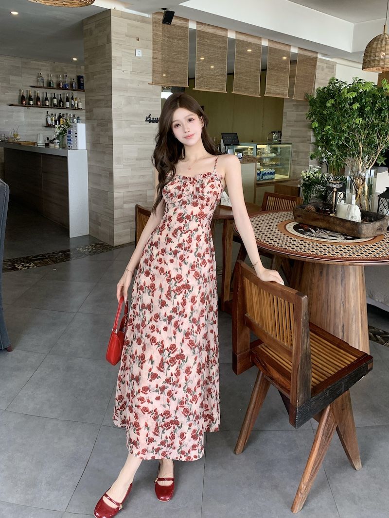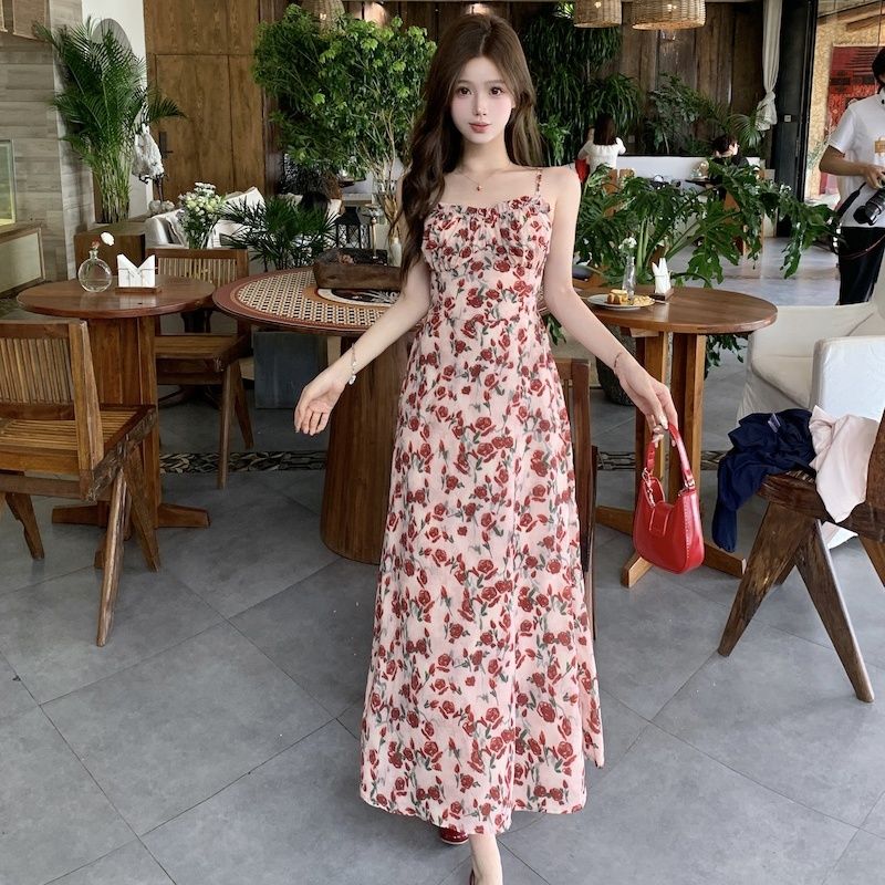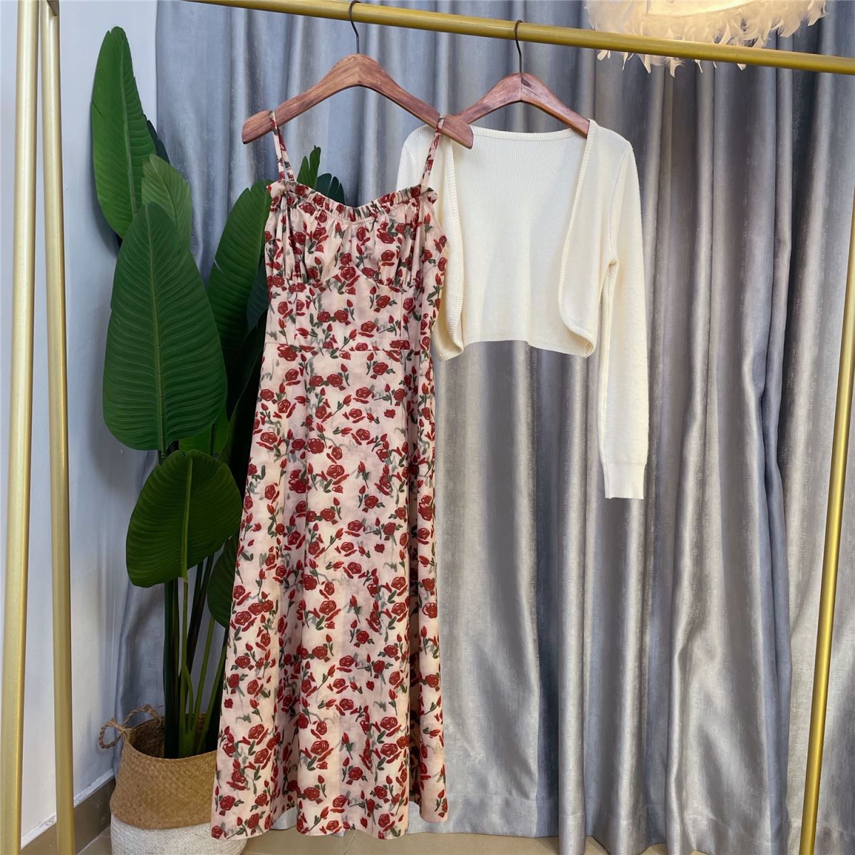 甜美碎花吊带长裙针织外搭套装裙子早春新款打底灯芯绒连衣裙女装