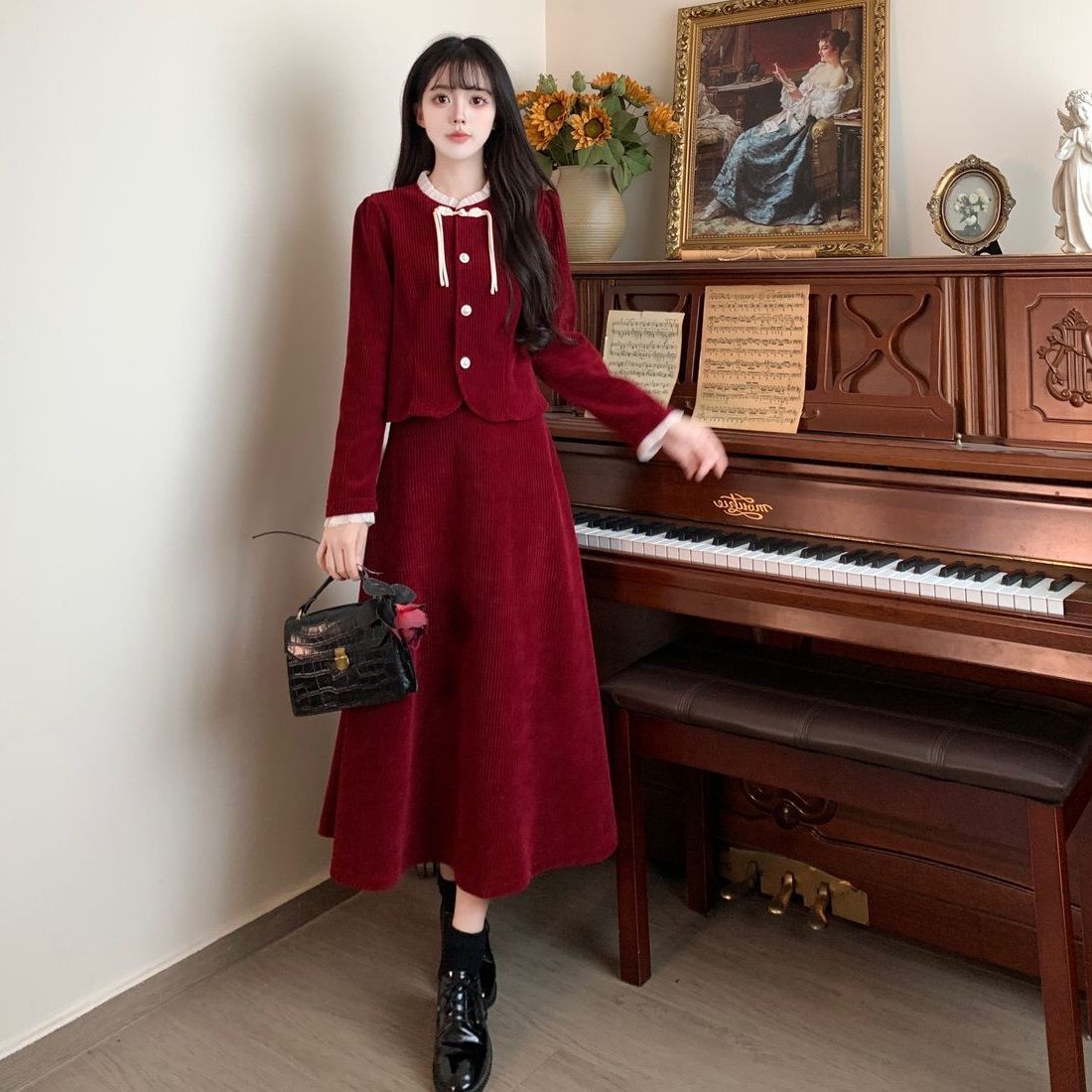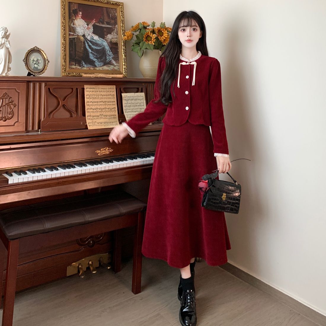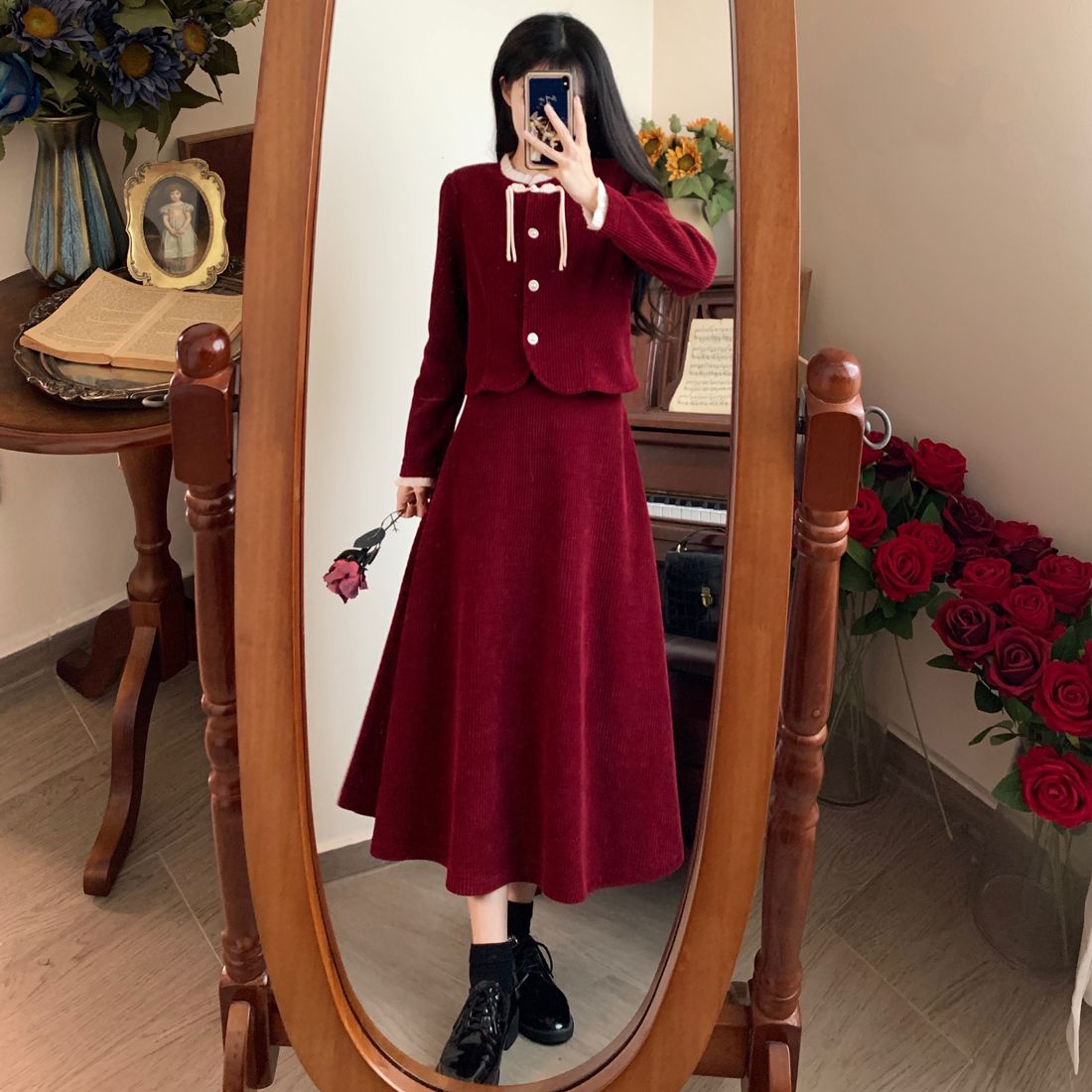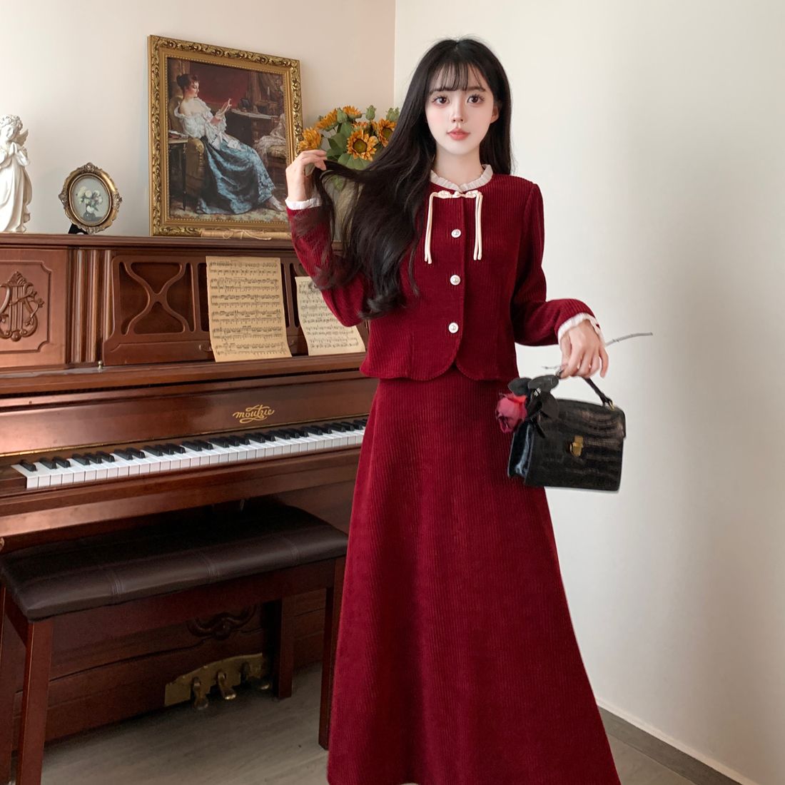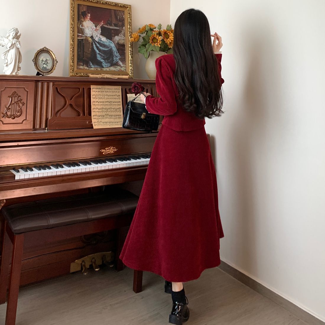 法式小香风灯芯绒套装裙秋冬大码撞色外套半身裙两件套红色连衣裙