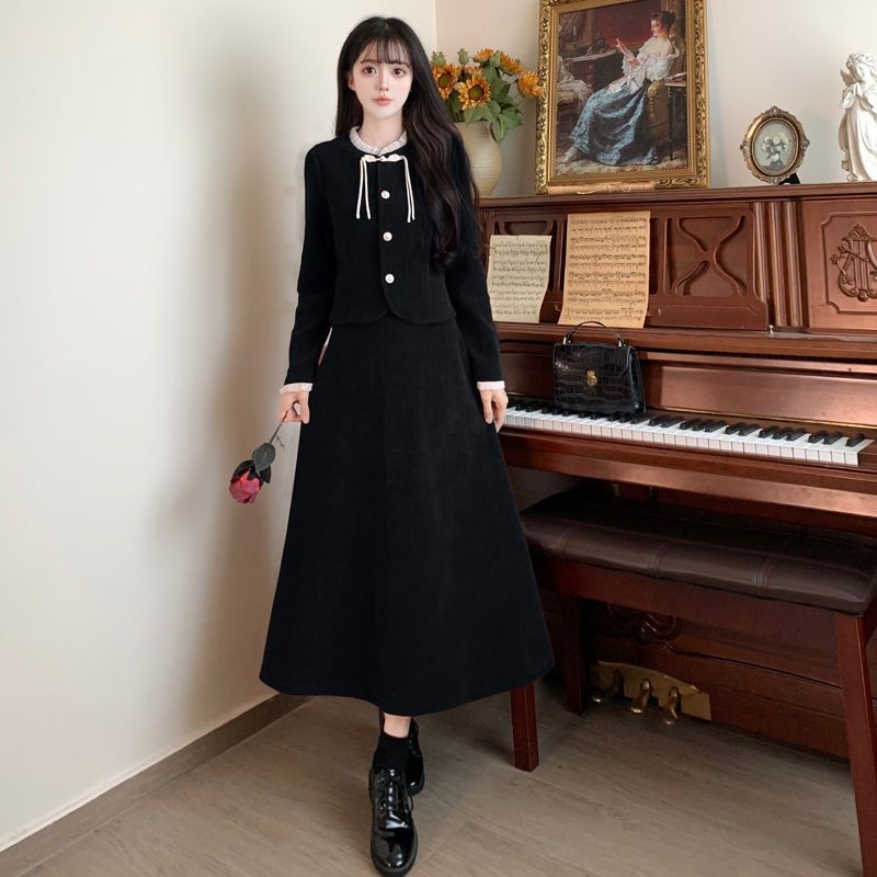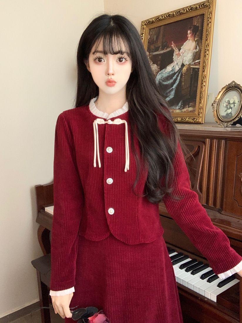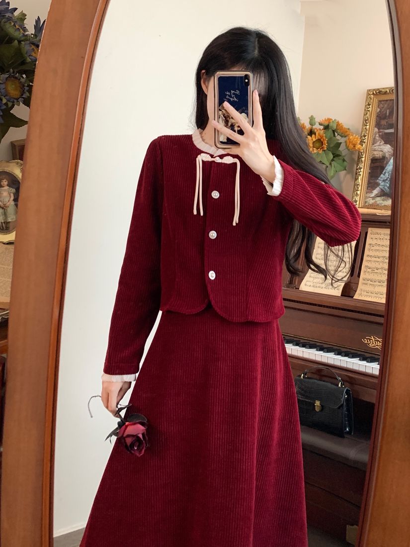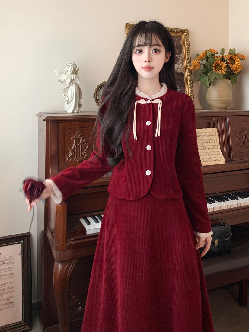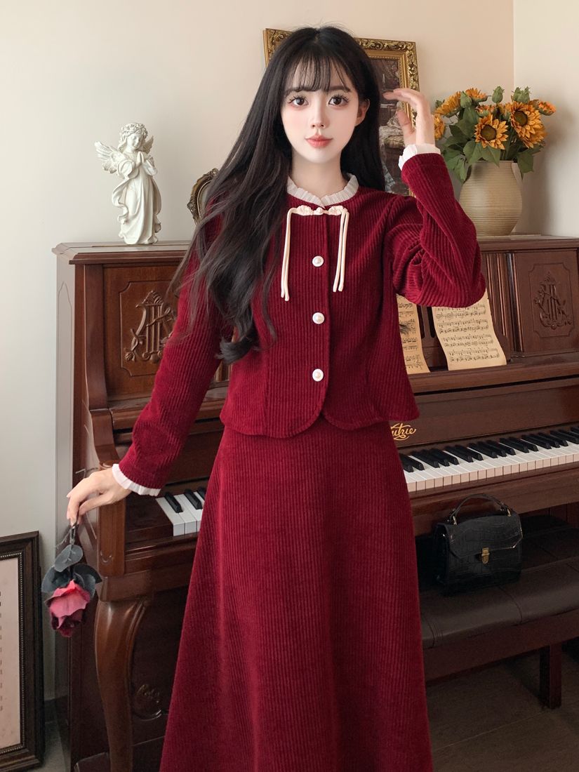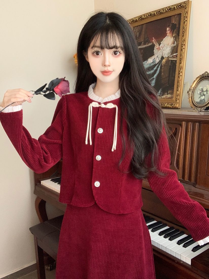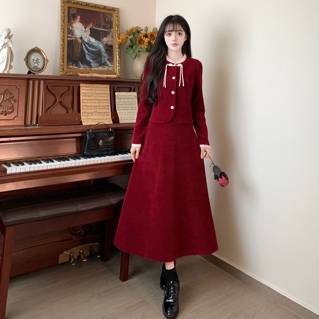 法式小香风灯芯绒套装裙秋冬大码撞色外套半身裙两件套红色连衣裙