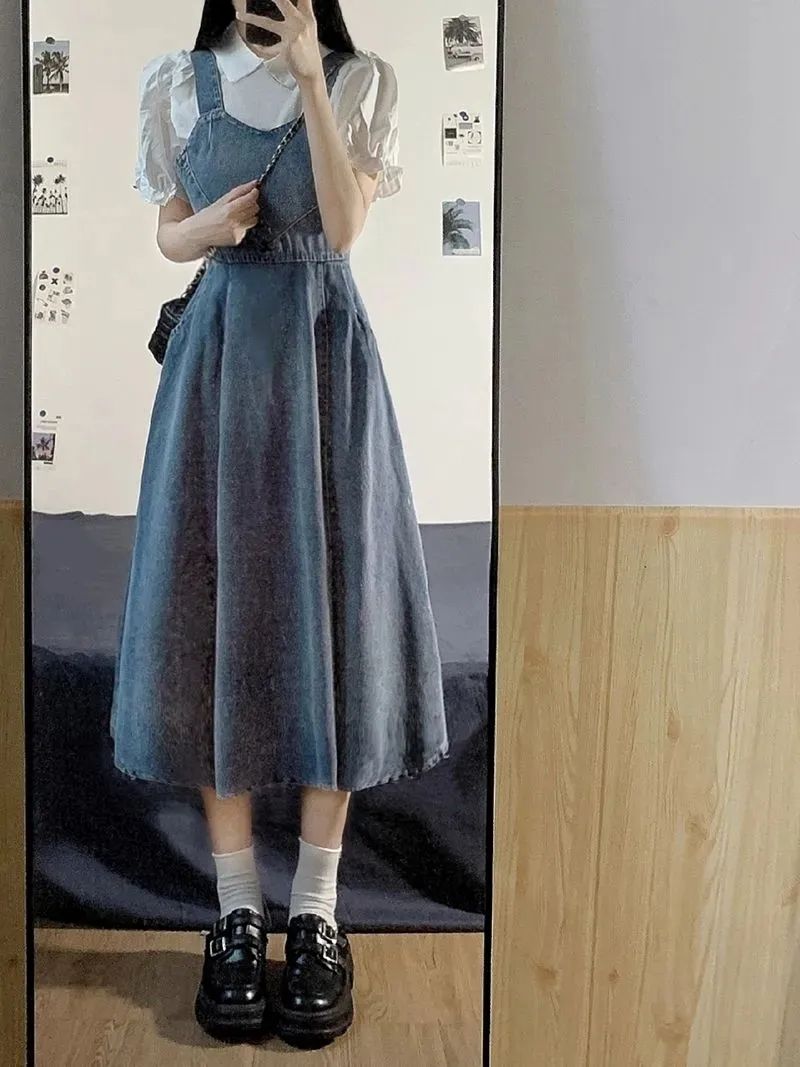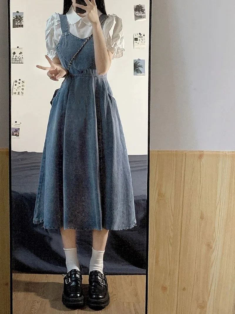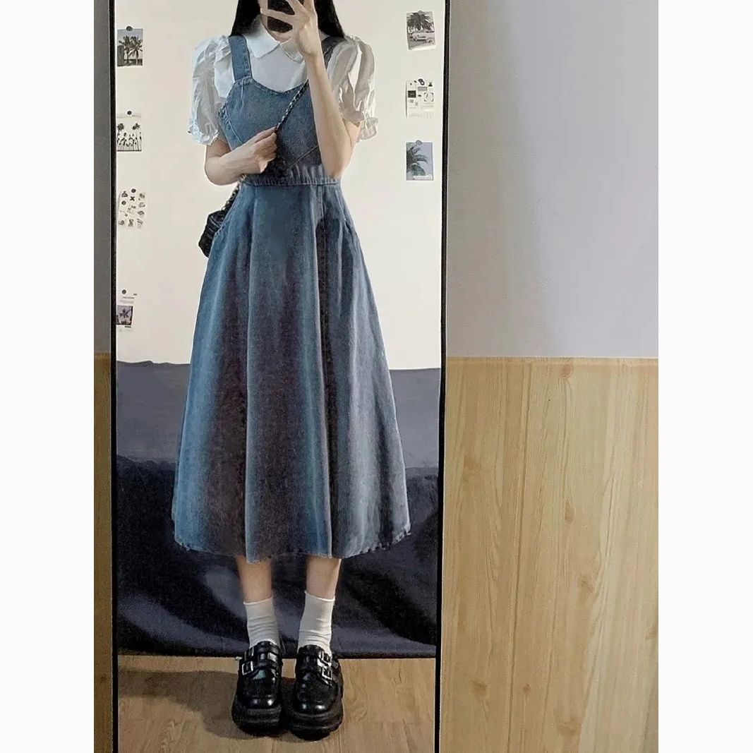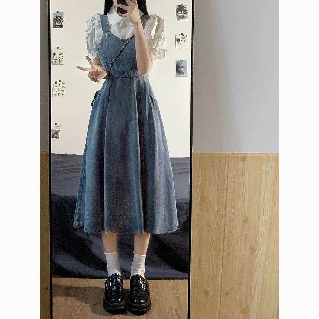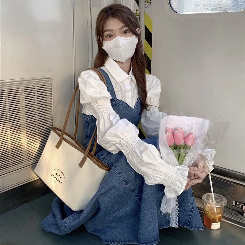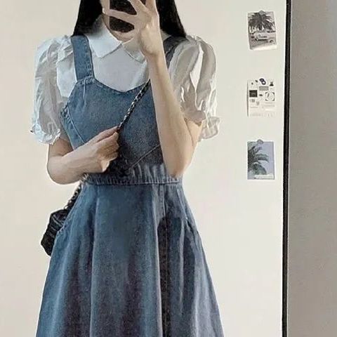 法式小众泡泡袖高级感衬衫小香风牛仔背带裙纯欲风清新气质套装