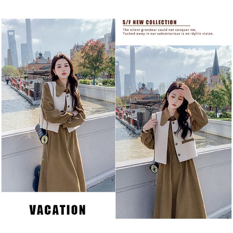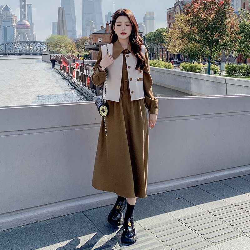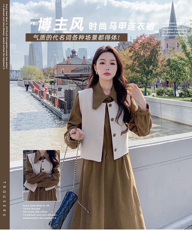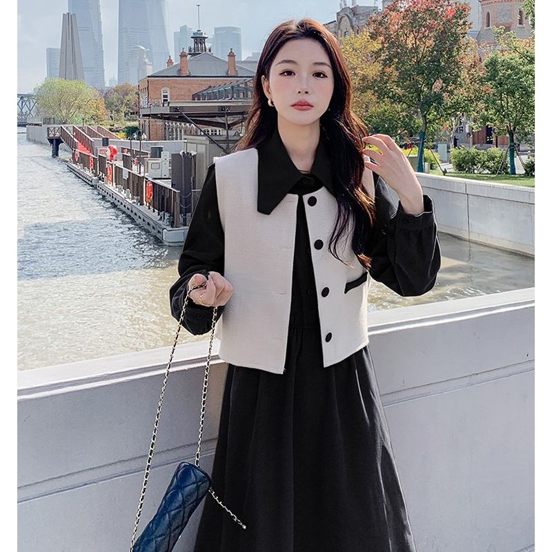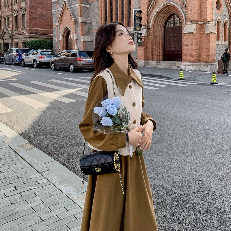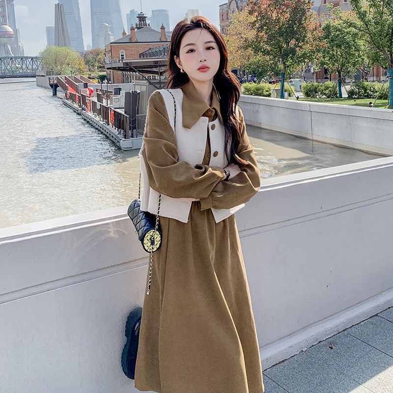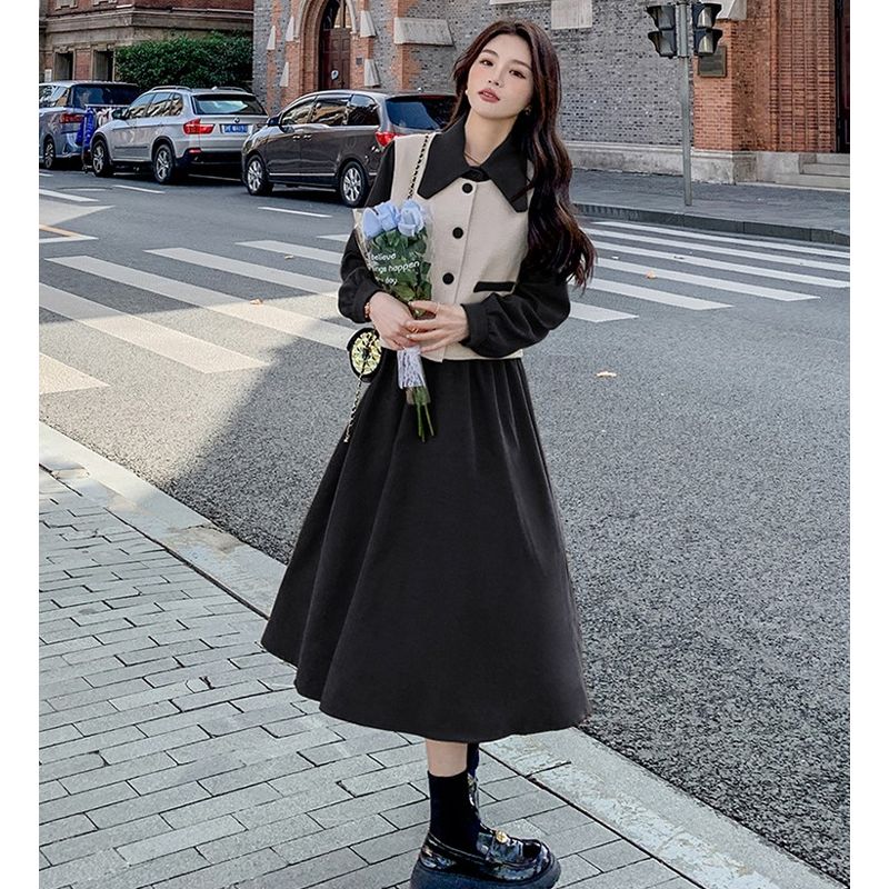 今年流行连衣裙套装女冬2024新款长袖美拉德穿搭马甲衬衫裙两件套