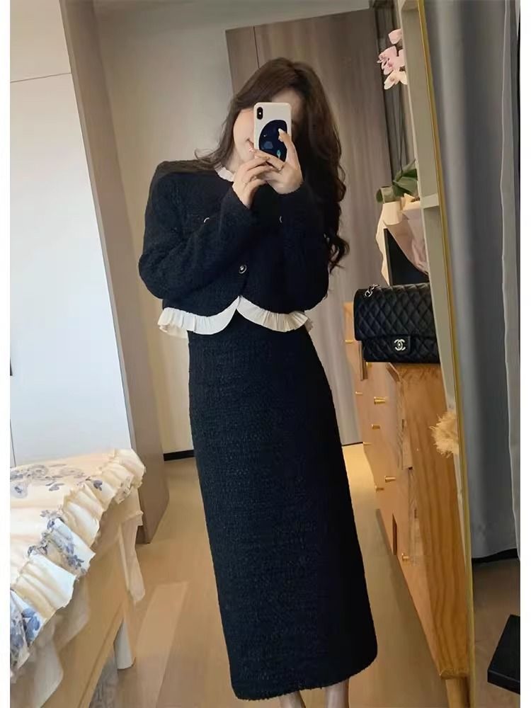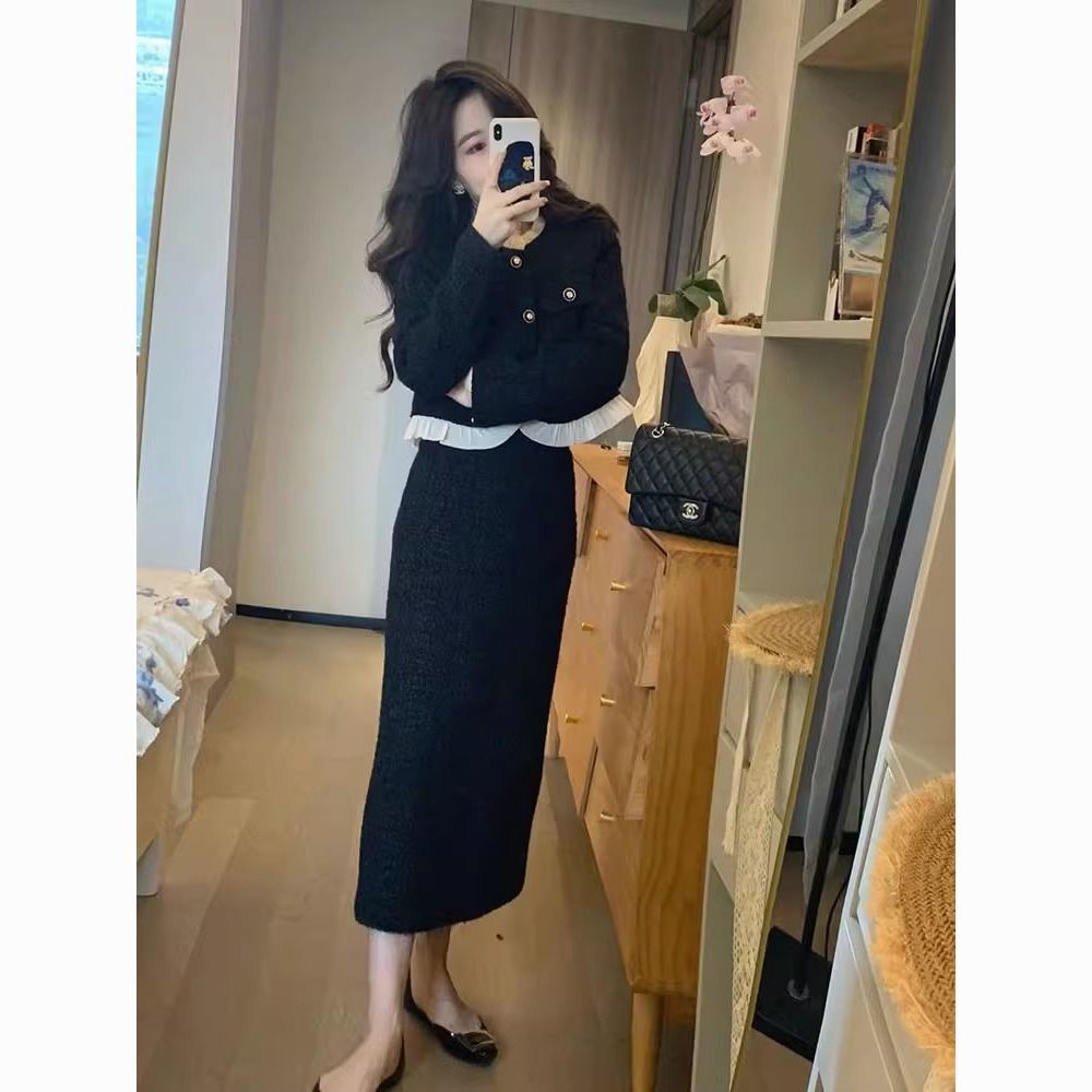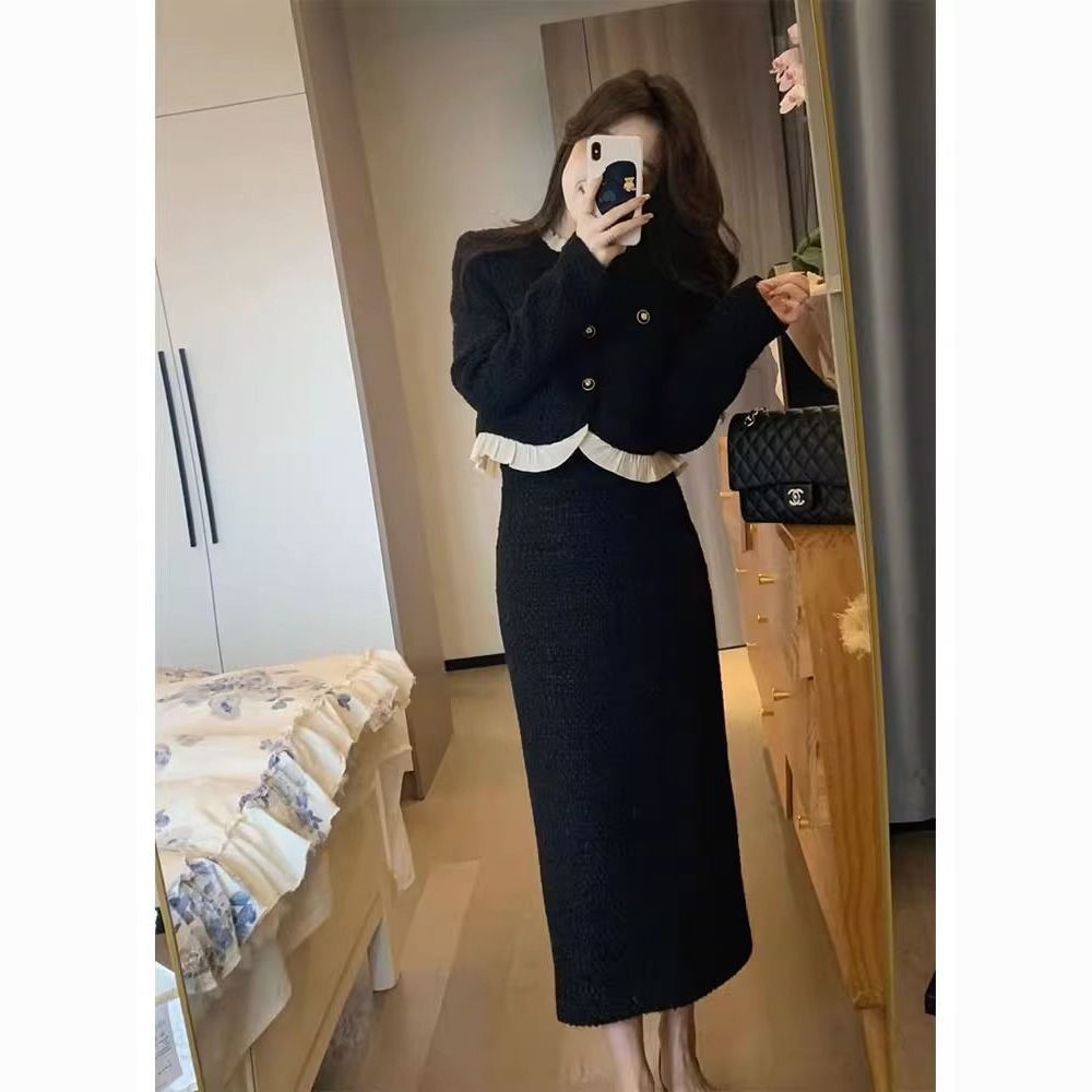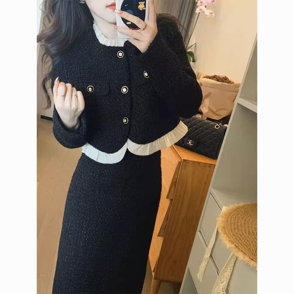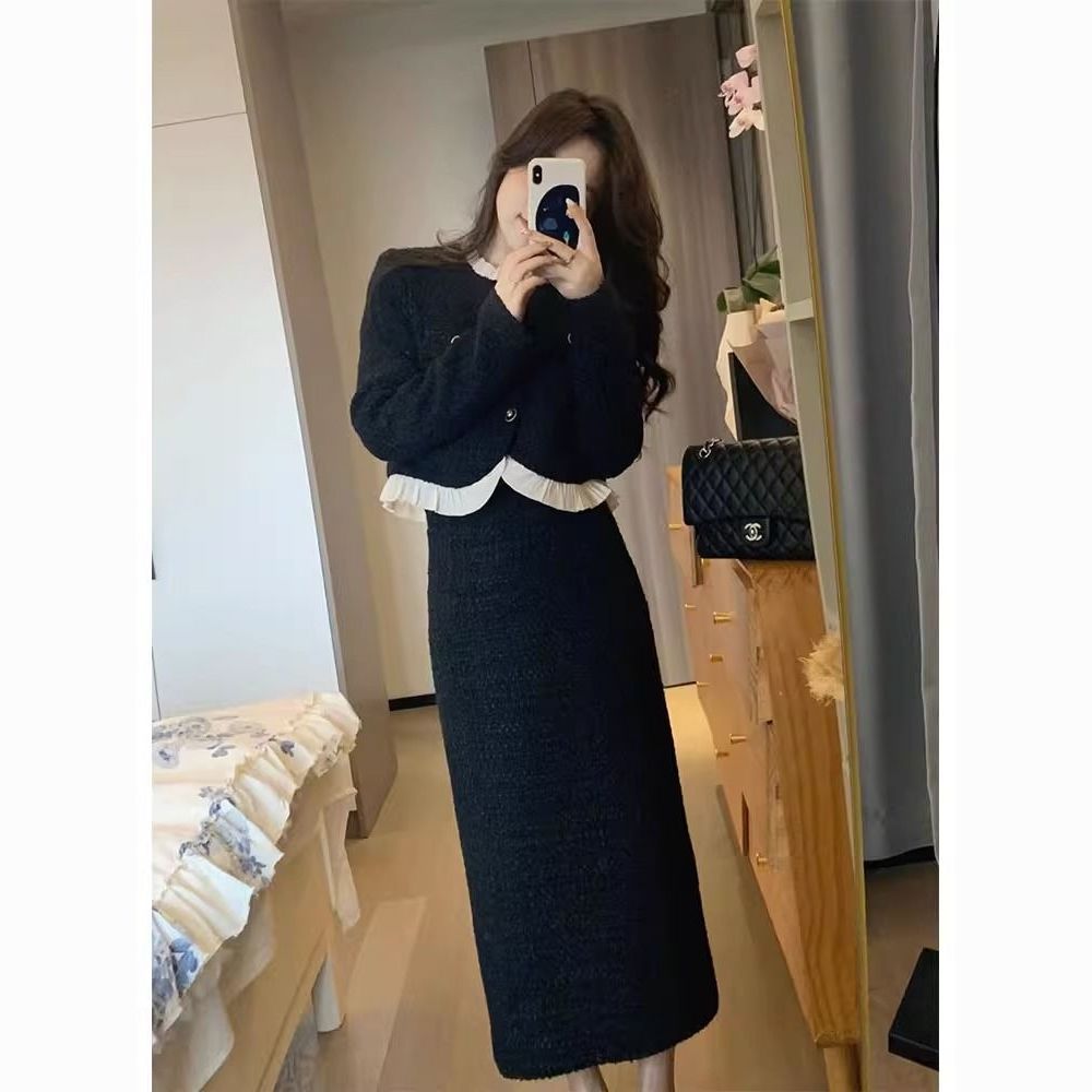 韩系复古时尚气质显瘦小众高级感冷淡小香风黑色连衣裙子加绒套装