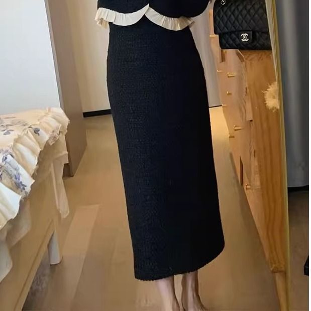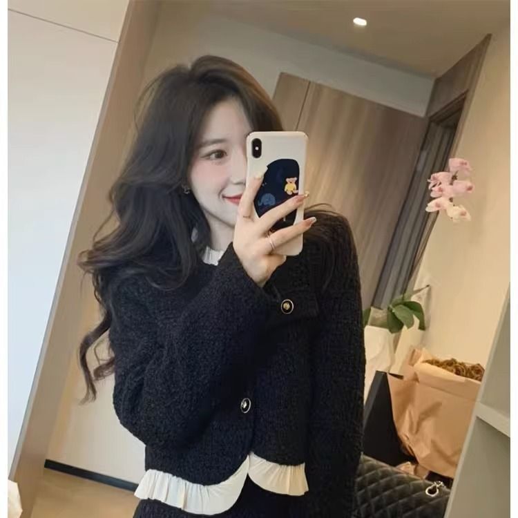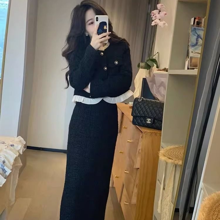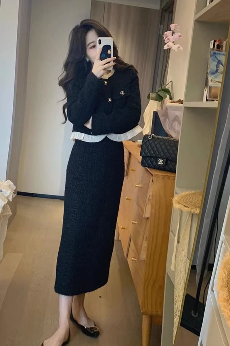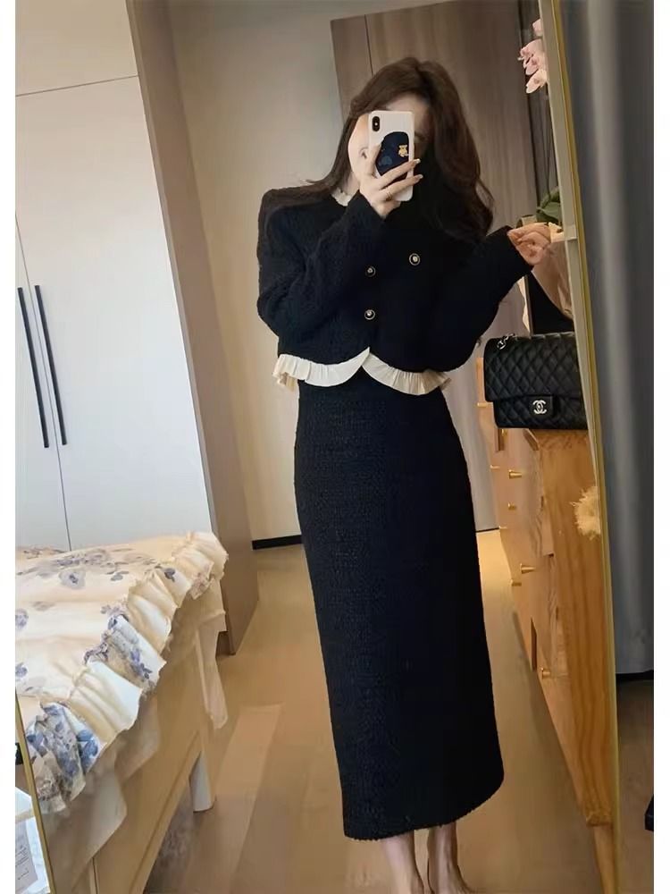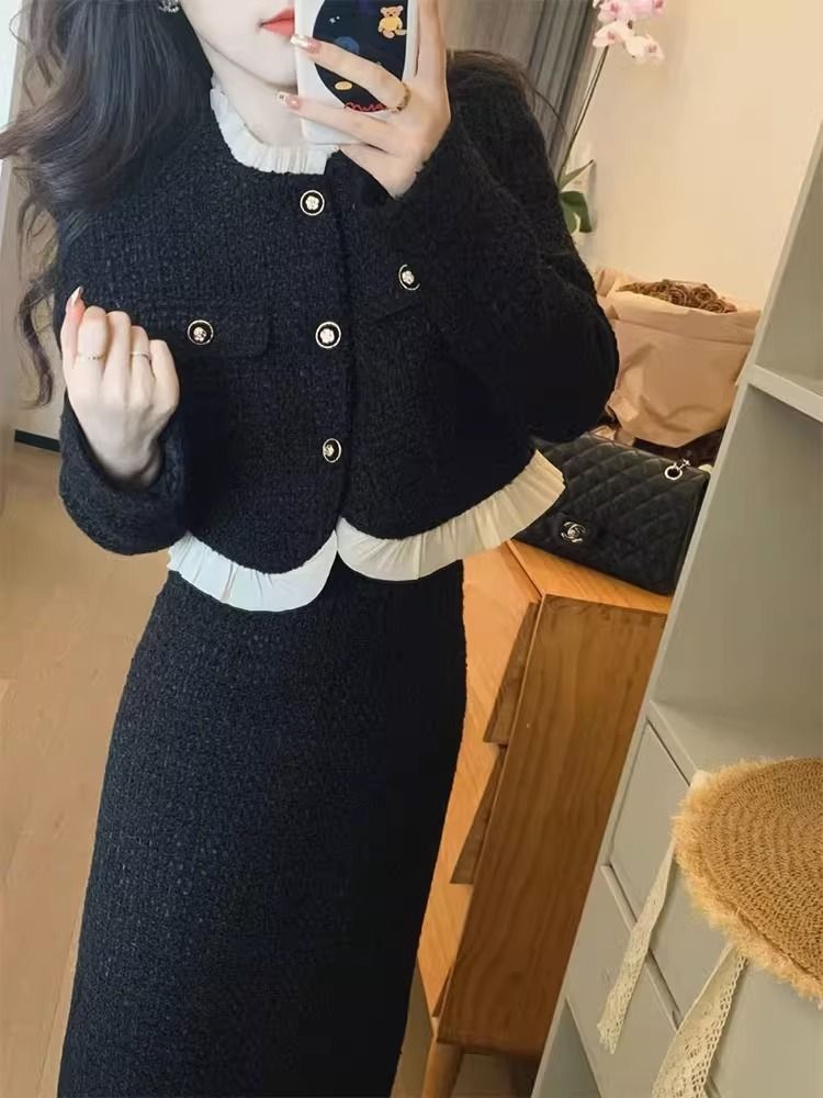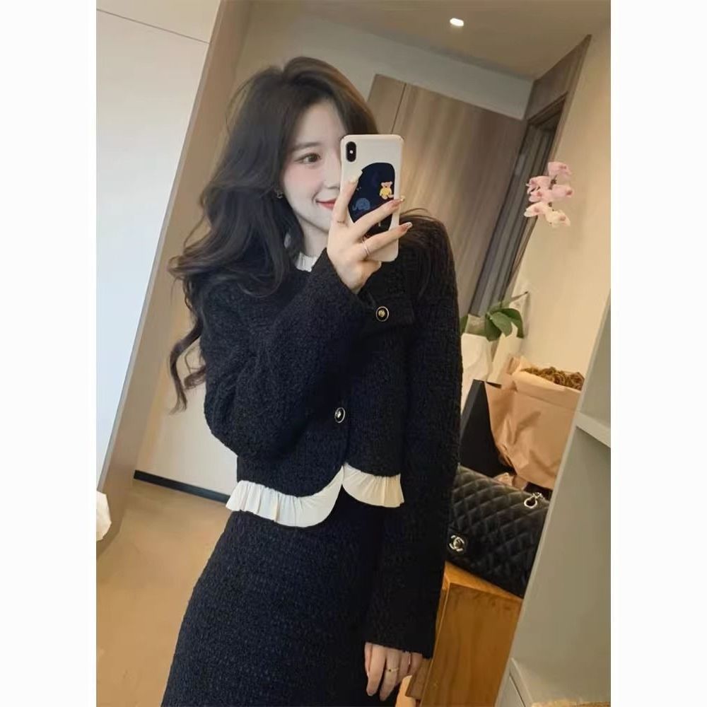 韩系复古时尚气质显瘦小众高级感冷淡小香风黑色连衣裙子加绒套装