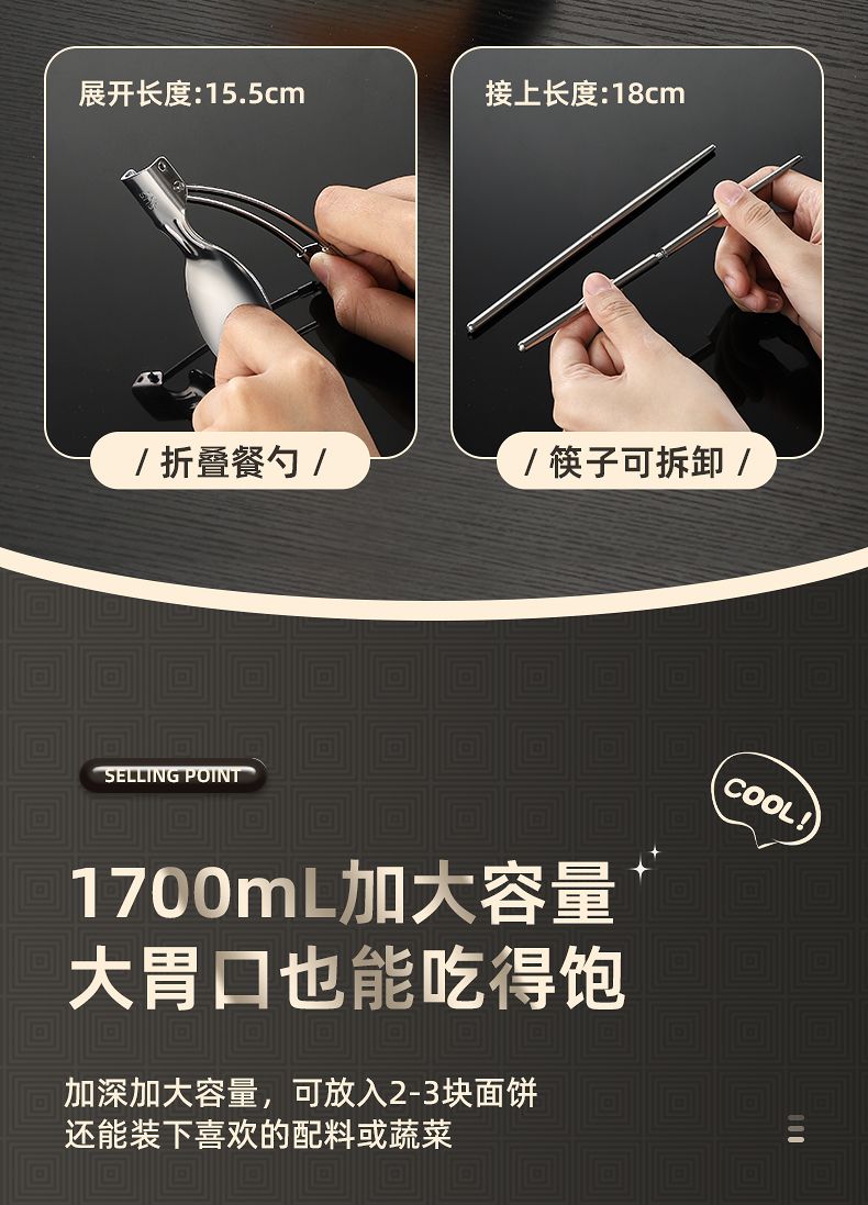 | 1700ml with lid [with stainless steel folding tableware]](1700ML带盖【配不锈钢折叠餐具】) | USD $5.24 | 999999 piece available |
