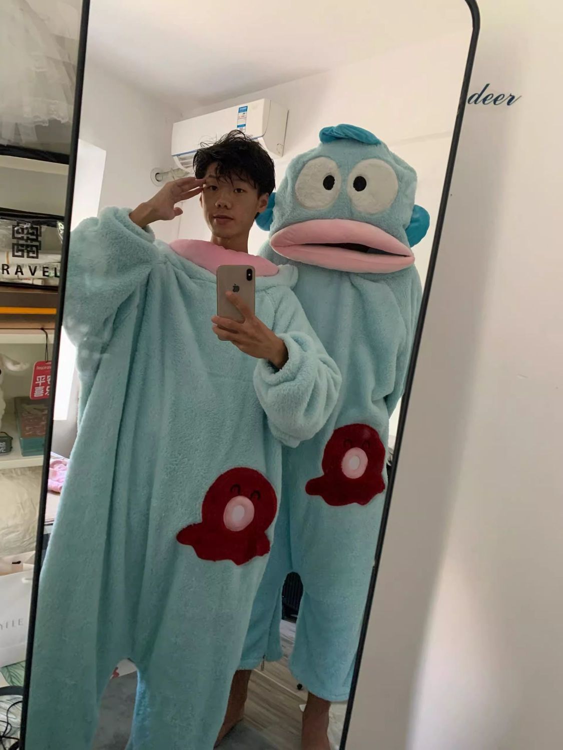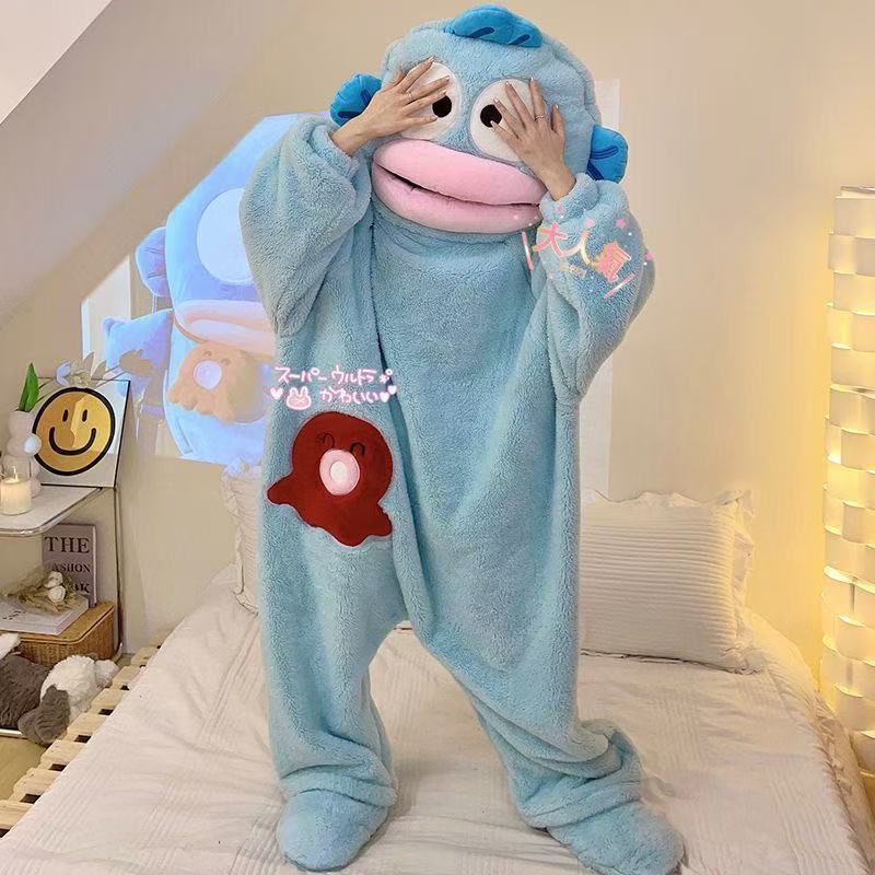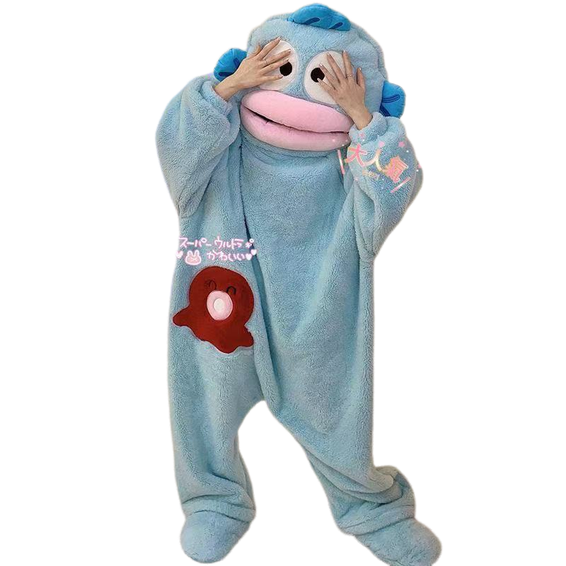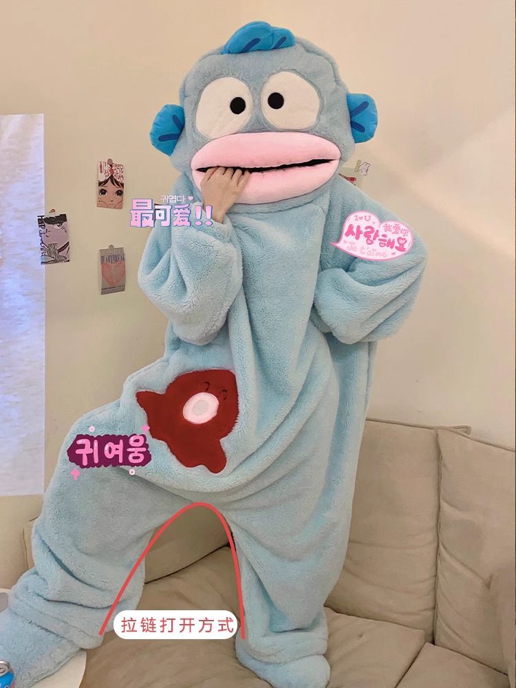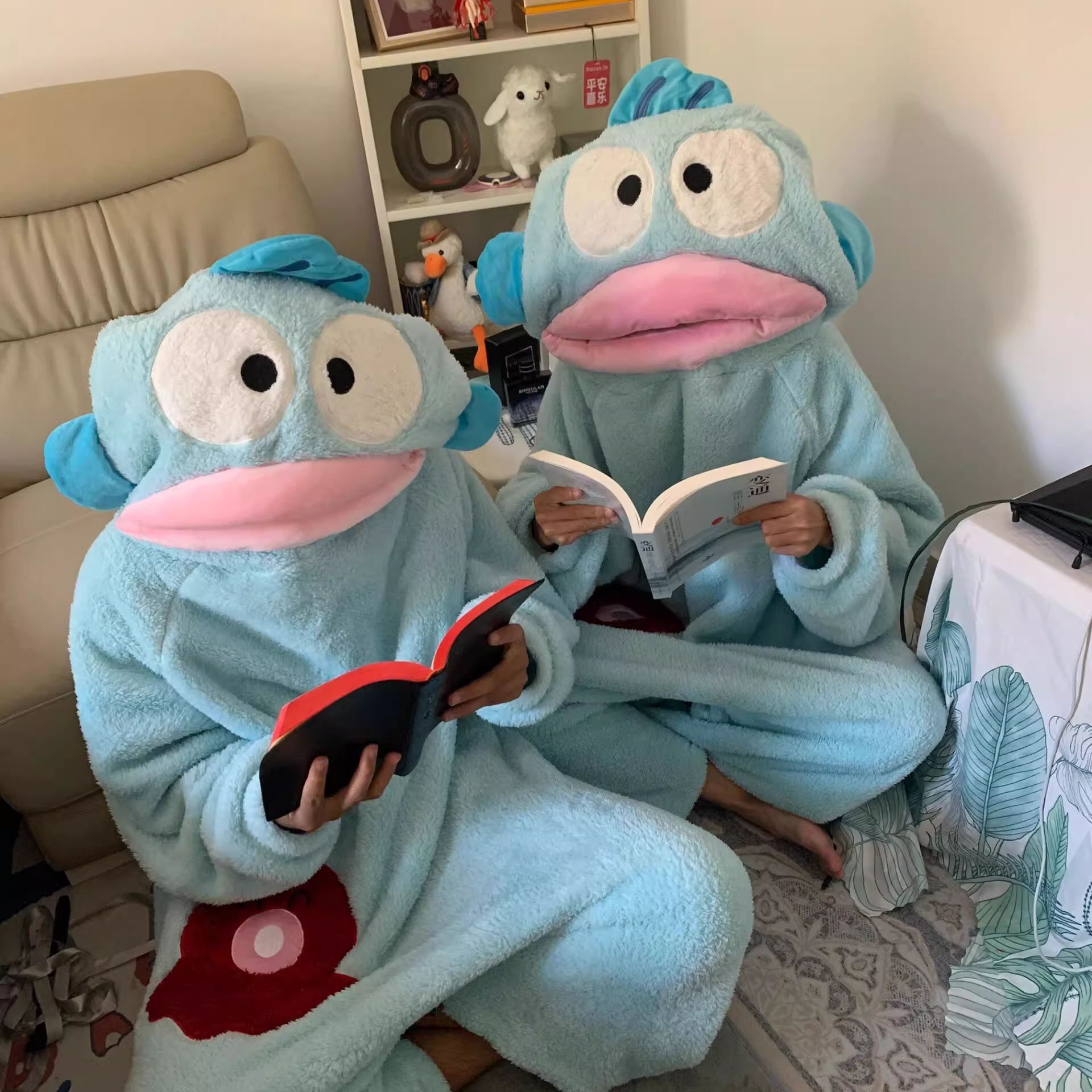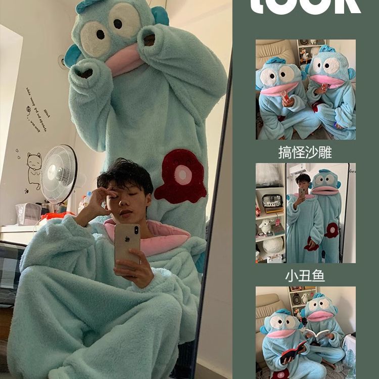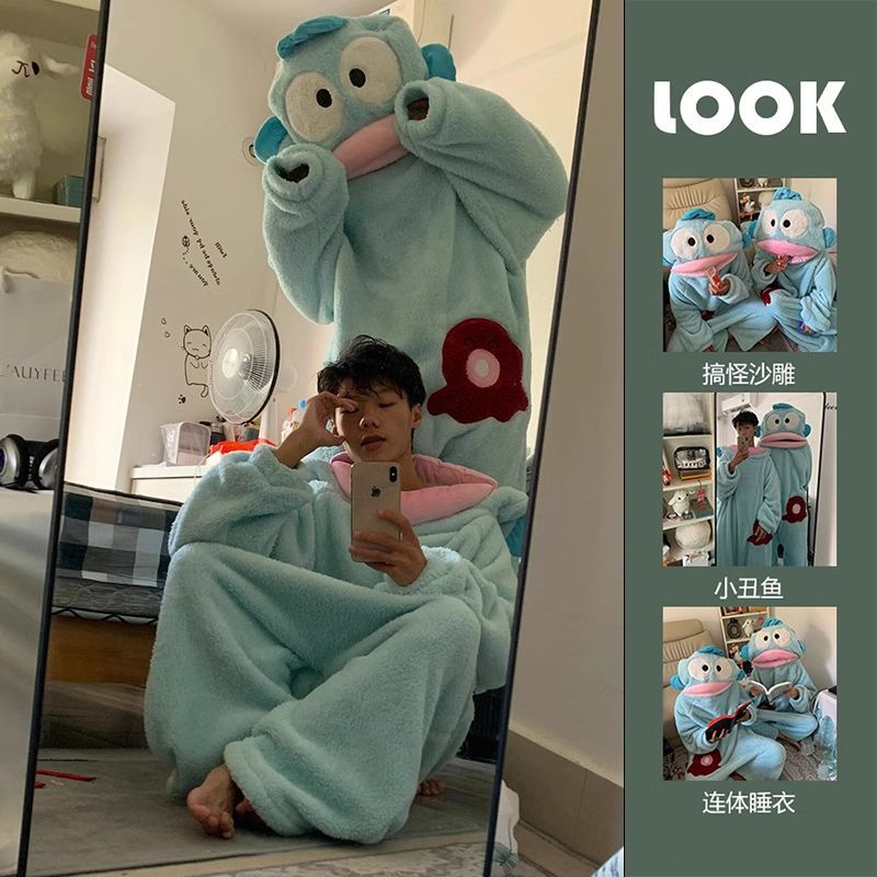 汉顿丑鱼连体睡衣女珊瑚绒加厚保暖鱼嘴睡衣冬季卡通搞怪情侣睡袍