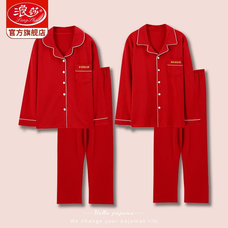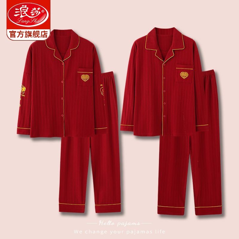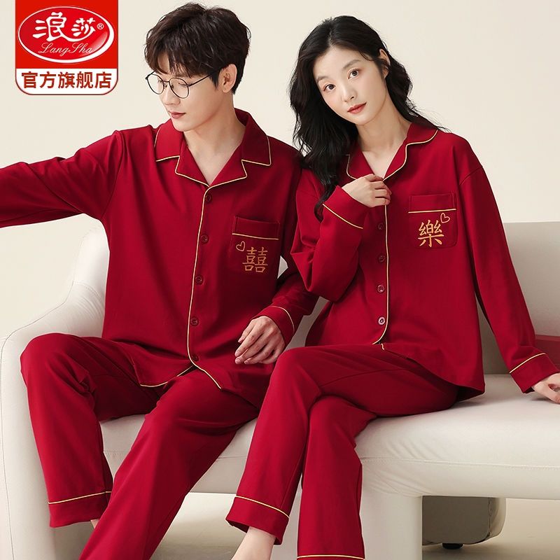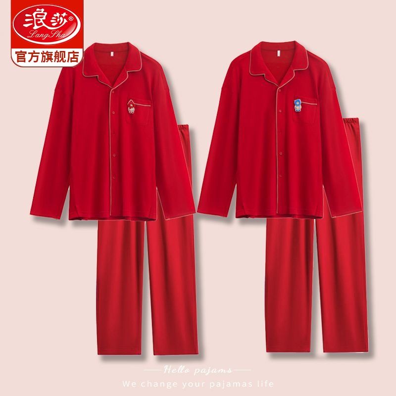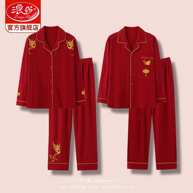 浪莎结婚睡衣情侣春秋款红色纯棉新婚一男一女本命年家居服套装冬