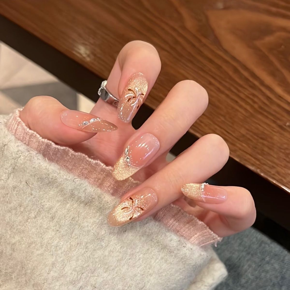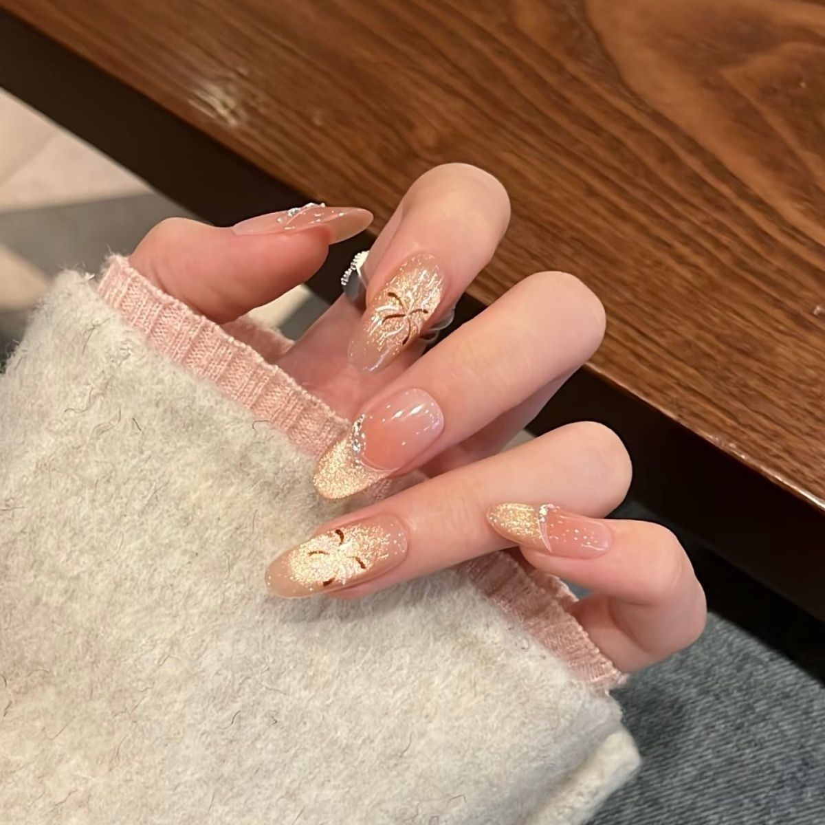 璀璨烟花纯手工美甲气质显白春夏气质金色猫眼爆闪手绘穿戴甲