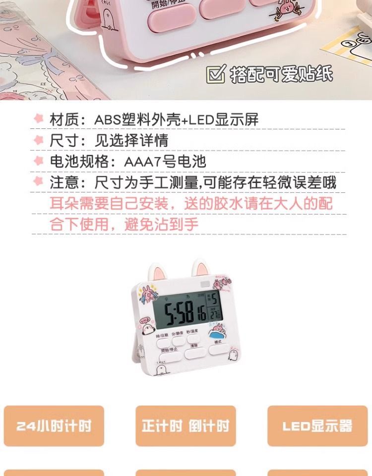 | pink second generation [timing + mute + clock] cat ear + sticker + battery(粉色二代【计时+静音+时钟】猫耳+贴纸+电池) | USD $2.58 | 999999 piece available |
