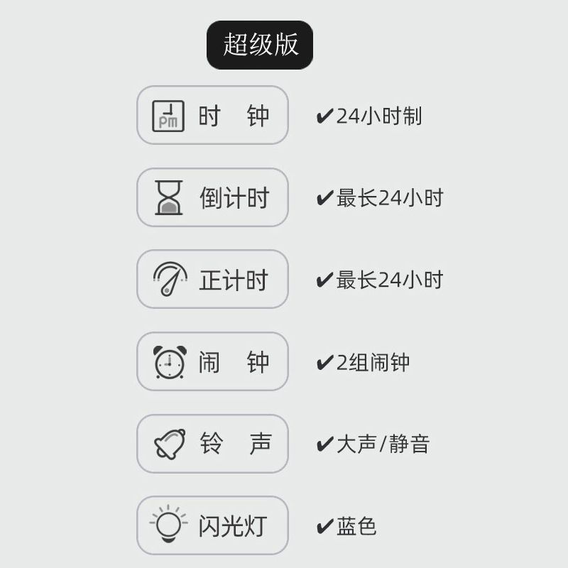 | 2 large super versions + battery + clock mute + flashing light(2个大型超级版+电池+时钟静音+闪灯) | USD $4.18 | 999999 piece available |