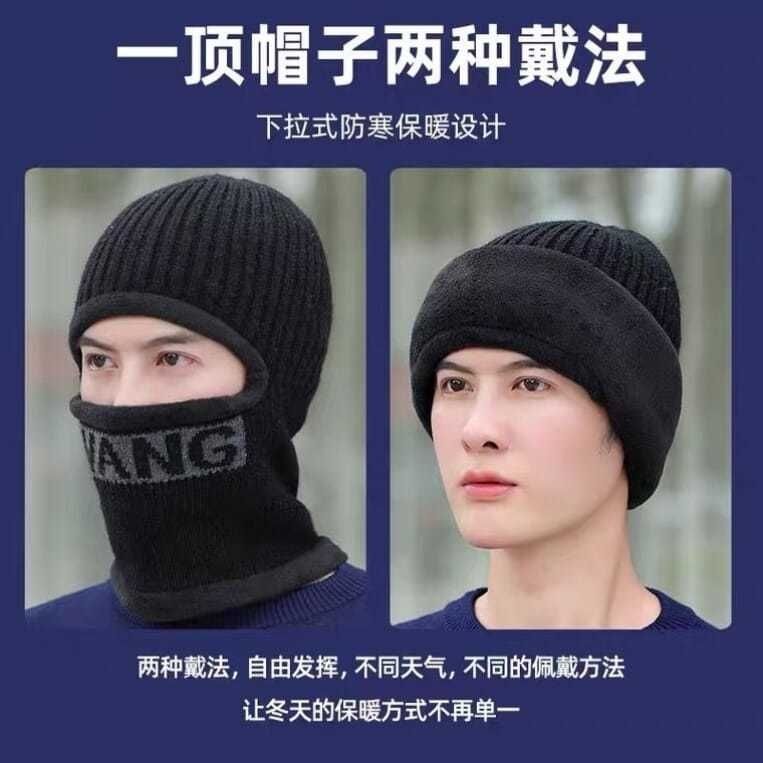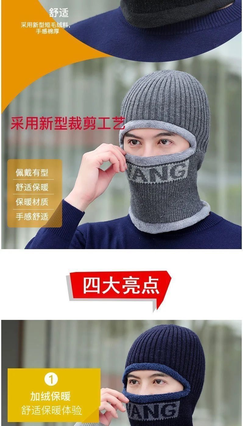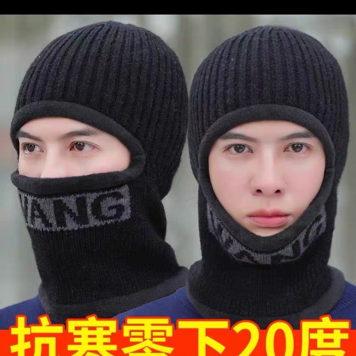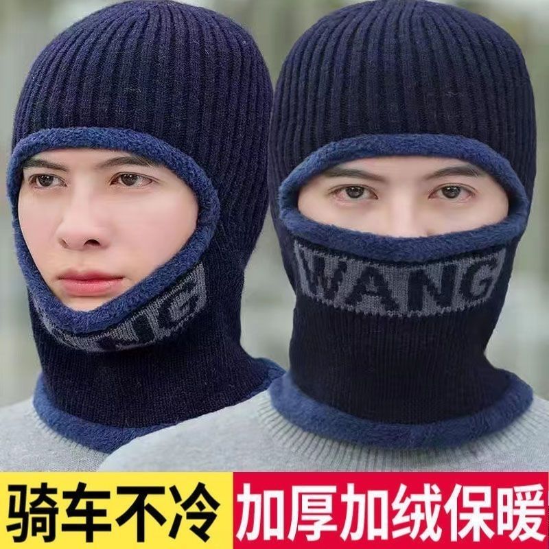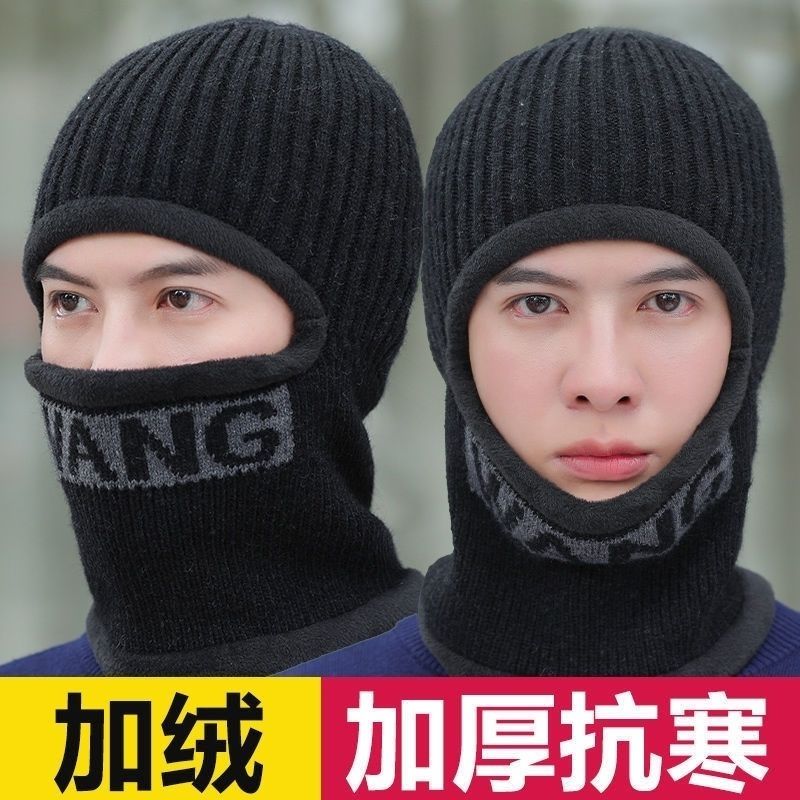 冬季男帽子一体毛线帽加绒加厚保暖套头骑车护耳防风针织帽