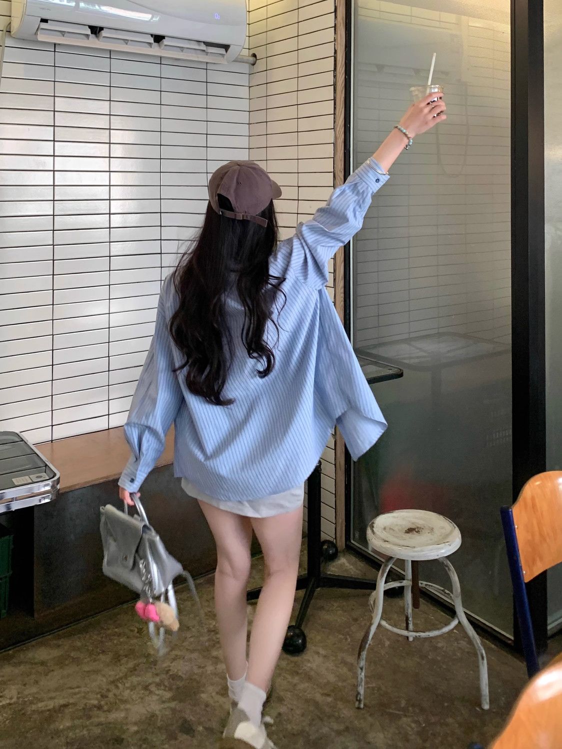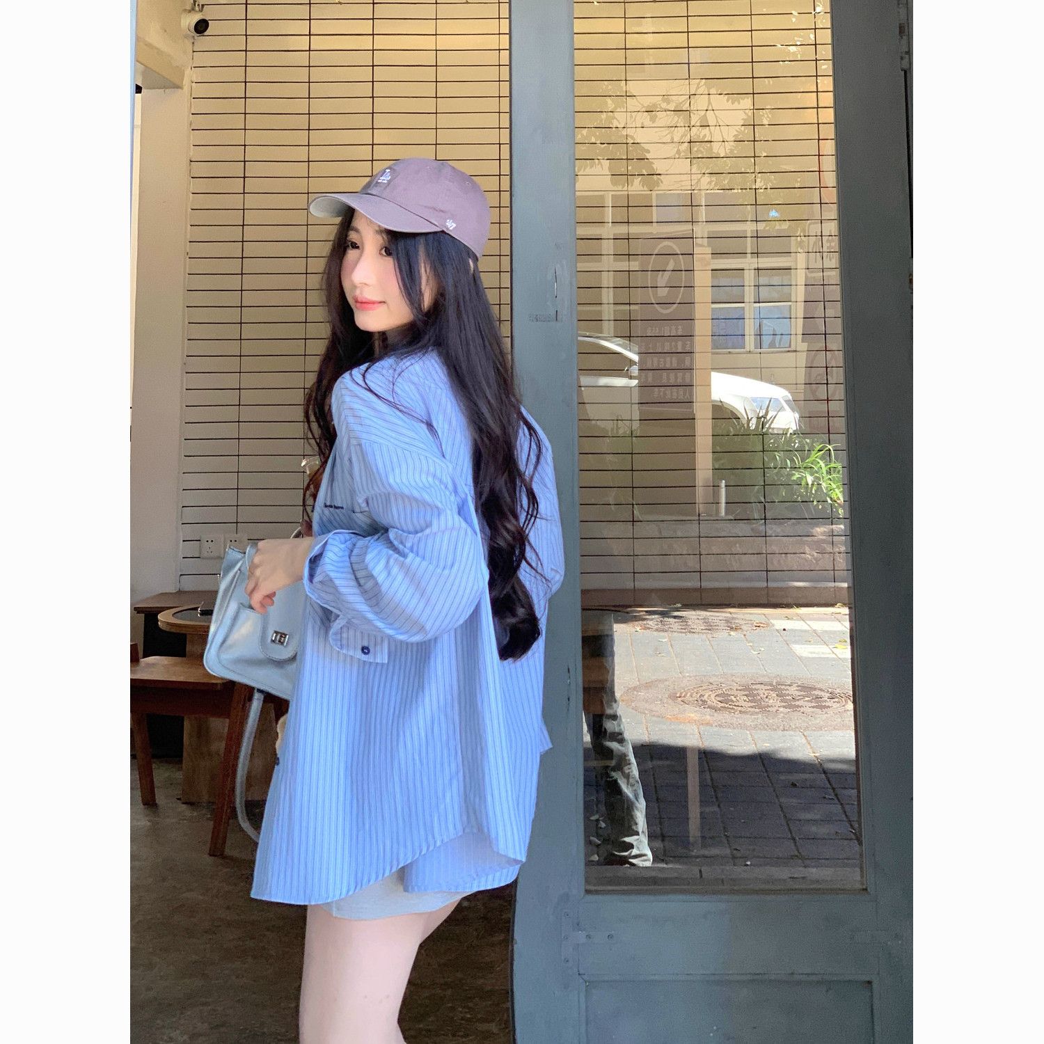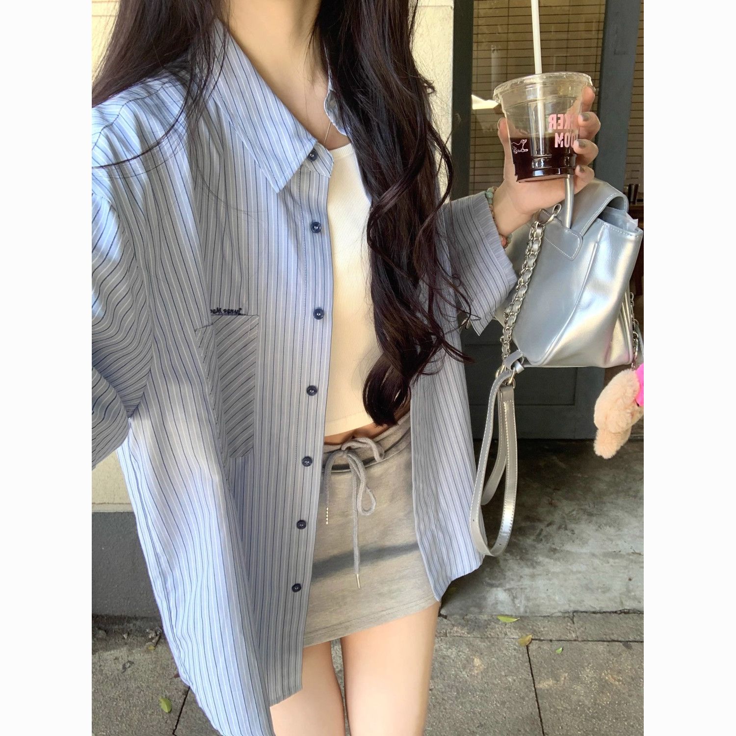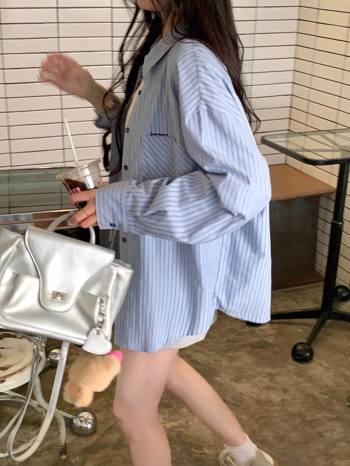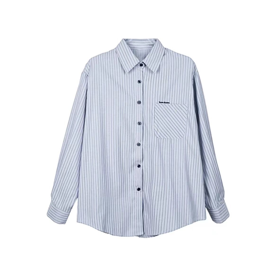 蓝色条纹衬衫外套设计秋季宽松新款长袖刺绣休闲慵懒防晒衬衣上衣