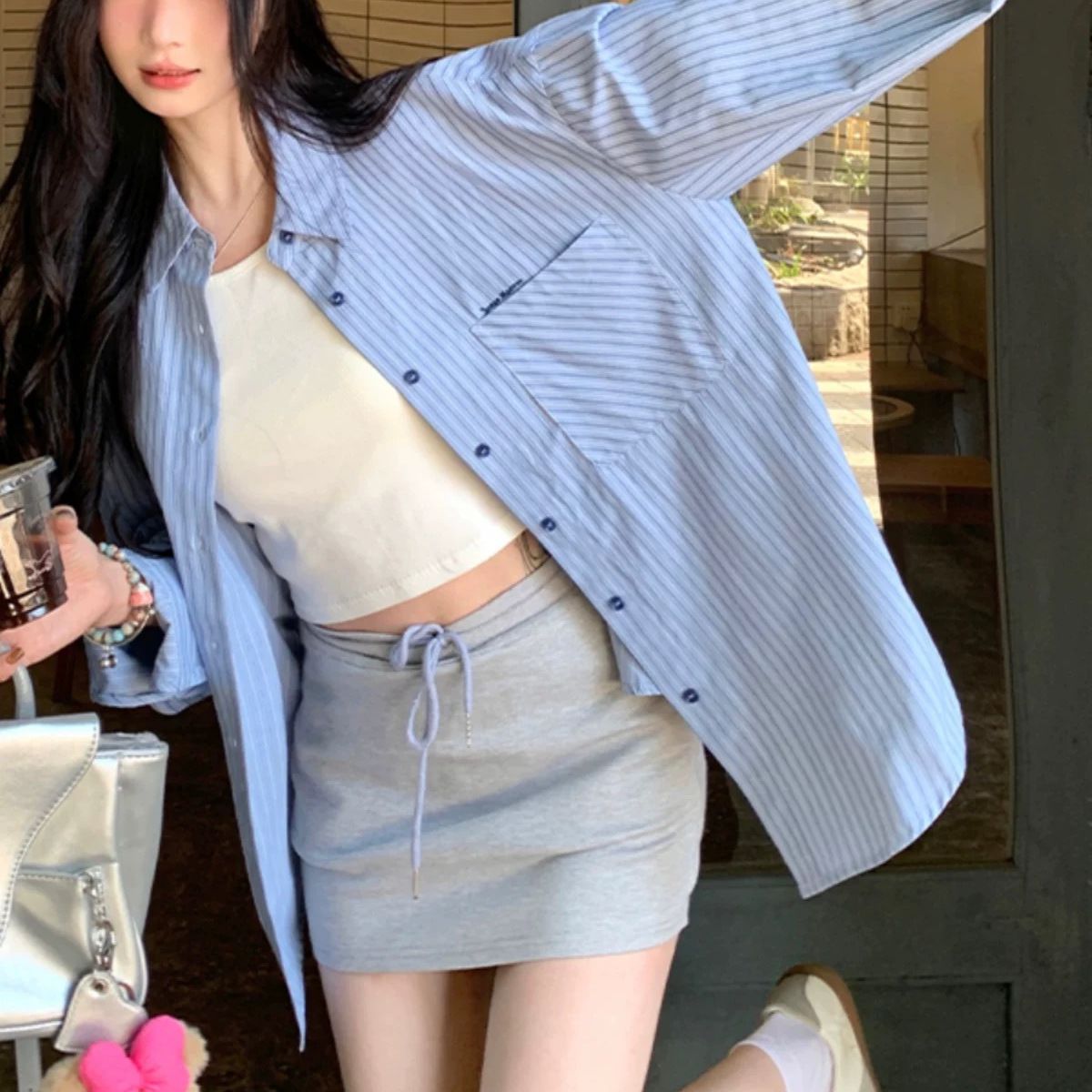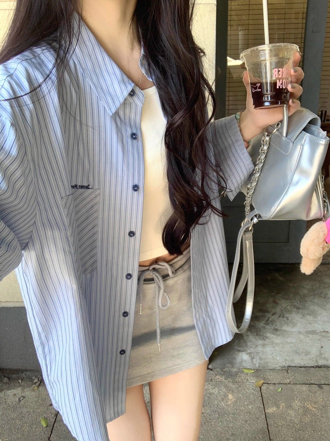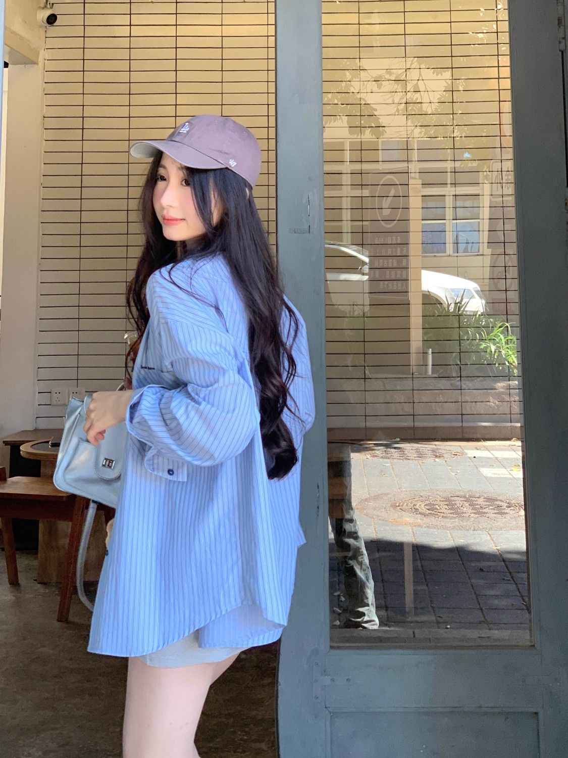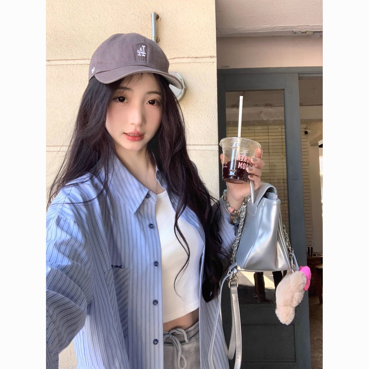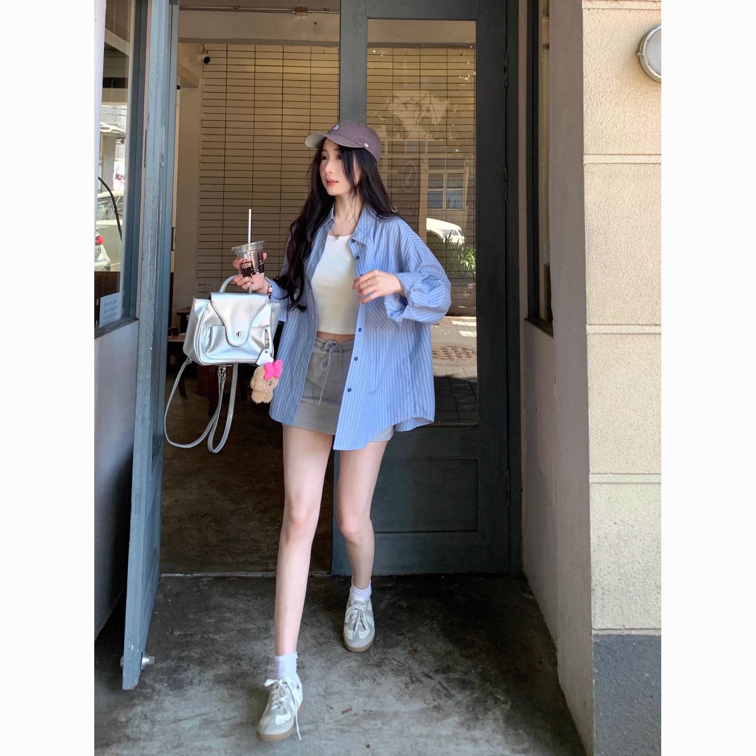 蓝色条纹衬衫外套设计秋季宽松新款长袖刺绣休闲慵懒防晒衬衣上衣
