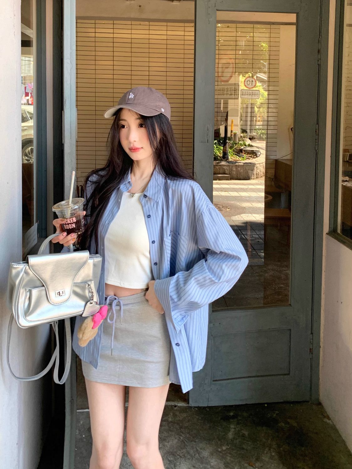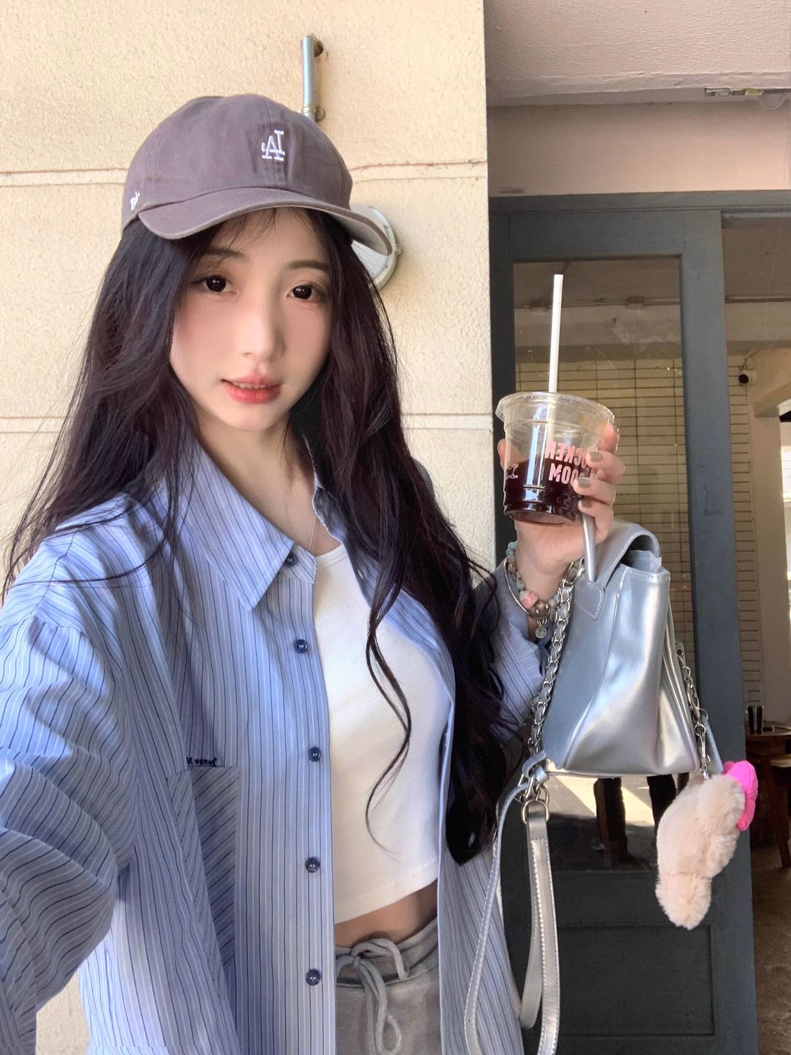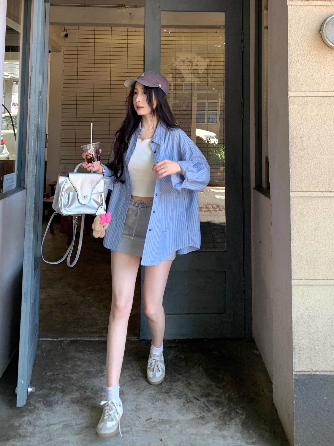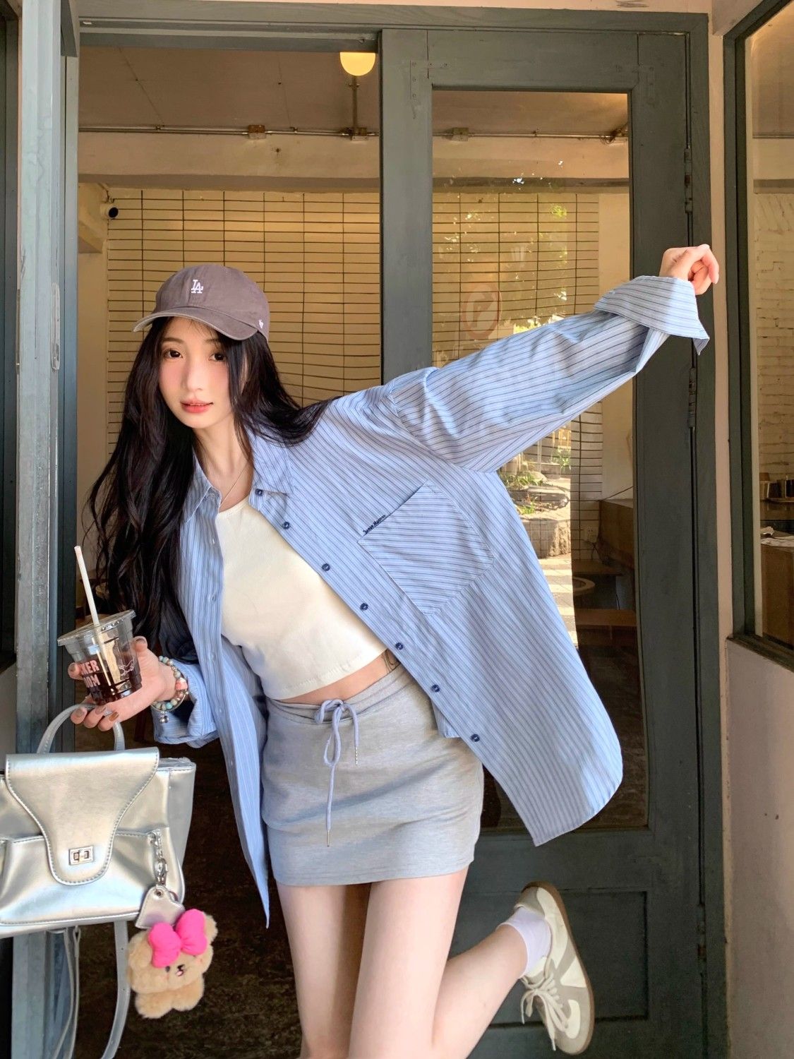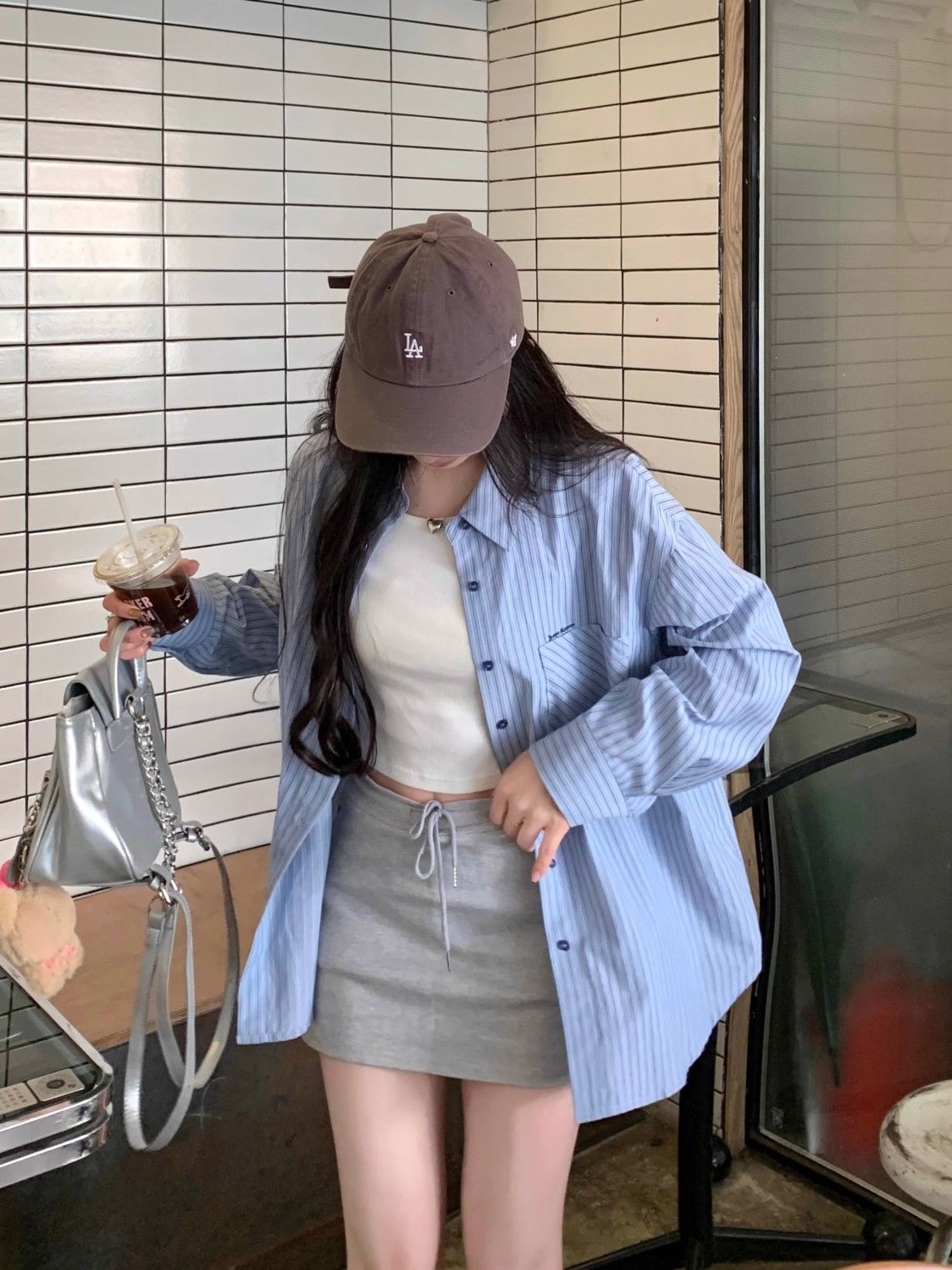 蓝色条纹衬衫外套设计秋季宽松新款长袖刺绣休闲慵懒防晒衬衣上衣
