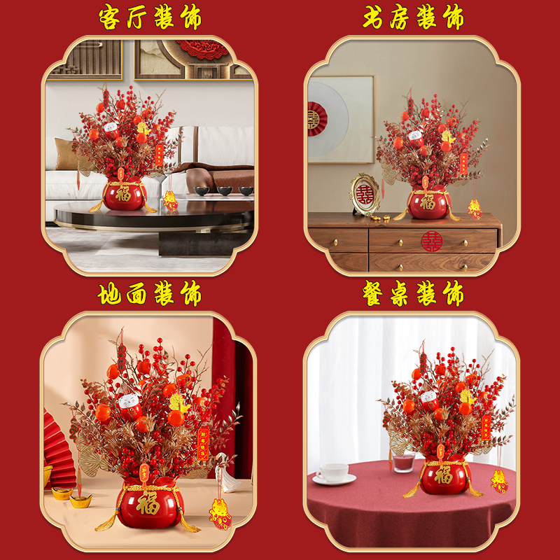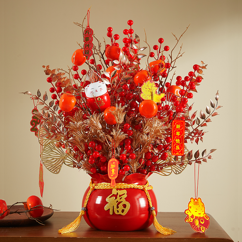 年宵花福桶发财果摆件过年乔迁之喜装饰用品新居布置红果仿真花