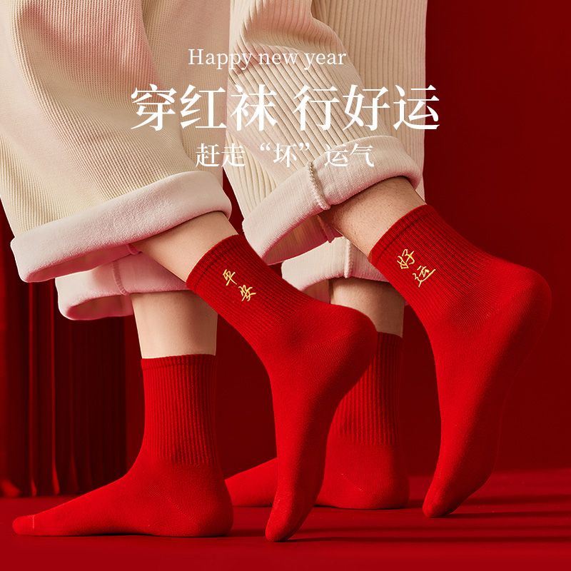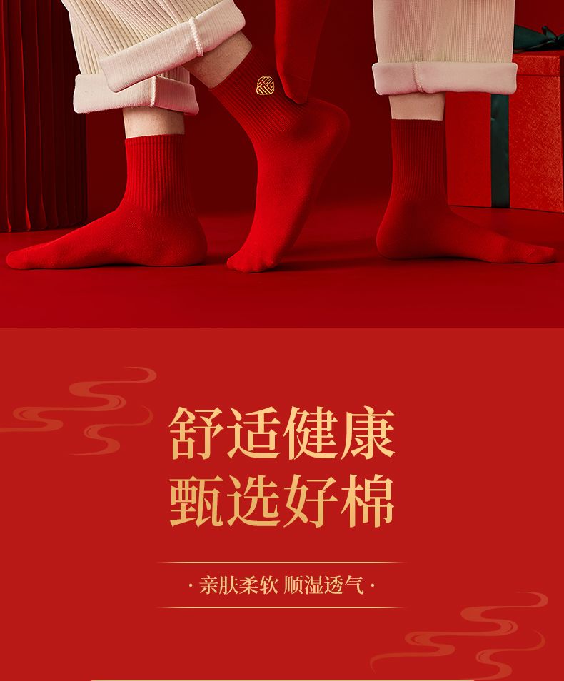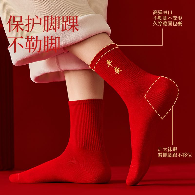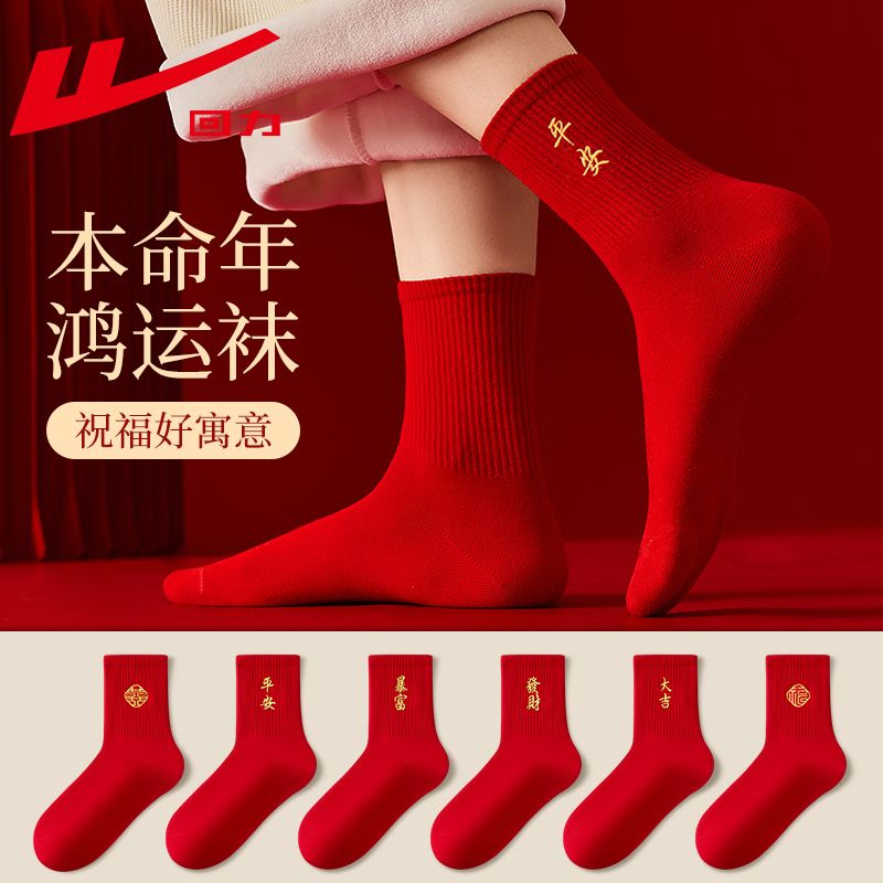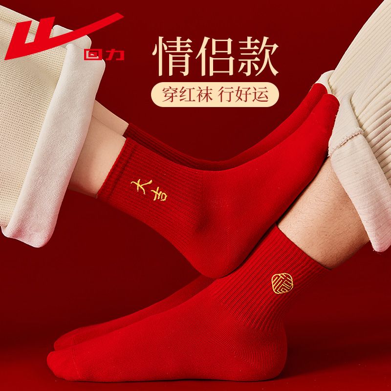 回力红色中筒袜100%纯棉本命年结婚礼物蛇年保暖秋冬季新款红袜子