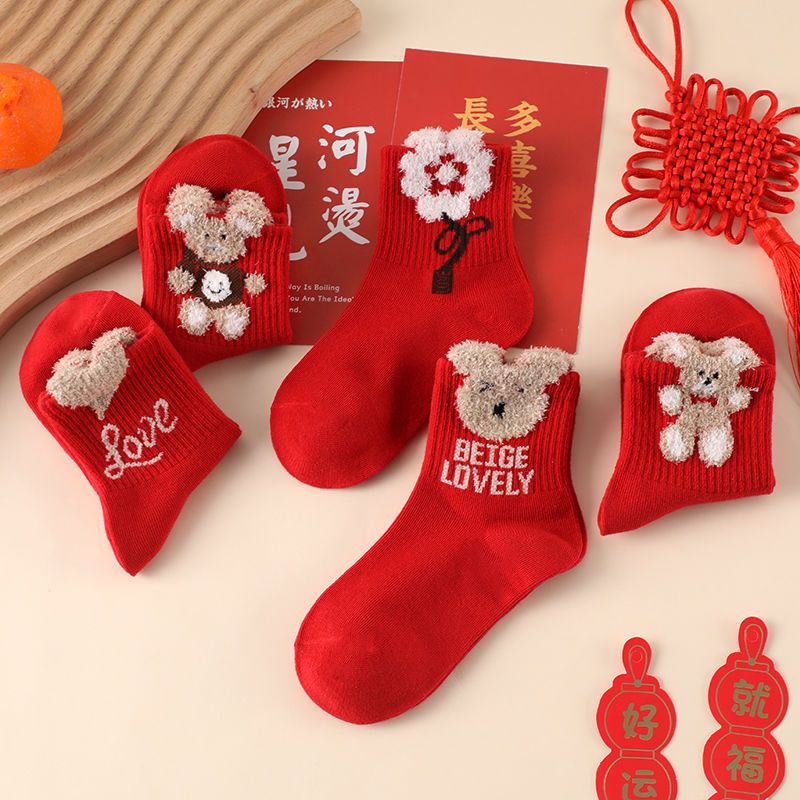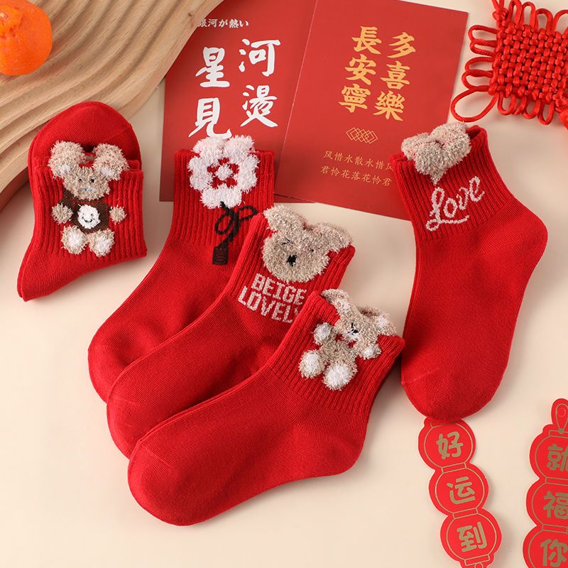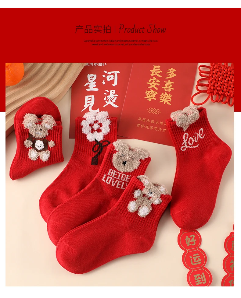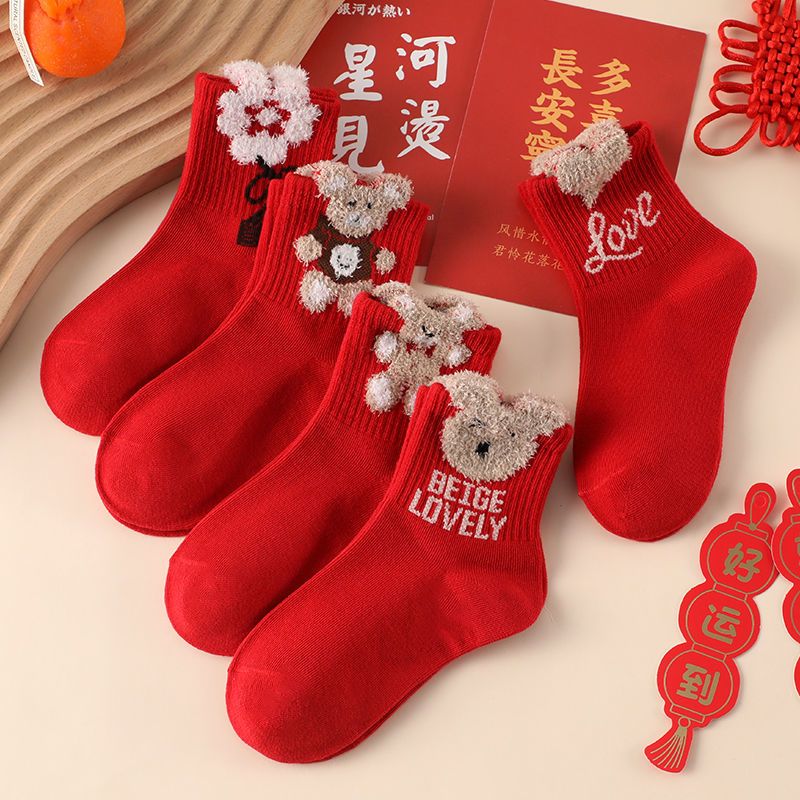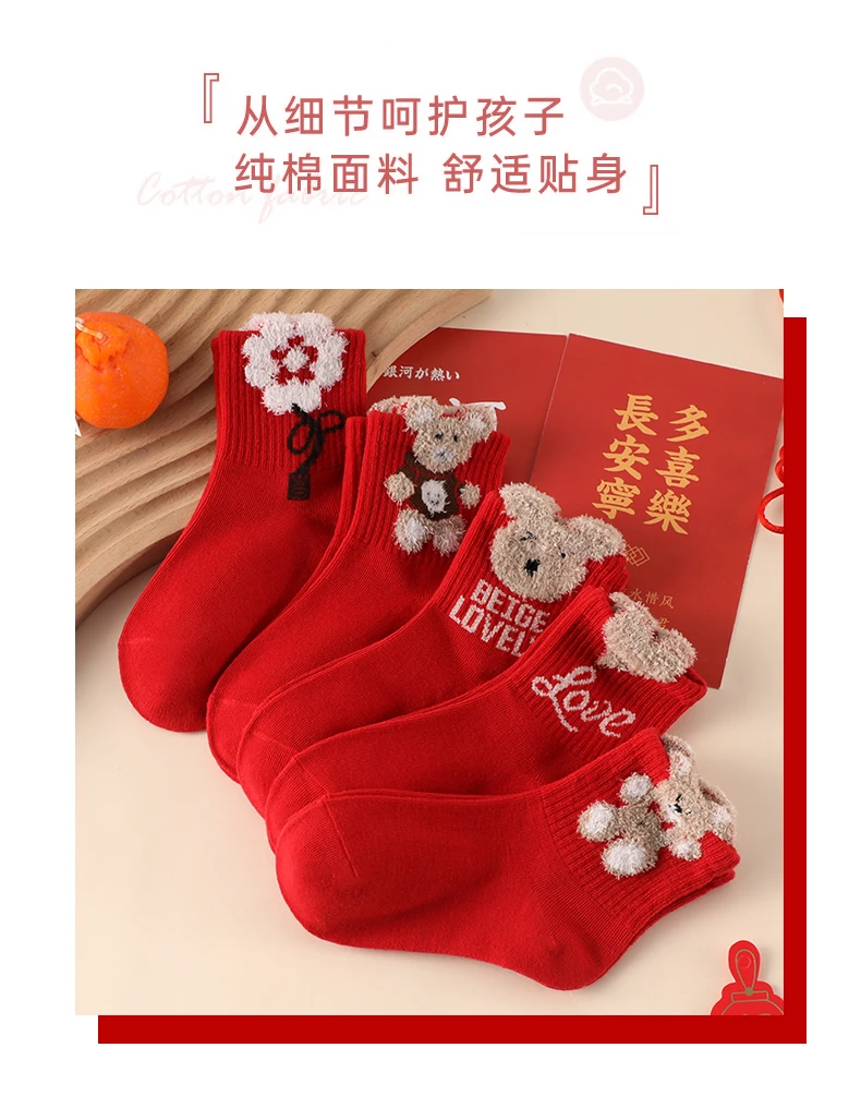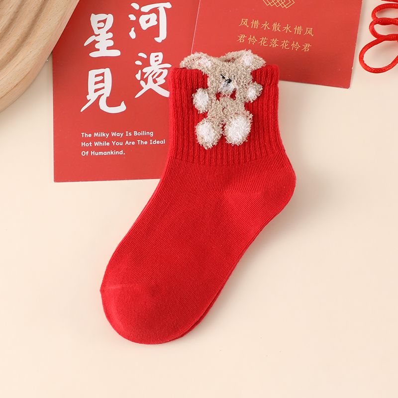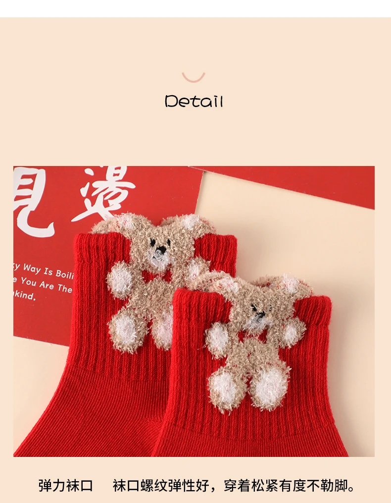 儿童红袜子纯棉新年袜秋冬季羽毛纱本命年女童时尚卡通小熊中筒袜