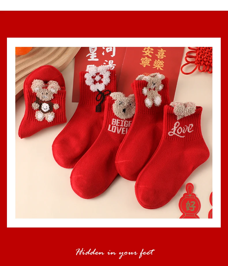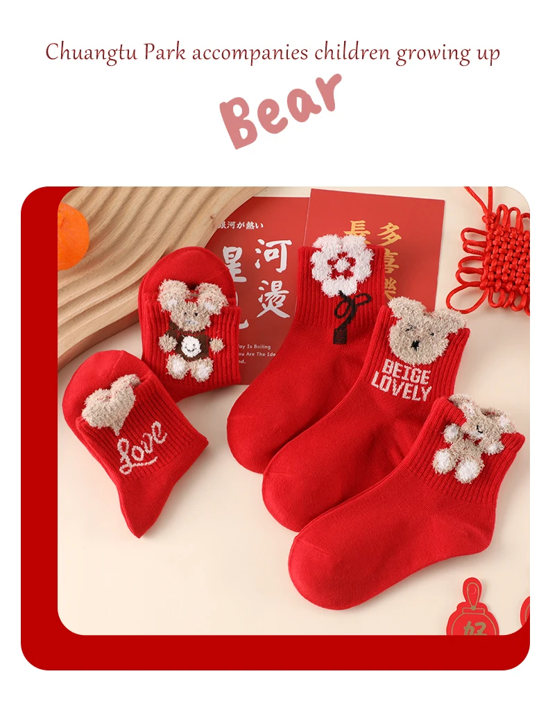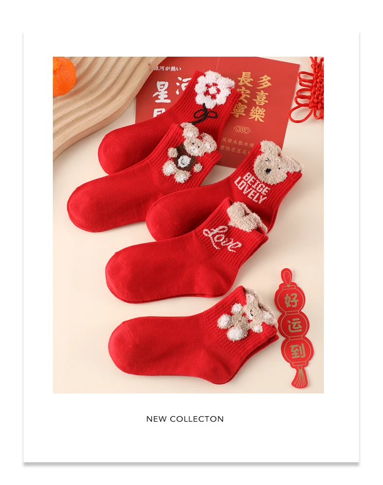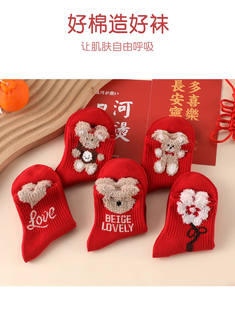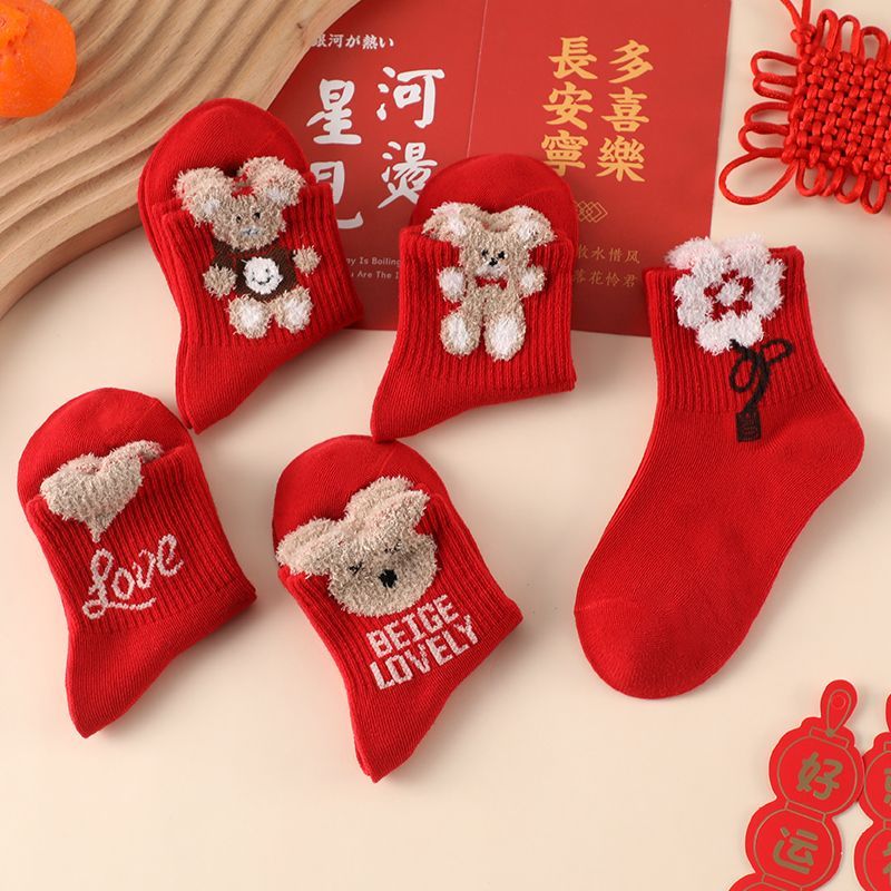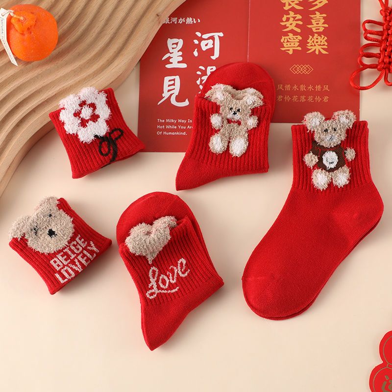 儿童红袜子纯棉新年袜秋冬季羽毛纱本命年女童时尚卡通小熊中筒袜
