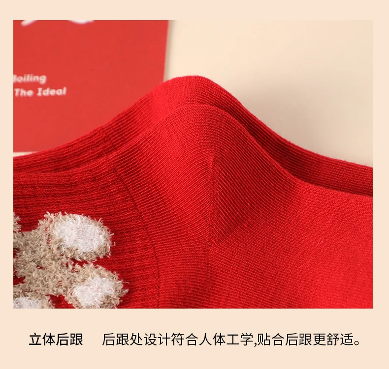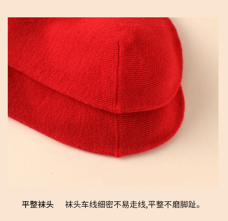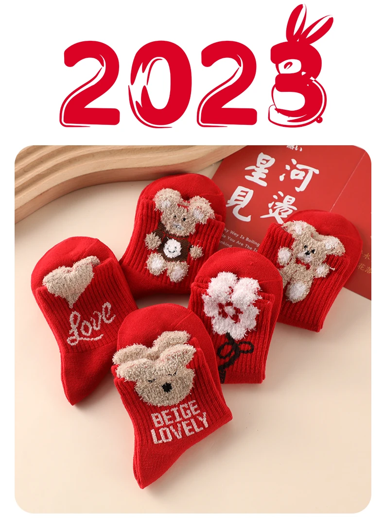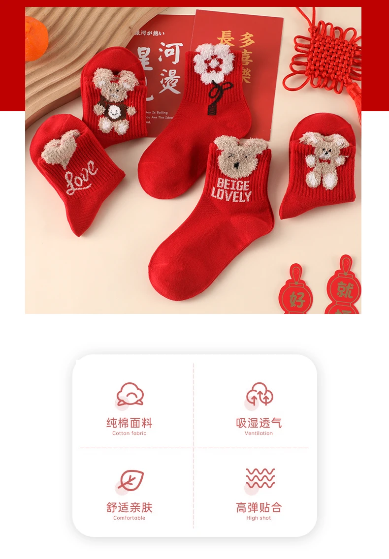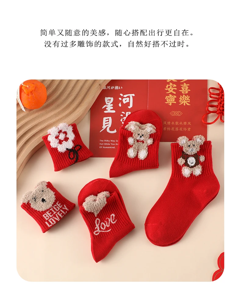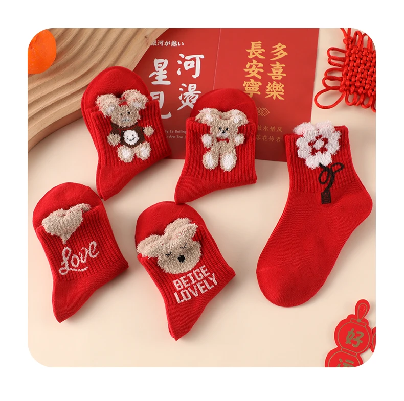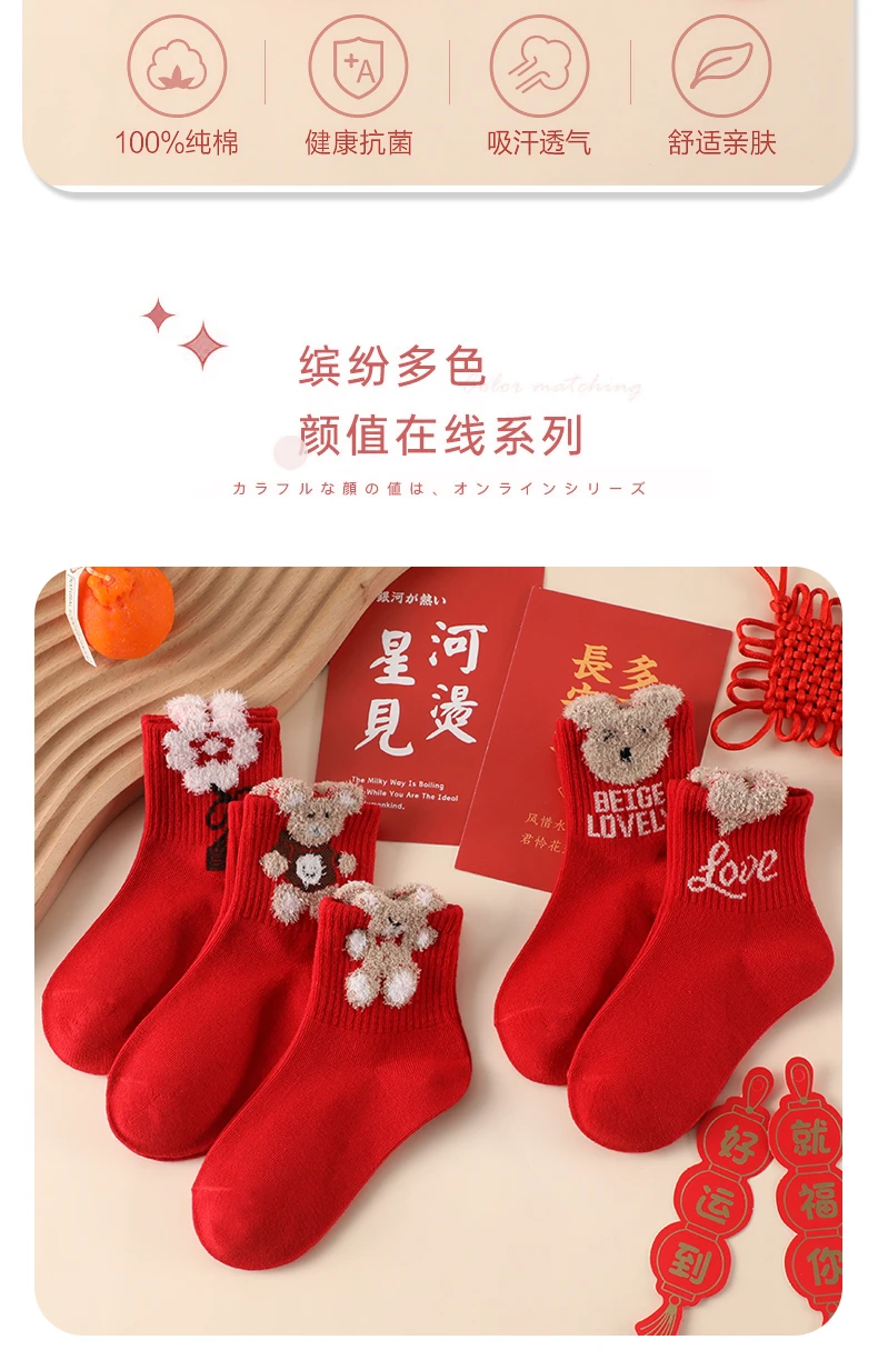 儿童红袜子纯棉新年袜秋冬季羽毛纱本命年女童时尚卡通小熊中筒袜
